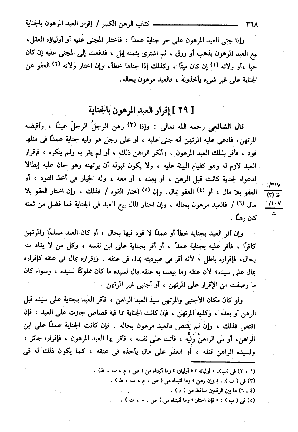قَالَ الشَّافِعِيُّ : رحمه الله تعالى : وَإِنْ رَهَنَ الرَّجُلُ الرَّجُلَ عَبْدًا وَأَقْبَضَهُ الْمُرْتَهِنَ فَادَّعَى عَلَيْهِ الْمُرْتَهِنُ أَنَّهُ جَنَى عَلَيْهِ أَوْ عَلَى رَجُلٍ هُوَ وَلِيُّهُ جِنَايَةً عَمْدًا فِي مِثْلِهَا قَوَدٌ فَأَقَرَّ بِذَلِكَ الْعَبْدُ الْمَرْهُونُ وَأَنْكَرَ الرَّاهِنُ ذَلِكَ أَوْ لَمْ يُقِرَّ بِهِ , وَلَمْ يُنْكِرْهُ فَإِقْرَارُ الْعَبْدِ لاَزِمٌ لَهُ وَهُوَ كَقِيَامِ الْبَيِّنَةِ عَلَيْهِ , وَلاَ يَكُونُ قَبُولُهُ أَنْ يَرْتَهِنَهُ وَهُوَ جَانٍ عَلَيْهِ إبْطَالاً لِدَعْوَاهُ لِجِنَايَةٍ كَانَتْ قَبْلَ الرَّهْنِ أَوْ بَعْدَهُ أَوْ مَعَهُ , وَلَهُ الْخِيَارُ فِي أَخْذِ الْقَوَدِ أَوْ الْعَفْوِ بِلاَ مَالٍ أَوْ الْعَفْوُ بِمَالٍ فَإِنْ اخْتَارَ الْقَوَدَ فَذَلِكَ , وَإِنْ اخْتَارَ الْعَفْوَ بِلاَ مَالٍ فَالْعَبْدُ مَرْهُونٌ بِحَالِهِ , وَإِنْ اخْتَارَ الْمَالَ بِيعَ الْعَبْدُ فِي الْجِنَايَةِ فَمَا فَضَلَ مِنْ ثَمَنِهِ كَانَ رَهْنًا . وَإِنْ أَقَرَّ الْعَبْدُ بِجِنَايَةٍ خَطَأً أَوْ عَمْدًا لاَ قَوَدَ فِيهَا بِحَالٍ أَوْ كَانَ الْعَبْدُ مُسْلِمًا وَالْمُرْتَهِنُ كَافِرًا فَأَقَرَّ عَلَيْهِ بِجِنَايَةٍ عَمْدًا أَوْ أَقَرَّ بِجِنَايَةٍ عَلَى ابْنِ نَفْسِهِ وَكَّلَ مَنْ لاَ يُقَادُ مِنْهُ بِحَالٍ فَإِقْرَارُهُ بَاطِلٌ ; لِأَنَّهُ أَقَرَّ فِي عُبُودِيَّتِهِ بِمَالٍ فِي عُنُقِهِ , وَإِقْرَارُهُ بِمَالٍ فِي عُنُقِهِ كَإِقْرَارِهِ بِمَالٍ عَلَى سَيِّدِهِ ; لِأَنَّ عِتْقَهُ وَمَا بِيعَتْ بِهِ عِتْقُهُ مَالٌ لِسَيِّدِهِ مَا كَانَ مَمْلُوكًا لِسَيِّدِهِ وَسَوَاءٌ كَانَ مَا وَصَفْت مِنْ الْإِقْرَارِ عَلَى الْمُرْتَهِنِ أَوْ أَجْنَبِيٍّ غَيْرِ الْمُرْتَهِنِ . وَلَوْ كَانَ مَكَانَ الْأَجْنَبِيِّ وَالْمُرْتَهِنِ سَيِّدُ الْعَبْدِ الرَّاهِنِ فَأَقَرَّ الْعَبْدُ بِجِنَايَةٍ عَلَى سَيِّدِهِ قَبْلَ الرَّهْنِ أَوْ بَعْدَهُ , وَكَذَّبَهُ الْمُرْتَهِنُ فَإِنْ كَانَتْ الْجِنَايَةُ مِمَّا فِيهِ قِصَاصٌ جَازَتْ عَلَى الْعَبْدِ فَإِنْ اُقْتُصَّ فَذَلِكَ , وَإِنْ لَمْ يُقْتَصَّ فَالْعَبْدُ مَرْهُونٌ بِحَالِهِ . فَإِنْ كَانَتْ الْجِنَايَةُ عَمْدًا عَلَى ابْنِ الرَّاهِنِ أَوْ مِنْ الرَّاهِنِ وَلِيَّهُ فَأَتَتْ عَلَى نَفْسِهِ فَأَقَرَّ بِهَا الْعَبْدُ الْمَرْهُونُ فَإِقْرَارُهُ جَائِزٌ وَلِسَيِّدِهِ الرَّاهِنِ قَتْلُهُ أَوْ الْعَفْوُ عَلَى مَالٍ يَأْخُذُهُ فِي عُنُقِهِ كَمَا يَكُونُ ذَلِكَ لَهُ فِي@