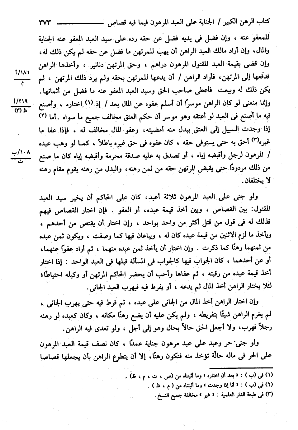 وَلَوْ جَنَى عَلَى الْعَبْدِ الْمَرْهُونِ ثَلاَثَةُ أَعْبُدَ كَانَ عَلَى الْحَاكِمِ أَنْ يُخَيِّرَ سَيِّدَ الْعَبْدِ الْمَقْتُولِ بَيْنَ الْقِصَاصِ وَبَيْنَ أَخْذِ قِيمَةِ عَبْدِهِ أَوْ الْعَفْوِ فَإِنْ اخْتَارَ الْقِصَاصَ فِيهِمْ فَذَلِكَ لَهُ فِي قَوْلِ مَنْ قَتَلَ أَكْثَرَ مِنْ وَاحِدٍ بِوَاحِدٍ , وَإِنْ اخْتَارَ أَنْ يَقْتَصَّ مِنْ أَحَدِهِمْ وَيَأْخُذَ مَا لَزِمَ الِاثْنَيْنِ مِنْ قِيمَةِ عَبْدِهِ كَانَ لَهُ وَيُبَاعَانِ فِيهَا كَمَا وَصَفْت وَيَكُونُ ثَمَنُ عَبْدِهِ مِنْ ثَمَنِهِمَا رَهْنًا كَمَا ذَكَرْت , وَإِنْ اخْتَارَ أَنْ يَأْخُذَ ثَمَنَ عَبْدِهِ مِنْهُمَا ثُمَّ أَرَادَ عَفْوًا عَنْهُمَا أَوْ عَنْ أَحَدِهِمَا كَانَ الْجَوَابُ فِيهَا كَالْجَوَابِ فِي الْمَسْأَلَةِ قَبْلَهَا فِي الْعَبْدِ الْوَاحِدِ إذَا اخْتَارَ أَخْذَ قِيمَةِ عَبْدِهِ مِنْ رَقَبَتِهِ ثُمَّ عَفَاهَا وَأُحِبُّ أَنْ يُحْضِرَ الْحَاكِمُ الْمُرْتَهِنَ أَوْ وَكِيلَهُ احْتِيَاطًا لِئَلَّا يَخْتَارَ الرَّاهِنُ أَخْذَ الْمَالِ ثُمَّ يَدَعُهُ أَوْ يُفَرِّطُ فِيهِ فَيَهْرُبُ الْعَبْدُ الْجَانِي . وَإِنْ اخْتَارَ الرَّاهِنُ أَخْذَ الْمَالِ مِنْ الْجَانِي عَلَى عَبْدِهِ ثُمَّ فَرَّطَ فِيهِ حَتَّى يَهْرُبَ الْجَانِي لَمْ يَغْرَمْ الرَّاهِنُ شَيْئًا بِتَفْرِيطِهِ , وَلَمْ يَكُنْ عَلَيْهِ أَنْ يَضَعَ رَهْنًا مَكَانَهُ , وَكَانَ كَعَبْدِهِ لَوْ رَهَنَهُ رَجُلاً فَهَرَبَ , وَلاَ أَجْعَلُ الْحَقَّ حَالاً بِحَالٍ وَهُوَ إلَى أَجَلٍ , وَلَوْ تَعَدَّى فِيهِ الرَّاهِنُ .