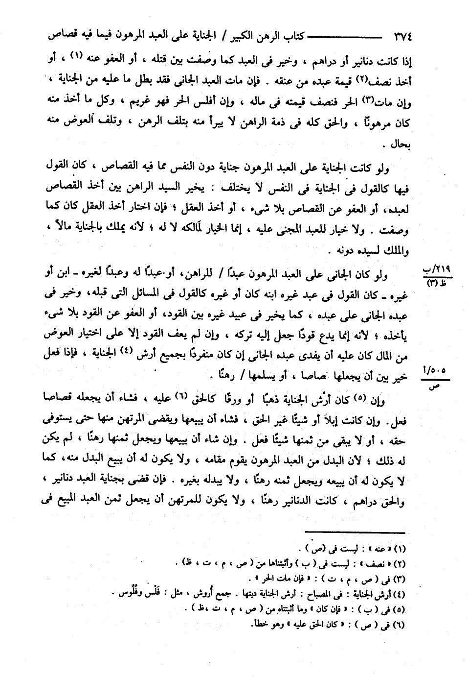 إذَا كَانَتْ دَنَانِيرَ أَوْ دَرَاهِمَ وَخُيِّرَ فِي الْعَبْدِ كَمَا وَصَفْت بَيْنَ قَتْلِهِ أَوْ الْعَفْوِ عَنْهُ أَوْ أَخْذِ قِيمَةِ عَبْدِهِ مِنْ عُنُقِهِ فَإِنْ مَاتَ الْعَبْدُ الْجَانِي فَقَدْ بَطَلَ مَا عَلَيْهِ مِنْ الْجِنَايَةِ , وَإِنْ مَاتَ الْحُرُّ فَنِصْفُ قِيمَتِهِ فِي مَالِهِ , وَإِنْ أَفْلَسَ الْحُرُّ فَهُوَ غَرِيمٌ وَكُلُّ مَا أُخِذَ مِنْهُ كَانَ مَرْهُونًا وَالْحَقُّ كُلُّهُ فِي ذِمَّةِ الرَّاهِنِ لاَ يَبْرَأُ مِنْهُ بِتَلَفِ الرَّهْنِ وَتَلَفِ الْعِوَضِ مِنْهُ بِحَالٍ . وَلَوْ كَانَتْ الْجِنَايَةُ عَلَى الْعَبْدِ الْمَرْهُونِ جِنَايَةً دُونَ النَّفْسِ مِمَّا فِيهِ الْقِصَاصِ كَانَ الْقَوْلُ فِيهَا كَالْقَوْلِ فِي الْجِنَايَةِ فِي النَّفْسِ لاَ يَخْتَلِفُ بِتَخْيِيرِ السَّيِّدِ الرَّاهِنَ بَيْنَ أَخْذِ الْقِصَاصِ لِعَبْدِهِ , أَوْ الْعَفْوِ عَنْ الْقِصَاصِ بِلاَ شَيْءٍ أَوْ أَخْذِ الْعَقْلِ فَإِنْ اخْتَارَ أَخْذَ الْعَقْلِ كَانَ كَمَا وَصَفْت , وَلاَ خِيَارَ لِلْعَبْدِ الْمَجْنِيِّ عَلَيْهِ , إنَّمَا الْخِيَارُ لِمَالِكِهِ لاَ لَهُ ; لِأَنَّهُ يَمْلِكُ بِالْجِنَايَةِ مَالاً وَالْمِلْكُ لِسَيِّدِهِ دُونَهُ . وَلَوْ كَانَ الْجَانِي عَلَى الْعَبْدِ الْمَرْهُونِ عَبْدًا لِلرَّاهِنِ أَوْ عَبْدًا لَهُ وَعَبْدًا لِغَيْرِهِ ابْنٌ أَوْ غَيْرُهُ كَانَ الْقَوْلُ فِي عَبْدِ غَيْرِهِ ابْنَهُ كَانَ أَوْ غَيْرَهُ كَالْقَوْلِ فِي الْمَسَائِلِ الَّتِي قَبْلَهُ وَخُيِّرَ فِي عَبْدِهِ الْجَانِي عَلَى عَبْدِهِ كَمَا يُخَيَّرُ فِي عَبِيدِ غَيْرِهِ بَيْنَ الْقَوَدِ أَوْ الْعَفْوِ عَنْ الْقَوَدِ بِلاَ شَيْءٍ يَأْخُذُهُ ; لِأَنَّهُ إنَّمَا يَدَّعِي قَوَدًا جُعِلَ إلَيْهِ تَرْكُهُ . وَإِنْ لَمْ يُعْفَ الْقَوَدُ إلَّا عَلَى اخْتِيَارِ الْعِوَضِ مِنْ الْمَالِ كَانَ عَلَيْهِ أَنْ يَفْدِيَ عَبْدَهُ الْجَانِيَ إنْ كَانَ مُنْفَرِدًا بِجَمِيعِ أَرْشِ الْجِنَايَةِ فَإِذَا فَعَلَ خُيِّرَ بَيْنَ أَنْ يَجْعَلَهَا قِصَاصًا أَوْ يُسَلِّمَهَا رَهْنًا فَإِنْ كَانَ أَرْشُ الْجِنَايَةِ ذَهَبًا أَوْ وَرِقًا كَالْحَقِّ عَلَيْهِ فَشَاءَ أَنْ يَجْعَلَهُ قِصَاصًا فَعَلَ , وَإِنْ كَانَتْ إبِلاً أَوْ شَيْئًا غَيْرَ الْحَقِّ فَشَاءَ أَنْ يَبِيعَهَا وَيَقْضِيَ الْمُرْتَهِنَ مِنْهَا حَتَّى يَسْتَوْفِيَ حَقَّهُ أَوْ لاَ يُبْقِي مِنْ ثَمَنِهَا شَيْئًا فَعَلَ . وَإِنْ شَاءَ أَنْ يَبِيعَهَا وَيَجْعَلَ ثَمَنَهَا رَهْنًا لَمْ يَكُنْ لَهُ ذَلِكَ ; لِأَنَّ الْبَدَلَ مِنْ الْعَبْدِ الْمَرْهُونِ يَقُومُ مَقَامَهُ , وَلاَ يَكُونُ لَهُ أَنْ يَبِيعَ الْبَدَلَ مِنْهُ كَمَا لاَ يَكُونُ لَهُ أَنْ يَبِيعَهُ وَيَجْعَلَ ثَمَنَهُ رَهْنًا , وَلاَ يُبَدِّلَهُ بِغَيْرِهِ فَإِنْ قَضَى بِجِنَايَةِ الْعَبْدِ دَنَانِيرَ وَالْحَقُّ دَرَاهِمُ كَانَتْ الدَّنَانِيرُ رَهْنًا , وَلاَ يَكُونُ لِلْمُرْتَهِنِ أَنْ يَجْعَلَ ثَمَنَ الْعَبْدِ الْمَبِيعِ فِي@
