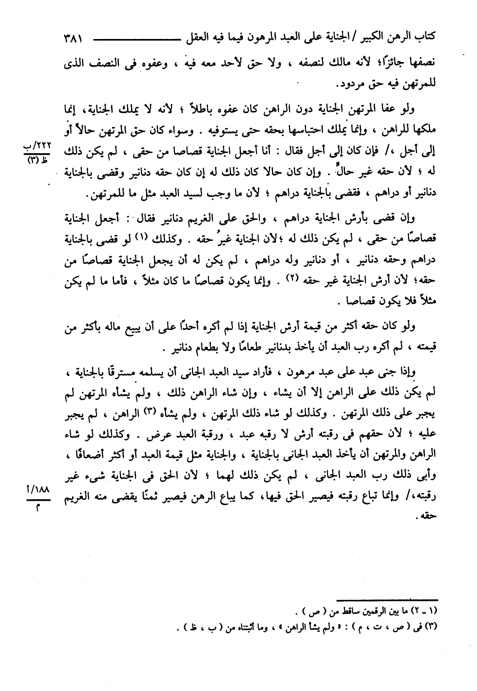 وَإِذَا جَنَى عَبْدٌ عَلَى عَبْدٍ مَرْهُونٍ فَأَرَادَ سَيِّدُ الْعَبْدِ الْجَانِي أَنْ يُسَلِّمَهُ مُسْتَرِقًّا بِالْجِنَايَةِ لَمْ يَكُنْ ذَلِكَ عَلَى الرَّاهِنِ إلَّا أَنْ يَشَاءَ , وَإِنْ يَشَاءَ الرَّاهِنُ ذَلِكَ , وَلَمْ يَشَأْهُ الْمُرْتَهِنُ لَمْ يُجْبَرْ عَلَى ذَلِكَ الْمُرْتَهِنُ , وَكَذَلِكَ لَوْ شَاءَ ذَلِكَ الْمُرْتَهِنُ , وَلَمْ يَشَأْهُ الرَّاهِنُ لَمْ يُجْبَرْ عَلَيْهِ ; لِأَنَّ حَقَّهُمْ فِي رَقَبَتِهِ أَرْشٌ لاَ رَقَبَةُ عَبْدٍ وَرَقَبَةُ الْعَبْدِ عَرْضٌ , وَكَذَلِكَ لَوْ شَاءَ الرَّاهِنُ وَالْمُرْتَهِنُ أَنْ يَأْخُذَ الْعَبْدَ الْجَانِيَ بِالْجِنَايَةِ , وَالْجِنَايَةُ مِثْلُ قِيمَةِ الْعَبْدِ أَوْ أَكْثَرُ أَضْعَافًا وَأَبَى ذَلِكَ رَبُّ الْعَبْدِ الْجَانِي لَمْ يَكُنْ ذَلِكَ لَهُمَا ; لِأَنَّ الْحَقَّ فِي الْجِنَايَةِ شَيْءٌ غَيْرُ رَقَبَتِهِ , وَإِنَّمَا تُبَاعُ رَقَبَتُهُ فَيَصِيرُ الْحَقُّ فِيهَا كَمَا يُبَاعُ الرَّهْنُ فَيَصِيرُ ثَمَنًا يَقْضِي مِنْهُ الْغَرِيمُ حَقَّهُ .@