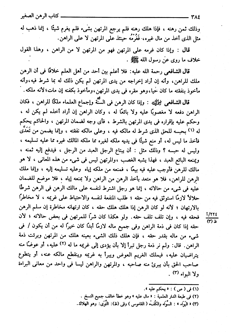 قَالَ الشَّافِعِيُّ : وَإِذَا كَانَ الرَّهْنُ فِي السُّنَّةِ , وَإِجْمَاعِ الْعُلَمَاءِ مِلْكًا لِلرَّاهِنِ فَكَانَ الرَّاهِنُ دَفَعَهُ لاَ مَغْصُوبًا عَلَيْهِ , وَلاَ بَائِعًا لَهُ , وَكَانَ الرَّاهِنُ إنْ أَرَادَ أَخْذَهُ لَمْ يَكُنْ لَهُ وَحُكِمَ عَلَيْهِ بِإِقْرَارِهِ فِي يَدَيْ الْمُرْتَهِنِ بِالشَّرْطِ فَأَيُّ وَجْهٍ لِضَمَانِ الْمُرْتَهِنِ وَالْحَاكِمُ يَحْكُمُ لَهُ بِحَبْسِهِ لِلْحَقِّ الَّذِي شَرَطَ لَهُ مَالِكُهُ فِيهِ وَعَلَى مَالِكِهِ نَفَقَتُهُ , وَإِنَّمَا يَضْمَنُ مَنْ تَعَدَّى فَأَخَذَ مَا لَيْسَ لَهُ أَوْ مَنَعَ شَيْئًا فِي يَدَيْهِ مَلَّكَهُ لِغَيْرِهِ مِمَّا مَلَّكَهُ الْمَالِكُ غَيْرَهُ مِمَّا عَلَيْهِ تَسْلِيمُهُ , وَلَيْسَ لَهُ حَبْسُهُ . وَذَلِكَ مِثْلُ أَنْ يَبْتَاعَ الرَّجُلُ الْعَبْدَ مِنْ الرَّجُلِ فَيَدْفَعَ إلَيْهِ ثَمَنَهُ وَيَمْنَعَهُ الْبَائِعُ الْعَبْدَ فَهَذَا يُشْبِهُ الْغَصْبَ , وَالْمُرْتَهِنُ لَيْسَ فِي شَيْءٍ مِنْ هَذِهِ الْمَعَانِي لاَ هُوَ مَالِكٌ لِلرَّهْنِ فَأَوْجَبَ عَلَيْهِ فِيهِ بَيْعًا فَمَنَعَهُ مِنْ مِلْكِهِ إيَّاهُ وَعَلَيْهِ تَسْلِيمُهُ إلَيْهِ , وَإِنَّمَا مَلَكَ الرَّهْنَ لِلرَّاهِنِ فَلاَ هُوَ مُتَعَدٍّ بِأَخْذِ الرَّهْنِ مِنْ الرَّاهِنِ , وَلاَ بِمَنْعِهِ إيَّاهُ فَلاَ مَوْضِعَ لِلضَّمَانِ عَلَيْهِ فِي شَيْءٍ مِنْ حَالاَتِهِ إنَّمَا هُوَ رَجُلٌ اشْتَرَطَ لِنَفْسِهِ عَلَى مَالِكِ الرَّهْنِ فِي الرَّهْنِ شَرْطًا حَلاَلاً لاَزِمًا اسْتَوْثَقَ فِيهِ مِنْ حَقِّهِ طَلَبُ الْمَنْفَعَةِ لِنَفْسِهِ وَالِاحْتِيَاطُ عَلَى غَرِيمِهِ لاَ مُخَاطِرًا بِالِارْتِهَانِ ; لِأَنَّهُ لَوْ كَانَ الرَّهْنُ إذَا هَلَكَ هَلَكَ حَقُّهُ كَانَ ارْتِهَانُهُ مُخَاطَرَةً إنْ سَلَّمَ الرَّهْنَ فَحَقُّهُ فِيهِ , وَإِنْ تَلِفَ تَلِفَ حَقُّهُ . وَلَوْ كَانَ هَكَذَا كَانَ شَرًّا لِلْمُرْتَهِنِ فِي بَعْضِ حَالاَتِهِ ; لِأَنَّ حَقَّهُ إذَا كَانَ فِي ذِمَّةِ الرَّاهِنِ وَفِي جَمِيعِ مَالِهِ لاَزِمًا أَبَدًا كَانَ خَيْرًا لَهُ مِنْ أَنْ يَكُونَ فِي شَيْءٍ مِنْ مَالِهِ بِقَدْرِ حَقِّهِ فَإِنْ هَلَكَ ذَلِكَ الشَّيْءُ بِعَيْنِهِ هَلَكَ مِنْ الْمُرْتَهِنِ وَبَرِئَتْ ذِمَّةُ الرَّاهِنِ قَالَ , وَلَمْ نَرَ ذِمَّةَ رَجُلٍ تَبْرَأُ إلَّا بِأَنْ يُؤَدِّيَ إلَى غَرِيمِهِ مَا لَهُ عَلَيْهِ أَوْ عِوَضًا مِنْهُ يَتَرَاضَيَانِ عَلَيْهِ فَيَمْلِكُ الْغَرِيمُ الْعِوَضَ وَيَبْرَأُ بِهِ غَرِيمُهُ وَيَنْقَطِعُ مَالِكُهُ عَنْهُ أَوْ يَتَطَوَّعُ صَاحِبُ الْحَقِّ بِأَنْ يُبْرِئَ مِنْهُ صَاحِبَهُ وَالْمُرْتَهِنُ وَالرَّاهِنُ لَيْسَا فِي وَاحِدٍ مِنْ مَعَانِي الْبَرَاءَةِ , وَلاَ الْبَوَاءِ .@