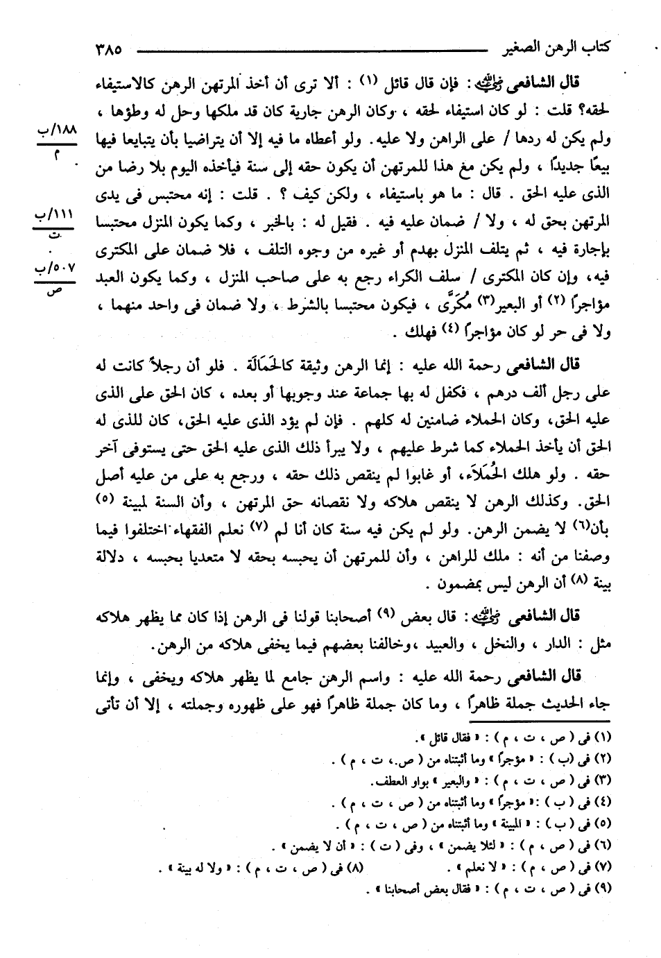 قَالَ الشَّافِعِيُّ : إنَّمَا الرَّهْنُ وَثِيقَةٌ كَالْحَمَالَةِ فَلَوْ أَنَّ رَجُلاً كَانَتْ لَهُ عَلَى رَجُلٍ أَلْفُ دِرْهَمٍ فَكَفَلَ لَهُ بِهَا جَمَاعَةٌ عِنْدَ وُجُوبِهَا أَوْ بَعْدَهُ كَانَ الْحَقُّ عَلَى الَّذِي عَلَيْهِ الْحَقُّ , وَكَانَ الْحُمَلاَءُ ضَامِنِينَ لَهُ كُلُّهُمْ فَإِنْ لَمْ يُؤَدِّ الَّذِي عَلَيْهِ الْحَقُّ كَانَ لِلَّذِي لَهُ الْحَقُّ أَنْ يَأْخُذَ الْحُمَلاَءَ كَمَا شَرَطَ عَلَيْهِمْ , وَلاَ يَبْرَأُ ذَلِكَ الَّذِي عَلَيْهِ الْحَقُّ مِنْ شَيْءٍ حَتَّى يَسْتَوْفِيَ آخِرَ حَقِّهِ , وَلَوْ هَلَكَ الْحُمَلاَءُ أَوْ غَابُوا لَمْ يُنْقِصْ ذَلِكَ حَقَّهُ وَرَجَعَ بِهِ عَلَى مَنْ عَلَيْهِ أَصْلُ الْحَقِّ . وَكَذَلِكَ الرَّهْنُ لاَ يُنْقِصُ هَلاَكُهُ , وَلاَ نُقْصَانُهُ حَقَّ الْمُرْتَهِنِ وَأَنَّ السُّنَّةَ الْمُبَيِّنَةَ بِأَنْ لاَ يُضْمَنَ الرَّهْنُ , وَلَوْ لَمْ يَكُنْ فِيهِ سُنَّةٌ كَأَنَّا لَمْ نَعْلَمْ الْفُقَهَاءَ اخْتَلَفُوا فِيمَا وَصَفْنَا مِنْ أَنَّهُ مِلْكٌ لِلرَّاهِنِ وَأَنَّ لِلْمُرْتَهِنِ أَنْ يَحْبِسَهُ بِحَقِّهِ لاَ مُتَعَدِّيًا بِحَبْسِهِ دَلاَلَةً بَيِّنَةً أَنَّ الرَّهْنَ لَيْسَ بِمَضْمُونٍ .