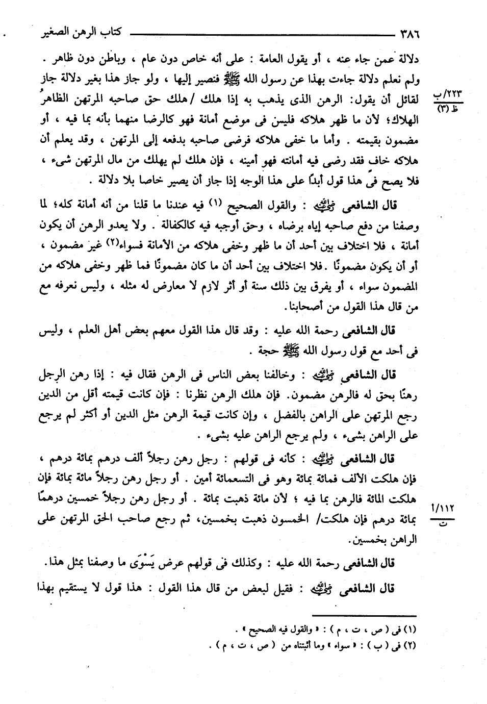 قَالَ الشَّافِعِيُّ : وَالْقَوْلُ الصَّحِيحُ فِيهِ عِنْدَنَا مَا قُلْنَا مِنْ أَنَّهُ أَمَانَةٌ كُلُّهُ لِمَا وَصَفْنَا مِنْ دَفْعِ صَاحِبِهِ إيَّاهُ بِرِضَاهُ وَحَقٍّ أَوْجَبَهُ فِيهِ كَالْكَفَالَةِ , وَلاَ يَعْدُو الرَّهْنُ أَنْ يَكُونَ أَمَانَةً فَلاَ اخْتِلاَفَ بَيْنَ أَحَدٍ أَنَّ مَا ظَهَرَ وَخَفِيَ هَلاَكَهُ مِنْ الْأَمَانَةِ سَوَاءٌ غَيْرُ مَضْمُونٍ أَوْ أَنْ يَكُونَ مَضْمُونًا فَلاَ اخْتِلاَفَ بَيْنَ أَحَدٍ أَنَّ مَا كَانَ مَضْمُونًا فَمَا ظَهَرَ وَخَفِيَ هَلاَكُهُ مِنْ الْمَضْمُونِ سَوَاءٌ أَوْ يُفَرِّقُ بَيْنَ ذَلِكَ سُنَّةٌ أَوْ أَثَرٌ لاَزِمٌ لاَ مُعَارِضَ لَهُ مِثْلُهُ , وَلَيْسَ نَعْرِفُهُ مَعَ مَنْ قَالَ هَذَا الْقَوْلَ مِنْ أَصْحَابِنَا .