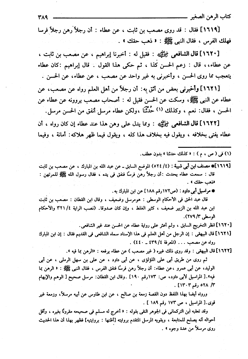 قَالَ الشَّافِعِيُّ : فَقِيلَ لَهُ أَخْبَرَنَا إبْرَاهِيمُ عَنْ مُصْعَبِ بْنِ ثَابِتٍ عَنْ عَطَاءٍ قَالَ زَعَمَ الْحَسَنُ كَذَا ثُمَّ حَكَى هَذَا الْقَوْلَ قَالَ إبْرَاهِيمُ كَانَ عَطَاءٌ يَتَعَجَّبُ مِمَّا رَوَى الْحَسَنُ وَأَخْبَرَنِي بِهِ غَيْرُ وَاحِدٍ عَنْ مُصْعَبٍ عَنْ عَطَاءٍ عَنْ الْحَسَنِ وَأَخْبَرَنِي بَعْضُ مَنْ أَثِقُ بِهِ أَنَّ رَجُلاً مِنْ أَهْلِ الْعِلْمِ رَوَاهُ عَنْ مُصْعَبٍ عَنْ عَطَاءٍ عَنْ النَّبِيِّ - صلى الله عليه وسلم - وَسَكَتَ عَنْ الْحَسَنِ . فَقِيلَ لَهُ أَصْحَابُ مُصْعَبٍ يَرْوُونَهُ عَنْ عَطَاءٍ عَنْ الْحَسَنِ فَقَالَ نَعَمْ , وَكَذَلِكَ حَدَّثَنَا , وَلَكِنَّ عَطَاءً مُرْسَلٌ اتَّفَقَ مِنْ الْحَسَنِ مُرْسَلٌ .
