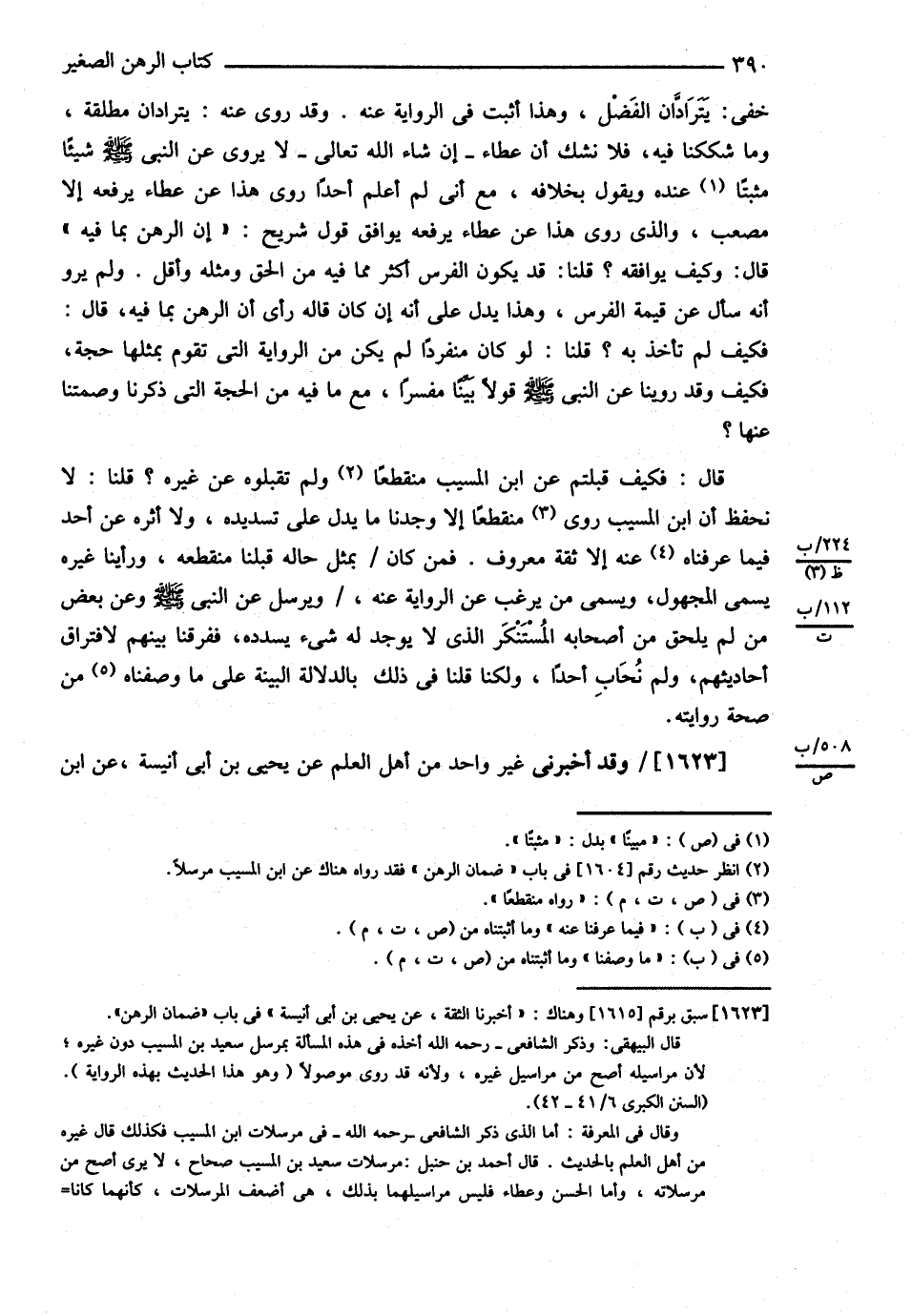 خَفِيَ يَتَرَادَّانِ الْفَضْلَ وَهَذَا أَثْبَتَ الرِّوَايَةَ عَنْهُ , وَقَدْ رُوِيَ عَنْهُ يَتَرَادَّانِ مُطْلَقُهُ وَمَا شَكَكْنَا فِيهِ فَلاَ نَشُكُّ أَنَّ عَطَاءً إنْ شَاءَ اللَّهُ - تَعَالَى - لاَ يَرْوِي عَنْ النَّبِيِّ - صلى الله عليه وسلم - شَيْئًا مُثْبَتًا عِنْدَهُ وَيَقُولُ بِخِلاَفِهِ مَعَ أَنِّي لَمْ أَعْلَمْ أَحَدًا رَوَى هَذَا عَنْ عَطَاءٍ يَرْفَعُهُ إلَّا مُصْعَبٌ وَاَلَّذِي رَوَى هَذَا عَنْ عَطَاءٍ يَرْفَعُهُ يُوَافِقُ قَوْلَ شُرَيْحٍ " إنَّ الرَّهْنَ بِمَا فِيهِ " قَالَ , وَكَيْفَ يُوَافِقُهُ ؟ قُلْنَا : قَدْ يَكُونُ الْفَرَسُ أَكْثَرَ مِمَّا فِيهِ مِنْ الْحَقِّ وَمِثْلَهُ وَأَقَلَّ , وَلَمْ يُرْوَ أَنَّهُ سَأَلَ عَنْ قِيمَةِ الْفَرَسِ وَهَذَا يَدُلُّ عَلَى أَنَّهُ إنْ كَانَ قَالَهُ رَأَى أَنَّ الرَّهْنَ بِمَا فِيهِ . قَالَ فَكَيْفَ لَمْ تَأْخُذْ بِهِ ؟ . قُلْنَا : لَوْ كَانَ مُنْفَرِدًا لَمْ يَكُنْ مِنْ الرِّوَايَةِ الَّتِي تَقُومُ بِمِثْلِهَا حُجَّةٌ فَكَيْفَ , وَقَدْ رَوَيْنَا عَنْ النَّبِيِّ - صلى الله عليه وسلم - قَوْلاً بَيِّنًا مُفَسَّرًا مَعَ مَا فِيهِ مِنْ الْحُجَّةِ الَّتِي ذَكَرْنَا وَصَمَتْنَا عَنْهَا قَالَ فَكَيْفَ قَبِلْتُمْ عَنْ ابْنِ الْمُسَيِّبِ مُنْقَطِعًا , وَلَمْ تَقْبَلُوهُ عَنْ غَيْرِهِ ؟ . قُلْنَا : لاَ نَحْفَظُ أَنَّ ابْنَ الْمُسَيِّبِ رَوَى مُنْقَطِعًا إلَّا وَجَدْنَا مَا يَدُلُّ عَلَى تَسْدِيدِهِ , وَلاَ أَثَرُهُ عَنْ أَحَدٍ فِيمَا عَرَفْنَاهُ عَنْهُ إلَّا ثِقَةٌ مَعْرُوفٌ فَمَنْ كَانَ بِمِثْلِ حَالِهِ قَبِلْنَا مُنْقَطِعَهُ وَرَأَيْنَا غَيْرَهُ يُسَمِّي الْمَجْهُولَ وَيُسَمِّي مَنْ يُرْغَبُ عَنْ الرِّوَايَةِ عَنْهُ وَيُرْسِلُ عَنْ النَّبِيِّ - صلى الله عليه وسلم - وَعَنْ بَعْضِ مَنْ لَمْ يَلْحَقْ مِنْ أَصْحَابِهِ الْمُسْتَنْكَرَ الَّذِي لاَ يُوجَدُ لَهُ شَيْءٌ يُسَدِّدُهُ فَفَرَّقْنَا بَيْنَهُمْ لِافْتِرَاقِ أَحَادِيثِهِمْ , وَلَمْ نُحَابِ أَحَدًا , وَلَكِنَّا قُلْنَا فِي ذَلِكَ بِالدَّلاَلَةِ الْبَيِّنَةِ عَلَى مَا وَصَفْنَاهُ مِنْ صِحَّةِ رِوَايَتِهِ . وَقَدْ أَخْبَرَنِي غَيْرُ وَاحِدٍ مِنْ أَهْلِ الْعِلْمِ عَنْ يَحْيَى بْنِ أَبِي أُنَيْسَةَ عَنْ ابْنِ @