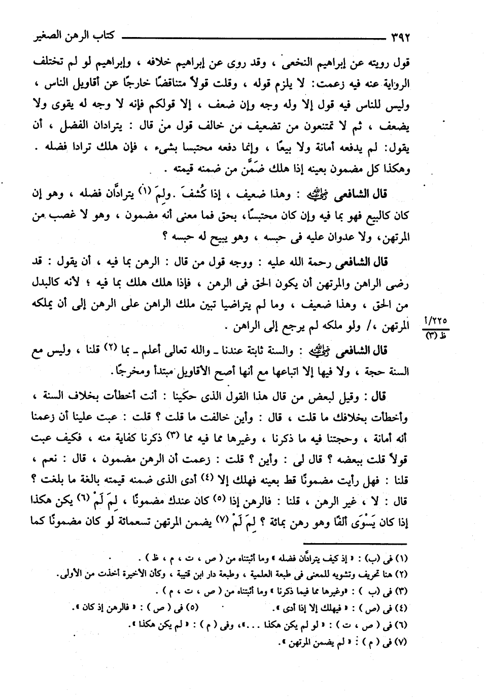 قال : وَقِيلَ لِبَعْضِ مَنْ قَالَ هَذَا الْقَوْلَ الَّذِي حَكَيْنَا : أَنْتَ أَخْطَأَتْ بِخِلاَفِ السُّنَّةِ وَأَخْطَأَتْ بِخِلاَفِك مَا قُلْت . قَالَ : وَأَيْنَ خَالَفْتُ مَا قُلْتُ ؟ قُلْت عِبْتَ عَلَيْنَا أَنْ زَعَمْنَا أَنَّهُ أَمَانَةٌ وَحُجَّتُنَا فِيهِ مَا ذَكَرْنَا وَغَيْرُهَا مِمَّا فِيمَا ذَكَرْنَا كِفَايَةٌ مِنْهُ فَكَيْفَ عِبْتَ قَوْلاً قُلْتَ بِبَعْضِهِ ؟ . قَالَ لِي وَأَيْنَ ؟ قُلْتُ : زَعَمْتَ أَنَّ الرَّهْنَ مَضْمُونٌ . قَالَ نَعَمْ قُلْنَا : فَهَلْ رَأَيْت مَضْمُونًا قَطُّ بِعَيْنِهِ فَهَلَكَ إلَّا أَدَّى الَّذِي ضَمَنَهُ قِيمَتَهُ بَالِغَةً مَا بَلَغَتْ ؟ قَالَ لاَ غَيْرَ الرَّهْنِ قُلْنَا فَالرَّهْنُ إذًا كَانَ عِنْدَك مَضْمُونًا لَمْ لَمْ يَكُنْ هَكَذَا إذَا كَانَ يَسْوَى أَلْفًا وَهُوَ رَهْنٌ بِمِائَةٍ ؟ ؟ . لِمَ لَمْ يَضْمَنْ الْمُرْتَهِنُ تِسْعَمِائَةٍ لَوْ كَانَ مَضْمُونًا كَمَا@