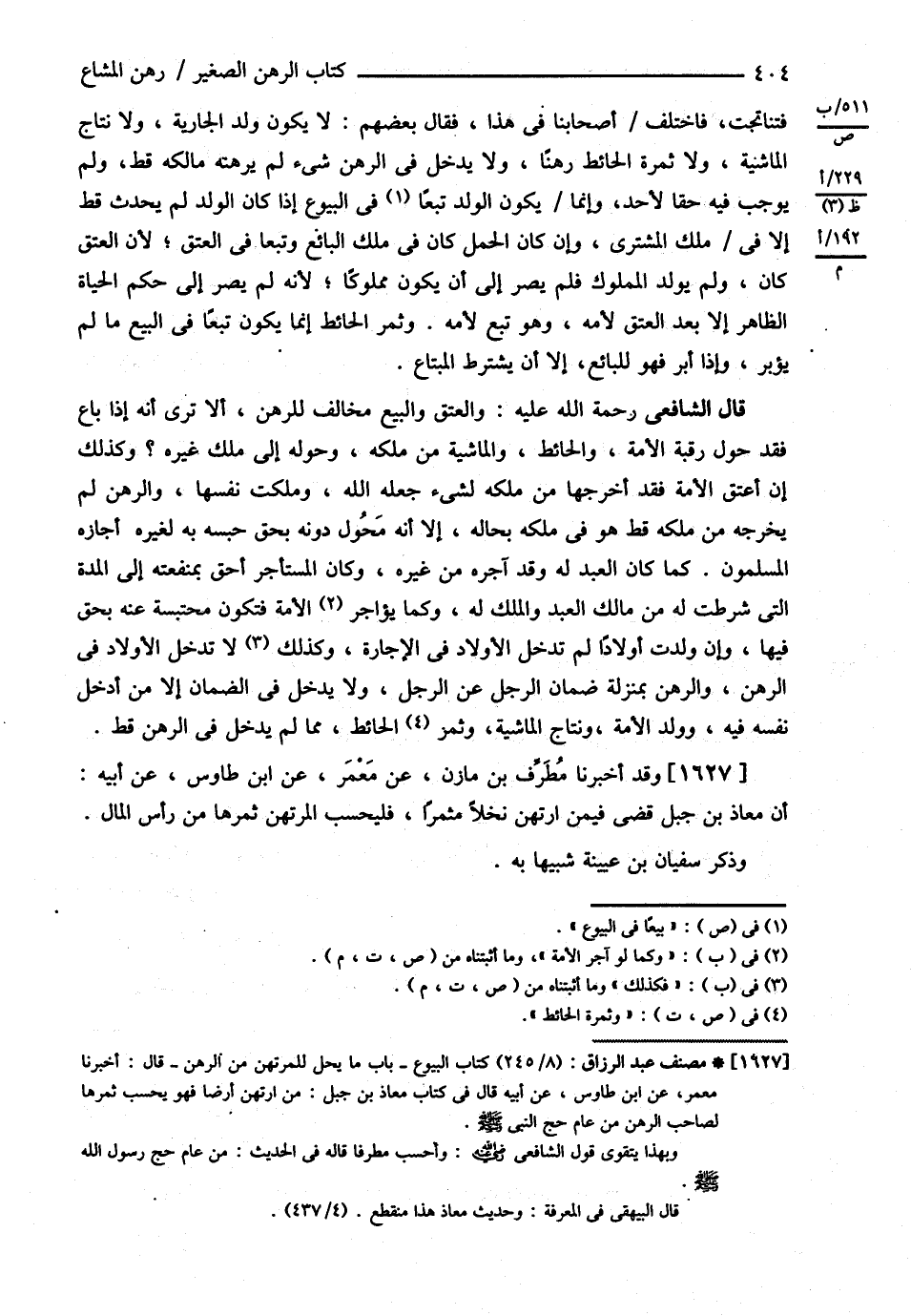 قَالَ الشَّافِعِيُّ : وَالْعِتْقُ وَالْبَيْعُ مُخَالِفٌ لِلرَّهْنِ أَلاَ تَرَى أَنَّهُ إذَا بَاعَ فَقَدْ حَوَّلَ رَقَبَةَ الْأَمَةِ وَالْحَائِطَ وَالْمَاشِيَةَ مِنْ مِلْكِهِ وَحَوَّلَهُ إلَى مِلْكِ غَيْرِهِ ؟ , وَكَذَلِكَ إنْ أَعْتَقَ الْأَمَةَ فَقَدْ أَخْرَجَهَا مِنْ مِلْكِهِ لِشَيْءٍ جَعَلَهُ اللَّهُ وَمَلَكَتْ نَفْسَهَا , وَالرَّهْنُ لَمْ يُخْرِجْهُ مِنْ مِلْكِهِ قَطُّ هُوَ فِي مِلْكِهِ بِحَالِهِ إلَّا أَنَّهُ مُحَوَّلٌ دُونَهُ بِحَقٍّ حَبَسَهُ بِهِ لِغَيْرِهِ أَجَازَهُ الْمُسْلِمُونَ كَمَا كَانَ الْعَبْدُ لَهُ , وَقَدْ أَجَّرَهُ مِنْ غَيْرِهِ , وَكَانَ الْمُسْتَأْجِرُ أَحَقَّ بِمَنْفَعَتِهِ إلَى الْمُدَّةِ الَّتِي شُرِطَتْ لَهُ مِنْ مَالِكِ الْعَبْدِ وَالْمِلْكُ لَهُ , وَكَمَا لَوْ آجَرَ الْأَمَةَ فَتَكُونُ مُحْتَبَسَةً عَنْهُ بِحَقٍّ فِيهَا , وَإِنْ وَلَدَتْ أَوْلاَدًا لَمْ تَدْخُلْ الْأَوْلاَدُ فِي الْإِجَارَةِ فَكَذَلِكَ لَمْ تَدْخُلْ الْأَوْلاَدُ فِي الرَّهْنِ , وَالرَّهْنُ بِمَنْزِلَةِ ضَمَانِ الرَّجُلِ عَنْ الرَّجُلِ , وَلاَ يَدْخُلُ فِي الضَّمَانِ إلَّا مَنْ أَدْخَلَ نَفْسَهُ فِيهِ وَوَلَدُ الْأَمَةِ وَنِتَاجُ الْمَاشِيَةِ وَثَمَرُ الْحَائِطِ مِمَّا لَمْ يَدْخُلُ فِي الرَّهْنِ قَطُّ . وَقَدْ أَخْبَرَنَا مُطَرِّفُ بْنُ مَازِنٍ عَنْ مَعْمَرٍ عَنْ ابْنِ طَاوُسٍ عَنْ أَبِيهِ أَنَّ مُعَاذَ بْنَ جَبَلٍ قَضَى فِيمَنْ ارْتَهَنَ نَخْلاً مُثْمِرًا فَلْيَحْسِبْ الْمُرْتَهِنُ ثَمَرَهَا مِنْ رَأْسِ الْمَالِ وَذَكَرَ سُفْيَانُ بْنُ عُيَيْنَةَ شَبِيهًا بِهِ @