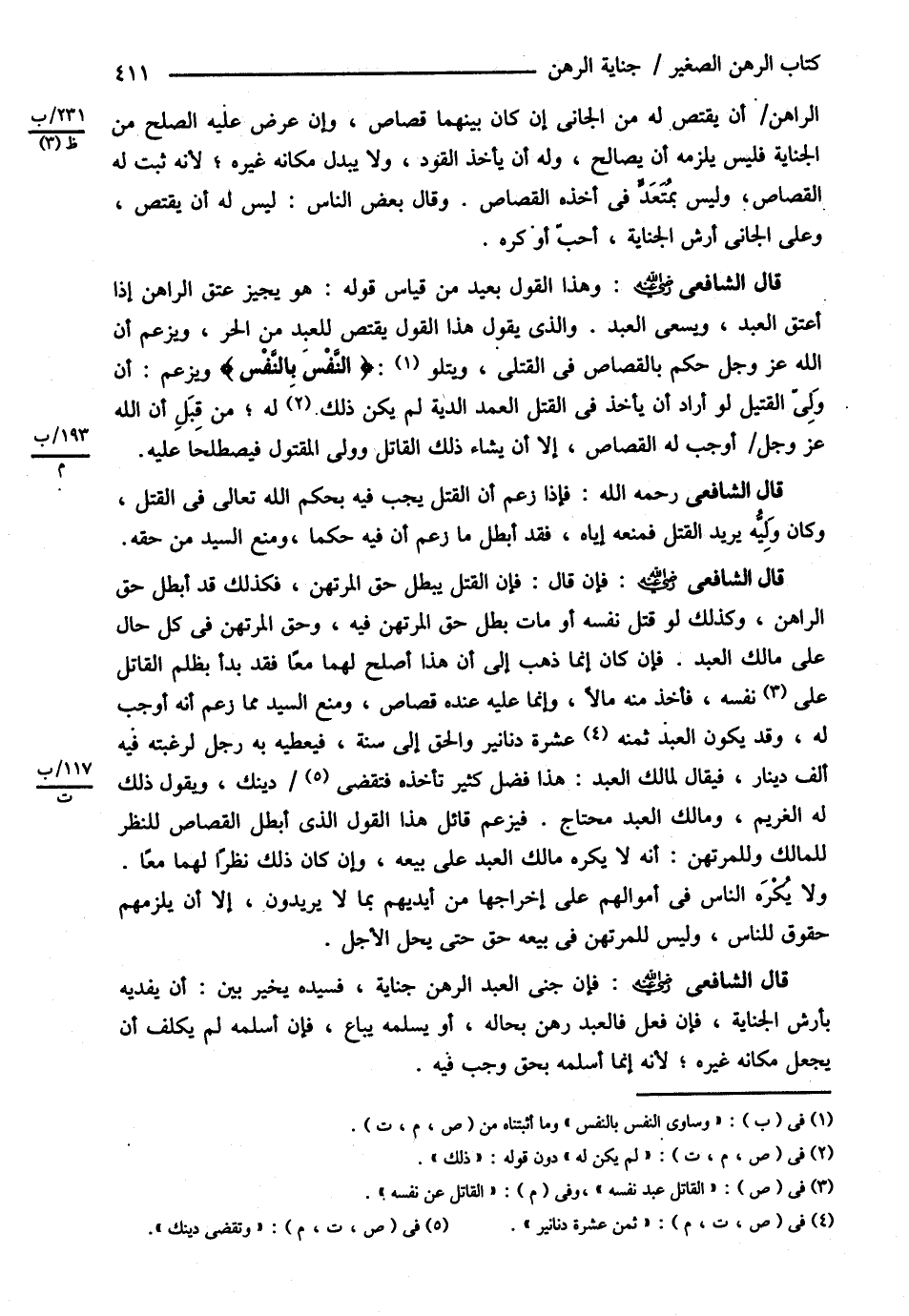 قَالَ الشَّافِعِيُّ : وَهَذَا الْقَوْلُ بَعِيدٌ مِنْ قِيَاسِ قَوْلِهِ هُوَ يُجِيزُ عِتْقَ الرَّاهِنِ إذَا أَعْتَقَ الْعَبْدَ وَيَسْعَى الْعَبْدُ وَاَلَّذِي يَقُولُ هَذَا الْقَوْلَ يَقْتَصُّ لِلْعَبْدِ مِنْ الْحُرِّ وَيَزْعُمُ أَنَّ اللَّهَ - عَزَّ وَجَلَّ - حَكَمَ بِالْقِصَاصِ فِي الْقَتْلَى وَسَاوَى النَّفْسَ بِالنَّفْسِ وَيَزْعُمُ أَنَّ وَلِيَّ الْقَتِيلِ لَوْ أَرَادَ أَنْ يَأْخُذَ فِي الْقَتْلِ الْعَمْدِ الدِّيَةَ لَمْ يَكُنْ ذَلِكَ لَهُ مِنْ قِبَلِ أَنَّ اللَّهَ - عَزَّ وَجَلَّ - أَوْجَبَ لَهُ الْقِصَاصَ إلَّا أَنْ يَشَاءَ ذَلِكَ الْقَاتِلُ وَوَلِيُّ الْمَقْتُولِ فَيَصْطَلِحَا عَلَيْهِ .