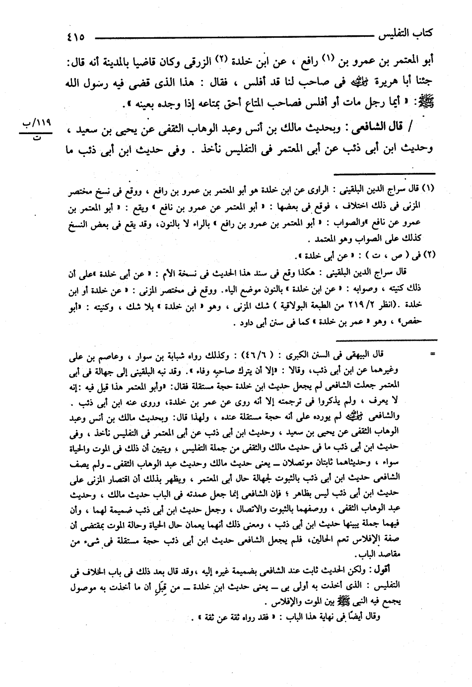 قَالَ الشَّافِعِيُّ : وَبِحَدِيثِ مَالِكِ بْنِ أَنَسٍ وَعَبْدِ الْوَهَّابِ الثَّقَفِيِّ عَنْ يَحْيَى بْنِ سَعِيدٍ وَحَدِيثِ ابْنِ أَبِي ذِئْبٍ عَنْ أَبِي الْمُعْتَمِرِ فِي التَّفْلِيسِ نَأْخُذُ وَفِي حَدِيثِ ابْنِ أَبِي ذِئْبٍ مَا@