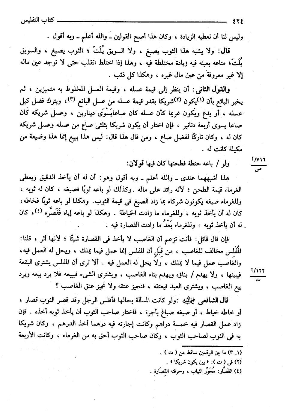 وَلَيْسَ لَنَا أَنْ نُعْطِيَهُ الزِّيَادَةَ , وَكَانَ هَذَا أَصَحَّ الْقَوْلَيْنِ وَاَللَّهُ أَعْلَمُ وَبِهِ أَقُولُ . قَالَ : وَلاَ يُشْبِهُ هَذَا , الثَّوْبَ يُصْبَغُ , وَلاَ السَّوِيقَ يُلَتُّ الثَّوْبُ يُصْبَغُ وَالسَّوِيقُ يُلَتُّ مَتَاعُهُ بِعَيْنِهِ فِيهِ زِيَادَةٌ مُخْتَلِطَةٌ فِيهِ وَهَذَا إذَا اخْتَلَطَ انْقَلَبَ حَتَّى لاَ تُوجَدَ عَيْنُ مَالِهِ إلَّا غَيْرَ مَعْرُوفَةٍ مِنْ عَيْنِ مَالِ غَيْرِهِ وَهَكَذَا كُلُّ ذَائِبٍ . وَالْقَوْلُ الثَّانِي : أَنْ يَنْظُرَ إلَى قِيمَةِ عَسَلِهِ , وَقِيمَةِ الْعَسَلِ الْمَخْلُوطِ بِهِ مُتَمَيِّزَيْنِ ثُمَّ يُخَيَّرُ الْبَائِعُ بِأَنْ يَكُونَ شَرِيكًا بِقَدْرِ قِيمَةِ عَسَلِهِ مِنْ عَسَلِ الْبَائِعِ وَيَتْرُكَ فَضْلَ كَيْلِ عَسَلِهِ أَوْ يَدَعَ وَيَكُونَ غَرِيمًا كَأَنَّ عَسَلَهُ كَانَ صَاعًا يَسْوَى دِينَارَيْنِ , وَعَسَلَ شَرِيكِهِ كَانَ صَاعًا يَسْوَى أَرْبَعَةَ دَنَانِيرَ فَإِنْ اخْتَارَ أَنْ يَكُونَ شَرِيكًا بِثُلُثَيْ صَاعٍ مِنْ عَسَلِهِ وَعَسَلِ شَرِيكِهِ كَانَ لَهُ , وَكَانَ تَارِكًا لِفَضْلِ صَاعٍ وَمَنْ قَالَ هَذَا قَالَ لَيْسَ هَذَا بِبَيْعٍ إنَّمَا هَذَا وَضِيعَةٌ مِنْ مَكِيلَةٍ كَانَتْ لَهُ , وَلَوْ بَاعَهُ حِنْطَةً فَطَحَنَهَا كَانَ فِيهَا قَوْلاَنِ هَذَا أَشْبَهُهُمَا عِنْدِي وَاَللَّهُ أَعْلَمُ وَبِهِ أَقُولُ . وَهُوَ أَنَّ لَهُ أَنْ يَأْخُذَ الدَّقِيقَ وَيُعْطِيَ الْغُرَمَاءَ قِيمَةَ الطَّحْنِ ; لِأَنَّهُ زَائِدٌ عَلَى مَالِهِ . وَكَذَلِكَ لَوْ بَاعَهُ ثَوْبًا فَصَبَغَهُ كَانَ لَهُ ثَوْبُهُ وَلِلْغُرَمَاءِ صَبْغُهُ يَكُونُونَ شُرَكَاءَ بِمَا زَادَ الصَّبْغُ فِي قِيمَةِ الثَّوْبِ وَهَكَذَا لَوْ بَاعَهُ ثَوْبًا فَخَاطَهُ كَانَ لَهُ أَنْ يَأْخُذَ ثَوْبَهُ وَلِلْغُرَمَاءِ مَا زَادَتْ الْخِيَاطَةُ . وَهَكَذَا لَوْ بَاعَهُ إيَّاهُ فَقَصَّرَهُ كَانَ لَهُ أَنْ يَأْخُذَ ثَوْبَهُ وَلِلْغُرَمَاءِ بَعْدَمَا زَادَتْ الْقِصَارَةُ فِيهِ فَإِنْ قَالَ قَائِلٌ : فَأَنْتَ تَزْعُمُ أَنَّ الْغَاصِبَ لاَ يَأْخُذُ فِي الْقِصَارَةِ شَيْئًا ; لِأَنَّهَا أَثَرٌ قُلْنَا الْمُفْلِسُ مُخَالِفٌ لِلْغَاصِبِ مِنْ قِبَلِ أَنَّ الْمُفْلِسَ إنَّمَا عَمِلَ فِيمَا يَمْلِكُ وَيَحِلُّ لَهُ الْعَمَلُ فِيهِ وَالْغَاصِبَ عَمِلَ فِيمَا لاَ يَمْلِكُ , وَلاَ يَحِلُّ لَهُ الْعَمَلُ فِيهِ أَلاَ تَرَى أَنَّ الْمُفْلِسَ يَشْتَرِي الْبُقْعَةَ فَيَبْنِيهَا , وَلاَ يُهْدَمُ بِنَاؤُهُ وَيُهْدَمُ بِنَاءُ الْغَاصِبِ وَيَشْتَرِي الشَّيْءَ فَيَبِيعُهُ فَلاَ يُرَدُّ بَيْعُهُ وَيُرَدُّ بَيْعُ الْغَاصِبِ وَيَشْتَرِي الْعَبْدُ فَيُعْتِقُهُ فَنُجِيزُ عِتْقَهُ , وَلاَ نُجِيزُ عِتْقَ الْغَاصِبِ .