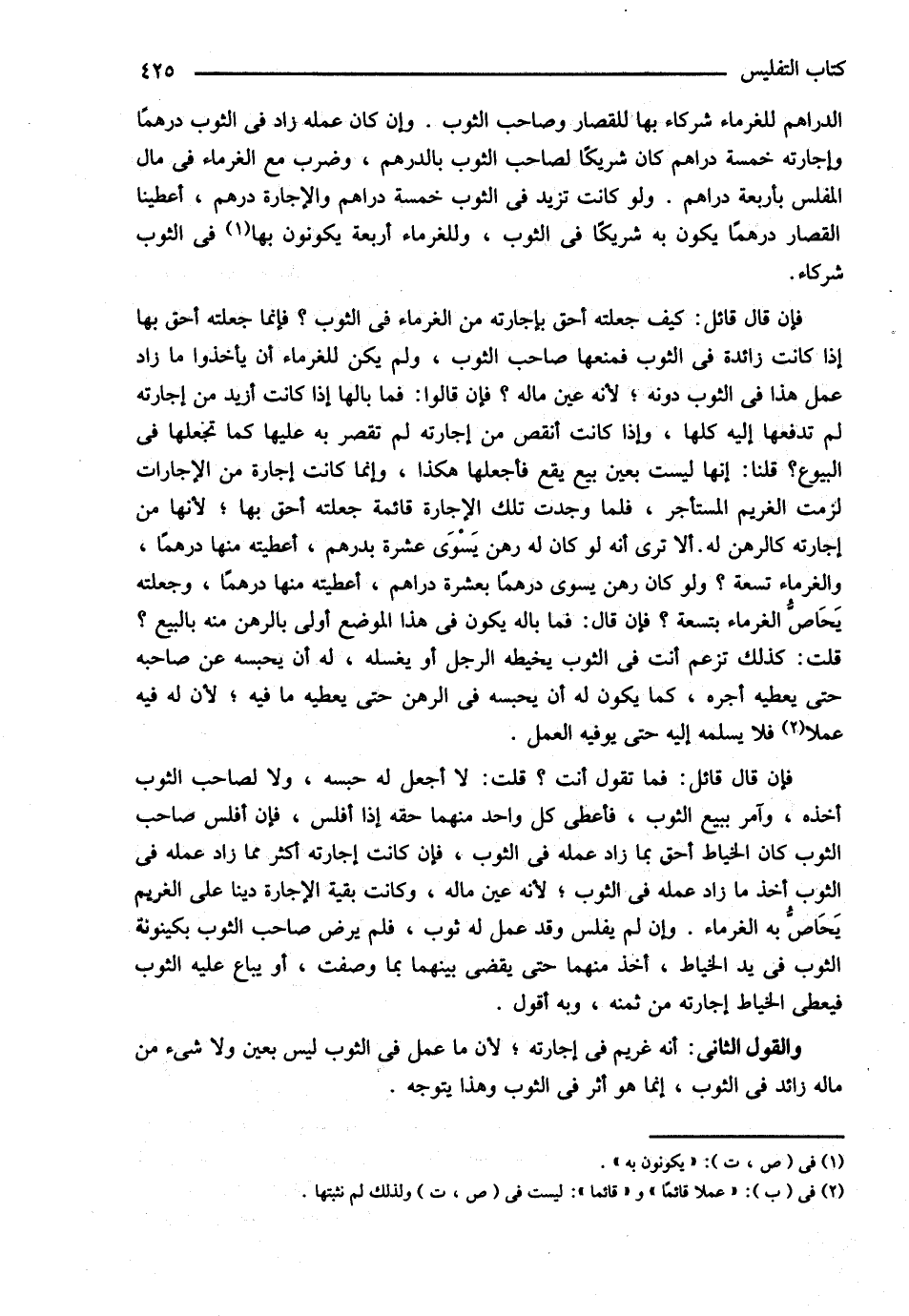الدَّرَاهِمُ لِلْغُرَمَاءِ شُرَكَاءَ بِهَا لِلْقَصَّارِ وَصَاحِبِ الثَّوْبِ , وَإِنْ كَانَ عَمَلُهُ زَادَ فِي الثَّوْبِ دِرْهَمًا , وَإِجَارَتُهُ خَمْسَةُ دَرَاهِمَ كَانَ شَرِيكًا لِصَاحِبِ الثَّوْبِ بِالدِّرْهَمِ وَضَرَبَ مَعَ الْغُرَمَاءِ فِي مَالِ الْمُفْلِسِ بِأَرْبَعَةِ دَرَاهِمَ . وَلَوْ كَانَتْ تَزِيدُ فِي الثَّوْبِ خَمْسَةُ دَرَاهِمَ وَالْإِجَارَةُ دِرْهَمٌ أَعْطَيْنَا الْقَصَّارَ دِرْهَمًا يَكُونُ بِهِ شَرِيكًا فِي الثَّوْبِ ؟ وَلِلْغُرَمَاءِ أَرْبَعَةٌ يَكُونُونَ بِهَا فِي الثَّوْبِ شُرَكَاءَ فَإِنْ قَالَ قَائِلٌ : كَيْفَ جَعَلْتَهُ أَحَقَّ بِإِجَارَتِهِ مِنْ الْغُرَمَاءِ فِي الثَّوْبِ . فَإِنَّمَا جَعَلْتُهُ أَحَقَّ بِهَا إذَا كَانَتْ زَائِدَةً فِي الثَّوْبِ فَمَنَعَهَا صَاحِبُ الثَّوْبِ لَمْ يَكُنْ لِلْغُرَمَاءِ أَنْ يَأْخُذُوا مَا زَادَ عَمَلُ هَذَا فِي الثَّوْبِ دُونَهُ ; لِأَنَّهُ عَيْنُ مَالِهِ , فَإِنْ قَالُوا : فَمَا بَالُهَا إذَا كَانَتْ أَزْيَدَ مِنْ إجَارَتِهِ لَمْ تَدْفَعْهَا إلَيْهِ كُلَّهَا , وَإِذَا كَانَتْ أَنْقَصَ مِنْ إجَارَتِهِ لَمْ تَقْتَصِرْ بِهِ عَلَيْهَا كَمَا تَجْعَلُهَا فِي الْبُيُوعِ ؟ قُلْنَا : إنَّهَا لَيْسَتْ بِعَيْنِ بَيْعٍ يَقَعُ فَاجْعَلْهَا هَكَذَا , وَإِنَّمَا كَانَتْ إجَارَةً مِنْ الْإِجَارَاتِ لَزِمَتْ الْغَرِيمَ الْمُسْتَأْجِرَ فَلَمَّا وَجَدْتُ تِلْكَ الْإِجَارَةَ قَائِمَةً جَعَلْتُهُ أَحَقَّ بِهَا ; لِأَنَّهَا مِنْ إجَارَتِهِ كَالرَّهْنِ لَهُ أَلاَ تَرَى أَنَّهُ لَوْ كَانَ لَهُ رَهْنٌ يَسْوَى عَشَرَةً بِدِرْهَمٍ أَعْطَيْته مِنْهَا دِرْهَمًا وَالْغُرَمَاءَ تِسْعَةً , وَلَوْ كَانَ رَهْنٌ يَسْوَى دِرْهَمًا بِعَشَرَةِ دَرَاهِمَ أَعْطَيْته مِنْهَا دِرْهَمًا وَجَعَلْته يُحَاصُّ الْغُرَمَاءَ بِتِسْعَةٍ فَإِنْ قَالَ فَمَا بَالُهُ يَكُونُ فِي هَذَا الْمَوْضِعِ أَوْلَى بِالرَّهْنِ مِنْهُ بِالْبَيْعِ ؟ . قُلْت كَذَلِكَ تَزْعُمُ أَنْتَ فِي الثَّوْبِ يَخِيطُهُ الرَّجُلُ أَوْ يَغْسِلُهُ لَهُ أَنْ يَحْبِسَهُ عَنْ صَاحِبِهِ حَتَّى يُعْطِيَهُ أَجْرَهُ كَمَا يَكُونُ لَهُ أَنْ يَحْبِسَهُ فِي الرَّهْنِ حَتَّى يُعْطِيَهُ مَا فِيهِ ; لِأَنَّ لَهُ فِيهِ عَمَلاً قَائِمًا فَلاَ يُسَلِّمُهُ إلَيْهِ حَتَّى يُوَفِّيَهُ الْعَمَلَ فَإِنْ قَالَ قَائِلٌ : فَمَا تَقُولُ أَنْتَ ؟ قُلْتُ لاَ أَجْعَلُ لَهُ حَبْسَهُ , وَلاَ لِصَاحِبِ الثَّوْبِ أَخْذَهُ وَآمُرُ بِبَيْعِ الثَّوْبِ فَأُعْطِي كُلَّ وَاحِدٍ مِنْهُمَا حَقَّهُ إذَا أَفْلَسَ فَإِنْ أَفْلَسَ صَاحِبُ الثَّوْبِ كَانَ الْخَيَّاطُ أَحَقَّ بِمَا زَادَ عَمَلُهُ فِي الثَّوْبِ فَإِنْ كَانَتْ إجَارَتُهُ أَكْثَرَ مِمَّا زَادَ عَمَلُهُ فِي الثَّوْبِ أَخَذَ مَا زَادَ عَمَلُهُ فِي الثَّوْبِ ; لِأَنَّهُ عَيْنُ مَالِهِ , وَكَانَتْ بَقِيَّةُ الْإِجَارَةِ دَيْنًا عَلَى الْغَرِيمِ يُحَاصُّ بِهِ الْغُرَمَاءَ . وَإِنْ لَمْ يُفْلِسْ , وَقَدْ عُمِلَ لَهُ ثَوْبٌ فَلَمْ يَرْضَ صَاحِبُ الثَّوْبِ بِكَيْنُونَةِ الثَّوْبِ فِي يَدِ الْخَيَّاطِ أَخَذَ مَكَانَهُ مِنْهُمَا حَتَّى يَقْضِيَ بَيْنَهُمَا بِمَا وَصَفْتُ أَوْ يُبَاعُ عَلَيْهِ الثَّوْبُ فَيُعْطَى إجَارَتُهُ مِنْ ثَمَنِهِ وَبِهِ أَقُولُ . وَالْقَوْلُ الثَّانِي : إنَّهُ غَرِيمٌ فِي إجَارَتِهِ ; لِأَنَّ مَا عُمِلَ فِي الثَّوْبِ لَيْسَ بِعَيْنٍ , وَلاَ شَيْءَ مِنْ مَالِهِ زَائِدٌ فِي الثَّوْبِ إنَّمَا هُوَ أَثَرٌ فِي الثَّوْبِ وَهَذَا يَتَوَجَّهُ .@