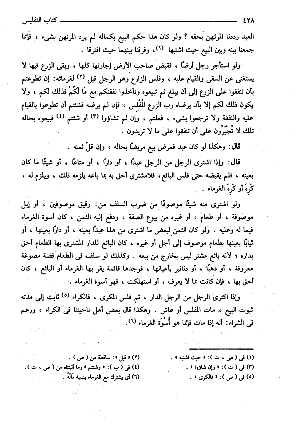 وَإِذَا اكْتَرَى الرَّجُلُ مِنْ الرَّجُلِ الدَّارَ ثُمَّ فَلِسَ الْمُكْرِي فَالْكِرَاءُ ثَابِتٌ إلَى مُدَّتِهِ ثُبُوتَ الْبَيْعِ مَاتَ الْمُفْلِسُ أَوْ عَاشَ وَهَكَذَا قَالَ بَعْضُ أَهْلِ نَاحِيَتِنَا فِي الْكِرَاءِ وَزَعَمَ فِي الشِّرَاءِ أَنَّهُ إذَا مَاتَ فَإِنَّمَا هُوَ أُسْوَةُ الْغُرَمَاءِ ,@