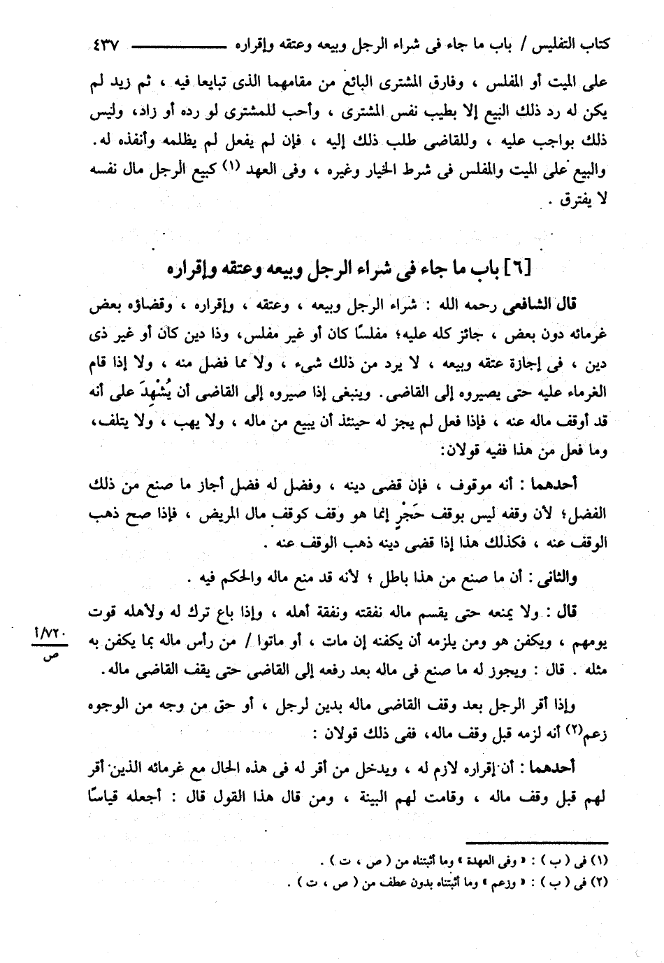 قَالَ الشَّافِعِيُّ : رحمه الله : شِرَاءُ الرَّجُلِ وَبَيْعُهُ وَعِتْقُهُ , وَإِقْرَارُهُ , وَقَضَاؤُهُ بَعْضَ غُرَمَائِهِ دُونَ بَعْضٍ جَائِزٌ كُلُّهُ عَلَيْهِ مُفْلِسًا كَانَ أَوْ غَيْرَ مُفْلِسٍ وَذَا دَيْنٍ كَانَ أَوْ غَيْرَ ذِي دَيْنٍ فِي إجَازَةِ عِتْقِهِ وَبَيْعِهِ لاَ يُرَدُّ مِنْ ذَلِكَ شَيْءٌ , وَلاَ مِمَّا فَضَلَ مِنْهُ , وَلاَ إذَا قَامَ الْغُرَمَاءُ عَلَيْهِ حَتَّى يُصَيِّرُوهُ إلَى الْقَاضِي وَيَنْبَغِي إذَا صَيَّرُوهُ إلَى الْقَاضِي أَنْ يَشْهَدَ عَلَى أَنَّهُ قَدْ أَوْقَفَ مَالَهُ عَنْهُ فَإِذَا فَعَلَ لَمْ يَجُزْ لَهُ حِينَئِذٍ أَنْ يَبِيعَ مِنْ مَالِهِ , وَلاَ يَهَبَ , وَلاَ يُتْلِفَ وَمَا فَعَلَ مِنْ هَذَا فَفِيهِ قَوْلاَنِ . أَحَدُهُمَا : أَنَّهُ مَوْقُوفٌ فَإِنْ قَضَى دَيْنَهُ وَفَضَلَ لَهُ فَضْلٌ أَجَازَ مَا صَنَعَ مِنْ ذَلِكَ الْفَضْلِ ; لِأَنَّ وَقْفَهُ لَيْسَ بِوَقْفِ حَجْرٍ إنَّمَا هُوَ وَقْفٌ كَوَقْفِ مَالِ الْمَرِيضِ فَإِذَا صَحَّ ذَهَبَ الْوَقْفُ عَنْهُ فَكَذَلِكَ هَذَا إذَا قَضَى دَيْنَهُ ذَهَبَ الْوَقْفُ عَنْهُ . وَالثَّانِي : أَنَّ مَا صَنَعَ مِنْ هَذَا بَاطِلٌ ; لِأَنَّهُ قَدْ مَنَعَ مَالَهُ وَالْحُكْمَ فِيهِ . قَالَ : وَلاَ يَمْنَعُهُ حَتَّى يَقْسِمَ مَالَهُ نَفَقَتَهُ وَنَفَقَةَ أَهْلِهِ , وَإِذَا بَاعَ تَرَكَ لَهُ وَلِأَهْلِهِ قُوتَ يَوْمِهِمْ وَيُكَفَّنُ هُوَ وَمَنْ يَلْزَمُهُ أَنْ يُكَفِّنَهُ إنْ مَاتَ أَوْ مَاتُوا مِنْ رَأْسِ مَالِهِ بِمَا يُكَفَّنُ بِهِ مِثْلُهُ . قَالَ : وَيَجُوزُ لَهُ مَا صَنَعَ فِي مَالِهِ بَعْدَ رَفْعِهِ إلَى الْقَاضِي حَتَّى يَقِفَ الْقَاضِي مَالَهُ , وَإِذَا أَقَرَّ الرَّجُلُ بَعْدَ وَقْفِ الْقَاضِي مَالَهُ بِدَيْنٍ لِرَجُلٍ أَوْ حَقٍّ مِنْ وَجْهٍ مِنْ الْوُجُوهِ وَزَعَمَ أَنَّهُ لَزِمَهُ قَبْلَ وَقْفِ مَالِهِ فَفِي ذَلِكَ قَوْلاَنِ . أَحَدُهُمَا : أَنَّ إقْرَارَهُ لاَزِمٌ لَهُ وَيَدْخُلُ مَنْ أَقَرَّ لَهُ فِي هَذِهِ الْحَالِ مَعَ غُرَمَائِهِ الَّذِينَ أَقَرَّ لَهُمْ قَبْلَ وَقْفِ مَالِهِ , وَقَامَتْ لَهُمْ الْبَيِّنَةُ وَمَنْ قَالَ هَذَا الْقَوْلَ قَالَ أَجْعَلُهُ قِيَاسًا@