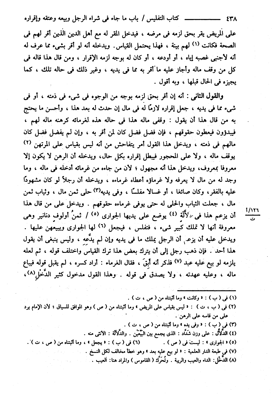 عَلَى الْمَرِيضِ يُقِرُّ بِحَقٍّ لَزِمَهُ فِي مَرَضِهِ فَيَدْخُلُ الْمُقَرُّ لَهُ مَعَ أَهْلِ الدَّيْنِ الَّذِينَ أَقَرَّ لَهُمْ فِي الصِّحَّةِ , وَكَانَتْ لَهُمْ بَيِّنَةٌ فَهَذَا يَحْتَمِلُ الْقِيَاسَ وَيَدْخُلُهُ أَنَّهُ لَوْ أَقَرَّ بِشَيْءٍ مِمَّا عَرَفَ لَهُ أَنَّهُ لِأَجْنَبِيٍّ غَصَبَهُ إيَّاهُ أَوْ أَوْدَعَهُ أَوْ كَانَ لَهُ بِوَجْهٍ لَزِمَهُ الْإِقْرَارُ . وَمَنْ قَالَ هَذَا قَالَهُ فِي كُلِّ مَنْ وُقِفَ مَالُهُ وَأَجَازَ عَلَيْهِ مَا أَقَرَّ بِهِ مِمَّا فِي يَدَيْهِ وَغَيْرِ ذَلِكَ فِي حَالِهِ تِلْكَ كَمَا يُجِيزُهُ فِي الْحَالِ قَبْلَهَا وَبِهِ أَقُولُ . وَالْقَوْلُ الثَّانِي : أَنَّهُ إنْ أَقَرَّ بِحَقٍّ لَزِمَهُ بِوَجْهٍ مِنْ الْوُجُوهِ فِي شَيْءٍ فِي ذِمَّتِهِ أَوْ فِي شَيْءٍ مِمَّا فِي يَدَيْهِ جَعَلَ إقْرَارَهُ لاَزِمًا لَهُ فِي مَالٍ إنْ حَدَثَ لَهُ بَعْدَ هَذَا وَأَحْسَنُ مَا يُحْتَجُّ بِهِ مَنْ قَالَ هَذَا أَنْ يَقُولَ : وَقْفِي مَالَهُ هَذَا فِي حَالِهِ هَذِهِ لِغُرَمَائِهِ كَرَهْنِهِ مَالَهُ لَهُمْ فَيَبْدَءُونَ فَيُعْطَوْنَ حُقُوقَهُمْ فَإِنْ فَضَلَ فَضْلٌ كَانَ لِمَنْ أَقَرَّ لَهُ , وَإِنْ لَمْ يَفْضُلْ فَضْلٌ كَانَ مَالُهُمْ فِي ذِمَّتِهِ وَيَدْخُلُ هَذَا الْقَوْلَ أَمْرٌ يَتَفَاحَشُ مِنْ أَنَّهُ لَيْسَ بِقِيَاسٍ عَلَى الْمَرِيضِ يُوقَفُ مَالُهُ , وَلاَ عَلَى الْمَحْجُورِ فَيَبْطُلُ إقْرَارُهُ بِكُلِّ حَالٍ وَيَدْخُلُهُ أَنَّ الرَّهْنَ لاَ يَكُونُ إلَّا مَعْرُوفًا بِمَعْرُوفٍ وَيَدْخُلُ هَذَا أَنَّهُ مَجْهُولٌ ; لِأَنَّ مَنْ جَاءَهُ مِنْ غُرَمَائِهِ أَدْخَلَهُ فِي مَالِهِ وَمَا وَجَدَ لَهُ مِنْ مَالٍ لاَ يَعْرِفُهُ , وَلاَ غُرَمَاؤُهُ أَعْطَاهُ غُرَمَاءَهُ . وَيَدْخُلُهُ أَنَّ رَجُلاً لَوْ كَانَ مَشْهُودًا عَلَيْهِ بِالْفَقْرِ , وَكَانَ صَائِغًا أَوْ غَسَّالاً مُفْلِسًا وَفِي يَدِهِ حُلِيٌّ ثَمَنُ مَالٍ وَثِيَابٌ ثَمَنُ مَالٍ جَعَلْتُ الثِّيَابَ وَالْحُلِيَّ لَهُ حَتَّى يُوَفِّيَ غُرَمَاءَهُ حُقُوقَهُمْ . وَيَدْخُلُ عَلَى مَنْ قَالَ هَذَا أَنْ يَزْعُمَ هَذَا فِي دَلَّالَةٍ يُوضَعُ عَلَى يَدَيْهَا الْجَوَارِي ثَمَنُ أُلُوفٍ دَنَانِيرَ وَهِيَ مَعْرُوفَةٌ أَنَّهَا لاَ تَمْلِكُ كَبِيرَ شَيْءٍ فَتُفْلِسُ يَجْعَلُ لَهَا الْجَوَارِيَ وَيَبِيعُهُنَّ عَلَيْهَا وَيَدْخُلُ عَلَيْهِ أَنْ يَزْعُمَ أَنَّ الرَّجُلَ يَمْلِكُ مَا فِي يَدَيْهِ , وَإِنْ لَمْ يَدَّعِهِ , وَلَيْسَ يَنْبَغِي أَنْ يَقُولَ هَذَا أَحَدٌ فَإِنْ ذَهَبَ رَجُلٌ إلَى أَنْ يَتْرُكَ بَعْضَ هَذَا تَرَكَ الْقِيَاسَ وَاخْتَلَفَ قَوْلُهُ ثُمَّ لَعَلَّهُ يَلْزَمُهُ لَوْ بِيعَ عَلَيْهِ عَبْدٌ فَذَكَرَ أَنَّهُ أَبَقَ فَقَالَ الْغُرَمَاءُ أَرَادَ كَسْرَهُ لَمْ يُقْبَلْ قَوْلُهُ فَيُبَاعُ مَالُهُ وَعَلَيْهِ عُهْدَتُهُ , وَلاَ يُصَدَّقُ فِي قَوْلِهِ وَهَذَا الْقَوْلُ مَدْخُولٌ كَثِيرُ الدَّخْلِ@