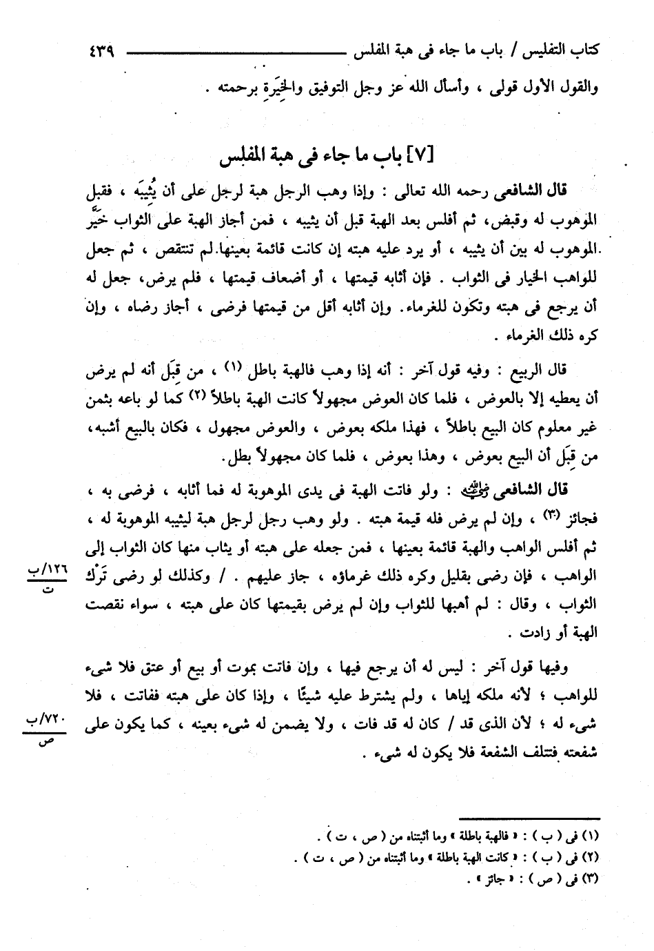 قَالَ الشَّافِعِيُّ : رحمه الله تعالى وَإِذَا وَهَبَ الرَّجُلُ هِبَةً لِرَجُلٍ عَلَى أَنْ يُثِيبَهُ فَقَبِلَ الْمَوْهُوبُ لَهُ , وَقَبَضَ ثُمَّ أَفْلَسَ بَعْدَ الْهِبَةِ قَبْلَ أَنْ يُثِيبَهُ فَمَنْ أَجَازَ الْهِبَةَ عَلَى الثَّوَابِ خَيَّرَ الْمَوْهُوبَ لَهُ بَيْنَ أَنْ يُثِيبَهُ أَوْ يَرُدَّ عَلَيْهِ هِبَتَهُ إنْ كَانَتْ قَائِمَةً بِعَيْنِهَا لَمْ تُنْتَقَصْ ثُمَّ جَعَلَ لِلْوَاهِبِ الْخِيَارَ فِي الثَّوَابِ فَإِنْ أَثَابَهُ قِيمَتَهَا أَوْ أَضْعَافَ قِيمَتِهَا فَلَمْ يَرْضَ جَعَلَ لَهُ أَنْ يَرْجِعَ فِي هِبَتِهِ وَتَكُونَ لِلْغُرَمَاءِ , وَإِنْ أَثَابَهُ أَقَلَّ مِنْ قِيمَتِهَا فَرَضِيَ أَجَازَ رِضَاهُ , وَإِنْ كَرِهَ ذَلِكَ الْغُرَمَاءُ . ( قَالَ الرَّبِيعُ ) : وَفِيهِ قَوْلٌ آخَرُ أَنَّهُ إذَا وَهَبَ فَالْهِبَةُ بَاطِلَةٌ مِنْ قِبَلِ أَنَّهُ لَمْ يَرْضَ أَنْ يُعْطِيَهُ إلَّا بِالْعِوَضِ فَلَمَّا كَانَ الْعِوَضُ مَجْهُولاً كَانَتْ الْهِبَةُ بَاطِلَةً كَمَا لَوْ بَاعَهُ بِثَمَنٍ غَيْرِ مَعْلُومٍ كَانَ الْبَيْعُ بَاطِلاً فَهَذَا مَلَكَهُ بِعِوَضٍ , وَالْعِوَضُ مَجْهُولٌ فَكَانَ بِالْبَيْعِ أَشْبَهَ مِنْ قِبَلِ أَنَّ الْبَيْعَ بِعِوَضٍ وَهَذَا بِعِوَضٍ فَلَمَّا كَانَ مَجْهُولاً بَطَلَ .
