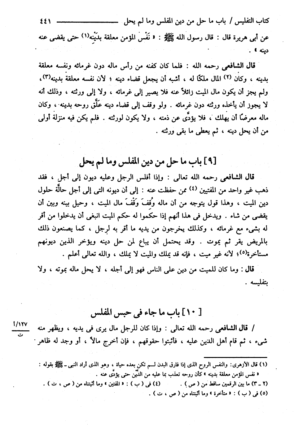 قَالَ الشَّافِعِيُّ : رحمه الله تعالى وَإِذَا أَفْلَسَ الرَّجُلُ وَعَلَيْهِ دُيُونٌ إلَى أَجَلٍ فَقَدْ ذَهَبَ غَيْرُ وَاحِدٍ مِنْ الْمُفْتِينَ مِمَّنْ حَفِظْتُ عَنْهُ إلَى أَنَّ دُيُونَهُ الَّتِي إلَى أَجَلٍ حَالَّةً حُلُولَ دَيْنِ الْمَيِّتِ وَهَذَا قَوْلٌ يَتَوَجَّهُ مِنْ أَنَّ مَالَهُ وُقِفَ وَقْفَ مَالِ الْمَيِّتِ وَحِيلَ بَيْنَهُ وَبَيْنَ أَنْ يَقْضِيَ مَنْ شَاءَ وَيَدْخُلُ فِي هَذَا أَنَّهُمْ إذَا حَكَمُوا لَهُ حُكْمَ الْمَيِّتِ انْبَغَى أَنْ يُدْخِلُوا مَنْ أَقَرَّ لَهُ بِشَيْءٍ مَعَ غُرَمَائِهِ , وَكَذَلِكَ يُخْرِجُونَ مِنْ يَدَيْهِ مَا أَقَرَّ بِهِ لِرَجُلٍ كَمَا يَصْنَعُونَ ذَلِكَ بِالْمَرِيضِ يُقِرُّ ثُمَّ يَمُوتُ , وَقَدْ يَحْتَمِلُ أَنْ يُبَاعَ لِمَنْ حَلَّ دَيْنُهُ وَيُؤَخِّرَ الَّذِينَ دُيُونُهُمْ مُتَأَخِّرَةٌ ; لِأَنَّهُ غَيْرُ مَيِّتٍ فَإِنَّهُ قَدْ يَمْلِكُ وَالْمَيِّتُ لاَ يَمْلِكُ وَاَللَّهُ تَعَالَى أَعْلَمُ . قَالَ : وَمَا كَانَ لِلْمَيِّتِ مِنْ دَيْنٍ عَلَى النَّاسِ فَهُوَ إلَى أَجَلِهِ لاَ يَحِلُّ مَالُهُ بِمَوْتِهِ , وَلاَ بِتَفْلِيسِهِ . .