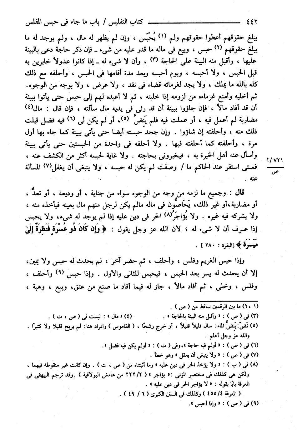 يَبْلُغُ حُقُوقَهُمْ أُعْطُوا حُقُوقَهُمْ , وَلَمْ يُحْبَسْ , وَإِنْ لَمْ يَظْهَرْ لَهُ مَالٌ , وَلَمْ يُوجَدْ لَهُ مَا يَبْلُغُ حُقُوقَهُمْ حُبِسَ وَبِيعَ فِي مَالِهِ مَا قُدِرَ عَلَيْهِ مِنْ شَيْءٍ فَإِنْ ذَكَرَ حَاجَةً دَعَا بِالْبَيِّنَةِ عَلَيْهَا وَأَقْبَلُ مِنْهُ الْبَيِّنَةَ عَلَى الْحَاجَةِ وَأَنْ لاَ شَيْءَ لَهُ إذَا كَانُوا عُدُولاً خَابِرِينَ بِهِ قَبْلَ الْحَبْسِ , وَلاَ أَحْبِسُهُ وَيَوْمَ أَحْبِسُهُ وَبَعْدَ مُدَّةٍ أَقَامَهَا فِي الْحَبْسِ وَأُحَلِّفُهُ مَعَ ذَلِكَ كُلِّهِ بِاَللَّهِ مَا يَمْلِكُ , وَلاَ يَجِدُ لِغُرَمَائِهِ قَضَاءً فِي نَقْدٍ , وَلاَ عَرَضٍ , وَلاَ بِوَجْهٍ مِنْ الْوُجُوهِ ثُمَّ أُخَلِّيهِ وَأَمْنَعُ غُرَمَاءَهُ مِنْ لُزُومِهِ إذَا خَلَّيْتُهُ ثُمَّ لاَ أُعِيدُهُ لَهُمْ إلَى حَبْسٍ حَتَّى يَأْتُوا بِبَيِّنَةٍ أَنْ قَدْ أَفَادَ مَالاً فَإِنْ جَاءُوا بِبَيِّنَةٍ أَنْ قَدْ رُئِيَ فِي يَدَيْهِ مَالٌ سَأَلْتُهُ فَإِنْ قَالَ مَالُ مُضَارَبَةٍ لَمْ أَعْمَلْ فِيهِ أَوْ عَمِلْتُ فِيهِ فَلَمْ يَنِضَّ أَوْ لَمْ يَكُنْ لِي فِيهِ فَضْلٌ قَبِلْت ذَلِكَ مِنْهُ وَأَحْلَفْتُهُ إنْ شَاءُوا , وَإِنْ جَحَدَ حَبَسْتُهُ أَيْضًا حَتَّى يَأْتِيَ بِبَيِّنَةٍ كَمَا جَاءَ بِهَا أَوَّلَ مَرَّةٍ وَأَحْلَفْتُهُ كَمَا أَحَلَفْته فِيهَا , وَلاَ أُحَلِّفُهُ فِي وَاحِدَةٍ مِنْ الْحَبْسَتَيْنِ حَتَّى يَأْتِيَ بِبَيِّنَةٍ وَأَسْأَلُ عَنْهُ أَهْلَ الْخِبْرَةِ بِهِ فَيُخْبِرُونِي بِحَاجَتِهِ , وَلاَ غَايَةَ لِحَبْسِهِ أَكْثَرَ مِنْ الْكَشْفِ عَنْهُ فَمَتَى اسْتَقَرَّ عِنْدَ الْحَاكِمِ مَا وَصَفْتُ لَمْ يَكُنْ لَهُ حَبْسُهُ , وَلاَ يَنْبَغِي أَنْ يُغْفِلَ الْمَسْأَلَةَ عَنْهُ . قَالَ وَجَمِيعُ مَا لَزِمَهُ مِنْ وَجْهٍ مِنْ الْوُجُوهِ سَوَاءٌ مِنْ جِنَايَةٍ أَوْ وَدِيعَةٍ أَوْ تَعَدٍّ أَوْ مُضَارَبَةٍ أَوْ غَيْرِ ذَلِكَ يُحَاصُّونَ فِي مَالِهِ مَا لَمْ يَكُنْ لِرَجُلٍ مِنْهُمْ مَالٌ بِعَيْنِهِ فَيَأْخُذُهُ مِنْهُ , وَلاَ يُشْرِكُهُ فِيهِ غَيْرُهُ , وَلاَ يُؤْخَذُ الْحُرُّ فِي دَيْنٍ عَلَيْهِ إذَا لَمْ يُوجَدْ لَهُ شَيْءٌ , وَلاَ يُحْبَسُ إذَا عُرِفَ أَنْ لاَ شَيْءَ لَهُ ; لِأَنَّ اللَّهَ عَزَّ وَجَلَّ يَقُولُ { وَإِنْ كَانَ ذُو عُسْرَةٍ فَنَظِرَةٌ إلَى مَيْسَرَةٍ } وَإِذَا حُبِسَ الْغَرِيمُ وَفَلِسَ وَأُحْلِفَ ثُمَّ حَضَرَ آخَرُ لَمْ يَحْدُثْ لَهُ حَبْسٌ , وَلاَ يَمِينٌ إلَّا أَنْ يَحْدُثَ لَهُ يُسْرٌ بَعْدَ الْحَبْسِ فَيُحْبَسُ لِلثَّانِي وَالْأَوَّلِ , وَإِذَا حُبِسَ وَأُحْلِفَ وَفَلِسَ وَخُلِّيَ ثُمَّ أَفَادَ مَالاً جَازَ لَهُ فِيمَا أَفَادَ مَا صَنَعَ مِنْ عِتْقٍ وَبَيْعٍ وَهِبَةٍ@