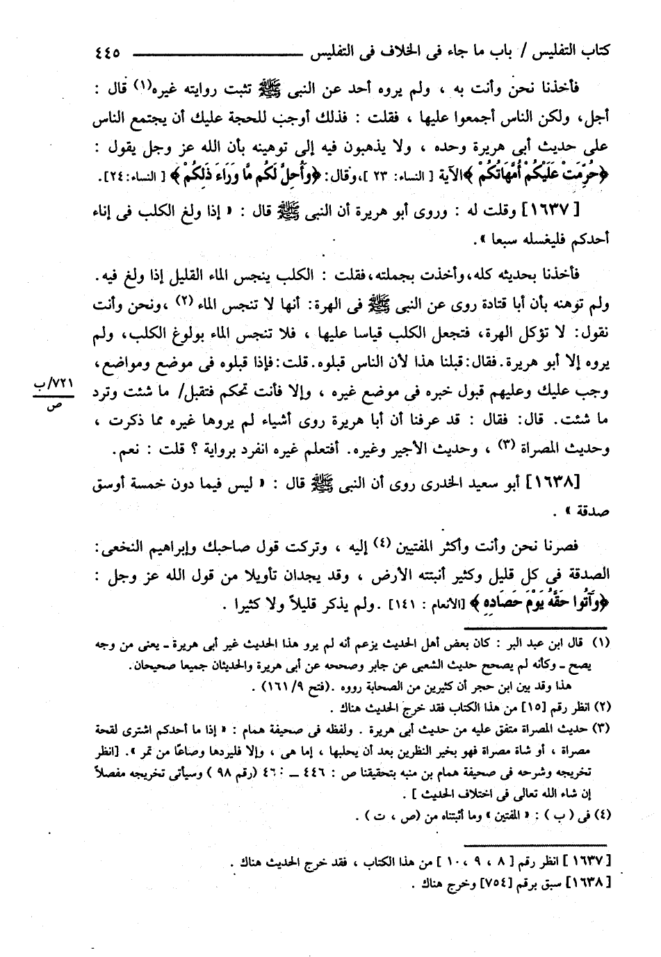 فَأَخَذْنَا نَحْنُ وَأَنْتَ بِهِ , وَلَمْ يَرْوِهِ أَحَدٌ عَنْ النَّبِيِّ - صلى الله عليه وسلم - تَثْبُتُ رِوَايَتُهُ غَيْرُهُ قَالَ أَجَلْ . وَلَكِنَّ النَّاسَ أَجْمَعُوا عَلَيْهَا فَقُلْت فَذَلِكَ أَوْجَبُ لِلْحُجَّةِ عَلَيْك أَنْ يَجْتَمِعَ النَّاسُ عَلَى حَدِيثِ أَبِي هُرَيْرَةَ وَحْدَهُ , وَلاَ يَذْهَبُونَ فِيهِ إلَى تَوْهِينِهِ بِأَنَّ اللَّهَ عَزَّ وَجَلَّ يَقُولُ { حُرِّمَتْ عَلَيْكُمْ أُمَّهَاتُكُمْ ? الآيَةَ. . وَقَالَ { وَأُحِلَّ لَكُمْ مَا وَرَاءَ ذَلِكُمْ } , وَقُلْت لَهُ وَرَوَى أَبُو هُرَيْرَةَ أَنَّ النَّبِيَّ - صلى الله عليه وسلم - قَالَ { إذَا وَلَغَ الْكَلْبُ فِي إنَاءِ أَحَدِكُمْ فَلْيَغْسِلْهُ سَبْعًا } فَأَخَذْنَا بِحَدِيثِهِ كُلِّهِ وَأَخَذْت بِجُمْلَتِهِ فَقُلْت الْكَلْبُ يُنَجِّسُ الْمَاءَ الْقَلِيلَ إذَا وَلَغَ فِيهِ , وَلَمْ تُوهِنْهُ بِأَنَّ أَبَا قَتَادَةَ رَوَى { عَنْ النَّبِيِّ - صلى الله عليه وسلم - فِي الْهِرَّةِ أَنَّهَا لاَ تُنَجِّسُ الْمَاءَ } وَنَحْنُ وَأَنْتَ نَقُولُ لاَ تُؤْكَلُ الْهِرَّةُ فَتَجْعَلُ الْكَلْبَ قِيَاسًا عَلَيْهَا فَلاَ تُنَجِّسُ الْمَاءَ بِوُلُوغِ الْكَلْبِ , وَلَمْ يَرْوِهِ إلَّا أَبُو هُرَيْرَةَ فَقَالَ قَبِلْنَا هَذَا ; لِأَنَّ النَّاسَ قَبِلُوهُ قُلْت فَإِذَا قَبِلُوهُ فِي مَوْضِعٍ وَمَوَاضِعَ وَجَبَ عَلَيْك وَعَلَيْهِمْ قَبُولُ خَبَرِهِ فِي مَوْضِعٍ غَيْرِهِ , وَإِلَّا فَأَنْتَ تَحْكُمُ فَتَقْبَلُ مَا شِئْت وَتَرُدُّ مَا شِئْت . فَقَالَ : قَدْ عَرَفْنَا أَنَّ أَبَا هُرَيْرَةَ رَوَى أَشْيَاءَ لَمْ يَرْوِهَا غَيْرُهُ مِمَّا ذَكَرْت وَحَدِيثُ الْمُصَرَّاةِ وَحَدِيثُ الْأَجِيرِ وَغَيْرِهِ أَفَتَعْلَمُ غَيْرَهُ انْفَرَدَ بِرِوَايَةٍ ؟ قُلْت نَعَمْ أَبُو سَعِيدٍ الْخُدْرِيُّ رَوَى أَنَّ النَّبِيَّ - صلى الله عليه وسلم - قَالَ { لَيْسَ فِيمَا دُونَ خَمْسَةِ أَوْسُقٍ صَدَقَةٌ } فَصِرْنَا نَحْنُ وَأَنْتَ وَأَكْثَرُ الْمُفْتِينَ إلَيْهِ وَتَرَكْتَ قَوْلَ صَاحِبِك وَإِبْرَاهِيمَ النَّخَعِيِّ الصَّدَقَةُ فِي كُلِّ قَلِيلٍ وَكَثِيرٍ أَنْبَتَتْهُ الْأَرْضُ , وَقَدْ يَجِدَانِ تَأْوِيلاً مِنْ قَوْلِ اللَّهِ عَزَّ وَجَلَّ : ? وَآتُوا حَقَّهُ يَوْمَ حَصَادِهِ } وَلَمْ يَذْكُرْ قَلِيلاً , وَلاَ كَثِيرًا@