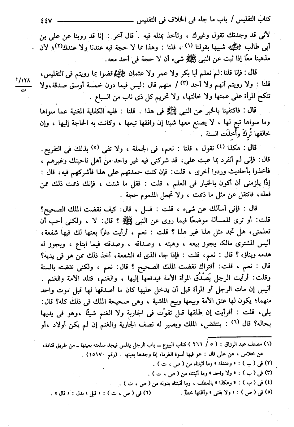 لِأَنِّي قَدْ وَجَدْتُك تَقُولُ وَغَيْرُك وَتَأْخُذُ بِمِثْلِهِ فِيهِ قَالَ آخَرُ إنَّا قَدْ رَوَيْنَا عَنْ عَلِيِّ بْنِ أَبِي طَالِبٍ رضي الله عنه شَبِيهًا بِقَوْلِنَا قُلْنَا وَهَذَا مِمَّا لاَ حُجَّةَ فِيهِ عِنْدَنَا وَعِنْدَك ; لِأَنَّ مَذْهَبَنَا مَعًا إذَا ثَبَتَ عَنْ النَّبِيِّ - صلى الله عليه وسلم - شَيْءٌ أَنْ لاَ حُجَّةَ فِي أَحَدٍ مَعَهُ . قَالَ : فَإِنَّا قُلْنَا لَمْ نَعْلَمْ أَبَا بَكْرٍ , وَلاَ عُمَرَ , وَلاَ عُثْمَانَ رضي الله عنهم قَضَوْا بِمَا رَوَيْتُمْ فِي التَّفْلِيسِ قُلْنَا , وَلاَ رَوَيْتُمْ أَنَّهُمْ , وَلاَ وَاحِدٌ مِنْهُمْ قَالَ { لَيْسَ فِيمَا دُونَ خَمْسَةِ أَوْسُقٍ صَدَقَةٌ } { , وَلاَ تُنْكَحُ الْمَرْأَةُ عَلَى عَمَّتِهَا وَلاَ خَالَتِهَا } , وَلاَ تَحْرِيمَ كُلِّ ذِي نَابٍ مِنْ السِّبَاعِ . قَالَ فَاكْتَفَيْنَا بِالْخَبَرِ عَنْ النَّبِيِّ - صلى الله عليه وسلم - فِي هَذَا . قُلْنَا فَفِيهِ الْكِفَايَةُ الْمُغْنِيَةُ عَمَّا سِوَاهَا وَمَا سِوَاهَا تَبَعٌ لَهَا لاَ يَصْنَعُ مَعَهَا شَيْئًا إنْ وَافَقَهَا تَبَعُهَا , وَكَانَتْ بِهِ الْحَاجَةُ إلَيْهَا , وَإِنْ خَالَفَهَا تُرِكَ وَأُخِذَتْ السُّنَّةُ قَالَ وَهَكَذَا نَقُولُ . قُلْنَا : نَعَمْ فِي الْجُمْلَةِ , وَلاَ تَفِي بِذَلِكَ فِي التَّفْرِيعِ قَالَ فَإِنِّي لَمْ أَنْفَرِدْ بِمَا عِبْتَ عَلَيَّ قَدْ شَرِكَنِي فِيهِ غَيْرُ وَاحِدٍ مِنْ أَهْلِ نَاحِيَتِك وَغَيْرِهِمْ فَأَخَذُوا بِأَحَادِيثَ وَرَدُّوا أُخْرَى . قُلْت : فَإِنْ كُنْتَ حَمِدْتَهُمْ عَلَى هَذَا فَأَشْرِكْهُمْ فِيهِ . قَالَ : إذَا يَلْزَمُنِي أَنْ أَكُونَ بِالْخِيَارِ فِي الْعِلْمِ . قُلْت : فَقُلْ مَا شِئْتَ فَإِنَّك ذَمَمْتَ ذَلِكَ مِمَّنْ فَعَلَهُ فَانْتَقِلْ عَنْ مِثْلِ مَا ذَمَمْتَ , وَلاَ تَجْعَلْ الْمَذْمُومَ حُجَّةً . قَالَ : فَإِنِّي أَسْأَلُك عَنْ شَيْءٍ . قُلْت : فَسَلْ قَالَ كَيْفَ نَقَضْتَ الْمِلْكَ الصَّحِيحَ ؟ قُلْت أَوَتَرَى لِلْمَسْأَلَةِ مَوْضِعًا فِيمَا رُوِيَ عَنْ النَّبِيِّ - صلى الله عليه وسلم - , قَالَ لاَ , وَلَكِنِّي أُحِبُّ أَنْ تُعَلِّمَنِي هَلْ تَجِدُ مِثْلَ هَذَا غَيْرَ هَذَا ؟ . قُلْت : نَعَمْ أَرَأَيْتَ دَارًا بِعْتهَا لَك فِيهَا شُفْعَةٌ أَلَيْسَ الْمُشْتَرِي مَالِكًا يَجُوزُ بَيْعُهُ وَهِبَتُهُ وَصَدَاقُهُ وَصَدَقَتُهُ فِيمَا ابْتَاعَ , وَيَجُوزُ لَهُ هَدْمُهُ وَبِنَاؤُهُ ؟ قَالَ : نَعَمْ . قُلْت : فَإِذَا جَاءَ الَّذِي لَهُ الشُّفْعَةُ أَخَذَ ذَلِكَ مِمَّنْ هُوَ فِي يَدَيْهِ ؟ قَالَ نَعَمْ قُلْت أَفَتَرَاك نَقَضْتَ الْمِلْكَ الصَّحِيحَ ؟ قَالَ نَعَمْ , وَلَكِنِّي نَقَضْته بِالسُّنَّةِ وَقُلْت أَرَأَيْت الرَّجُلَ يُصْدِقُ الْمَرْأَةَ الْأَمَةَ فَيَدْفَعُهَا إلَيْهَا وَالْغَنَمَ فَتَلِدُ الْأَمَةُ وَالْغَنَمُ أَلَيْسَ إنْ مَاتَ الرَّجُلُ أَوْ الْمَرْأَةُ قَبْلَ أَنْ يَدْخُلَ عَلَيْهَا كَانَ مَا أَصْدَقهَا لَهَا قَبْلَ مَوْتِ وَاحِدٍ مِنْهُمَا يَكُونُ لَهَا عِتْقُ الْأَمَةِ وَبَيْعُهَا وَبَيْعُ الْمَاشِيَةِ وَهِيَ صَحِيحَةُ الْمِلْكِ فِي ذَلِكَ كُلِّهِ ؟ . قَالَ : بَلَى قُلْت : أَفَرَأَيْتَ إنْ طَلَّقَهَا قَبْلَ تَفُوتُ فِي الْجَارِيَةِ , وَلاَ الْغَنَمِ شَيْئًا وَهُوَ فِي يَدَيْهَا بِحَالِهِ ؟ . قَالَ : يُنْتَقَضُ الْمِلْكُ وَيَصِيرُ لَهُ نِصْفُ الْجَارِيَةِ وَالْغَنَمِ إنْ لَمْ يَكُنْ أَوْلاَدٌ أَوْ@