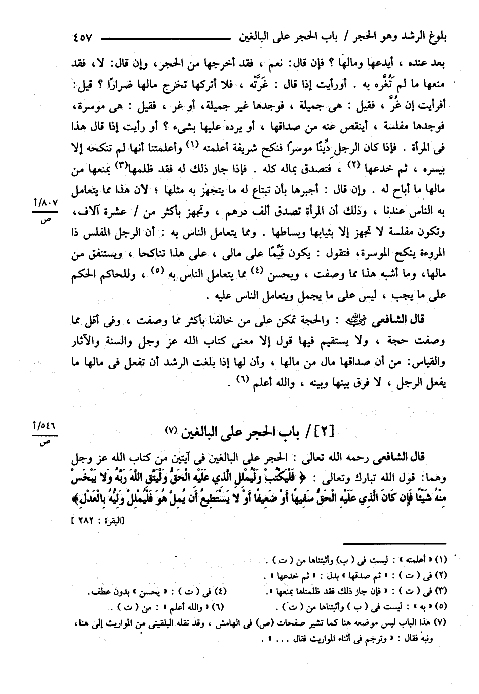قَالَ الشَّافِعِيُّ: رحمه الله تعالى: الْحَجْرُ عَلَى الْبَالِغِينَ فِي آيَتَيْنِ مِنْ كِتَابِ اللَّهِ عَزَّ وَجَلَّ وَهُمَا قَوْلُ اللَّهِ تَبَارَكَ وَتَعَالَى {فَلْيَكْتُبْ وَلْيُمْلِلْ الَّذِي عَلَيْهِ الْحَقُّ وَلْيَتَّقِ اللَّهَ رَبَّهُ وَلاَ يَبْخَسْ مِنْهُ شَيْئًا فَإِنْ كَانَ الَّذِي عَلَيْهِ الْحَقُّ سَفِيهًا أَوْ ضَعِيفًا أَوْ لاَ يَسْتَطِيعُ أَنْ يُمِلَّ هُوَ فَلْيُمْلِلْ وَلِيُّهُ بِالْعَدْلِ}.@