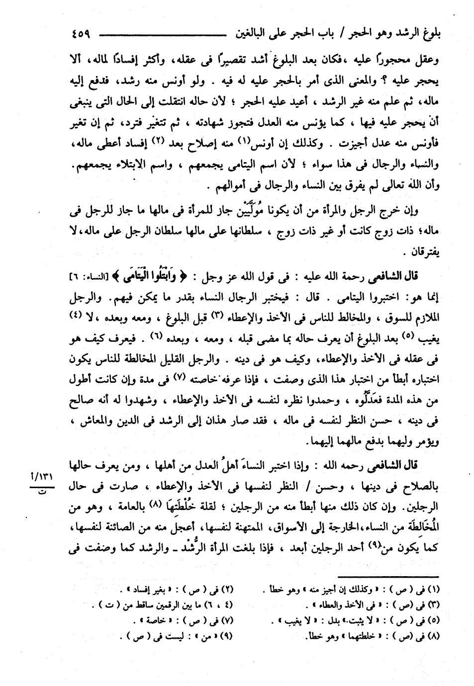 قَالَ الشَّافِعِيُّ : وَإِذَا اخْتَبَرَ النِّسَاءَ أَهْلُ الْعَدْلِ مَنْ أَهْلِهَا وَمِنْ يَعْرِفُ حَالَهَا بِالصَّلاَحِ فِي دِينِهَا وَحُسْنَ النَّظَرِ لِنَفْسِهَا فِي الْأَخْذِ وَالْإِعْطَاءِ صَارَتْ فِي حَالِ الرَّجُلَيْنِ وَإِنْ كَانَ ذَلِكَ مِنْهَا أَبْطَأَ مِنْهُ مِنْ الرَّجُلَيْنِ لِقِلَّةِ خِلْطَتِهَا بِالْعَامَّةِ وَهُوَ مِنْ الْمُخَالَطَةِ مِنْ النِّسَاءِ الْخَارِجَةِ إلَى الْأَسْوَاقِ الْمُمْتَهِنَةِ لِنَفْسِهَا أَعْجَلُ مِنْهُ مِنْ الصَّائِنَةِ لِنَفْسِهَا كَمَا يَكُونُ مِنْ أَحَدِ الرَّجُلَيْنِ أَبْعَدَ فَإِذَا بَلَغَتْ الْمَرْأَةُ الرُّشْدَ وَالرُّشْدُ كَمَا وَصَفْت فِي@