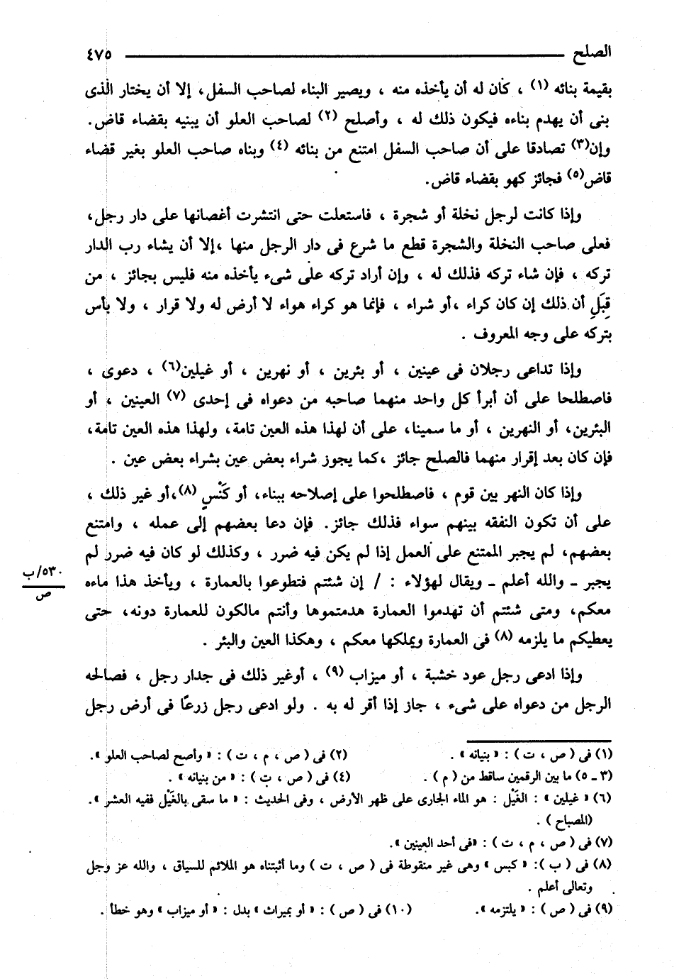 بِقِيمَةِ بِنَائِهِ كَانَ لَهُ أَنْ يَأْخُذَهُ مِنْهُ وَيَصِيرُ الْبِنَاءُ لِصَاحِبِ السُّفْلِ إلَّا أَنْ يَخْتَارَ الَّذِي بَنَى أَنْ يَهْدِمَ بِنَاءَهُ فَيَكُونَ ذَلِكَ لَهُ , وَأَصْلَحُ لِصَاحِبِ الْعُلُوِّ أَنْ يَبْنِيَهُ بِقَضَاءِ قَاضٍ . وَإِنْ تَصَادَقَا عَلَى أَنَّ صَاحِبَ السُّفْلِ امْتَنَعَ مِنْ بِنَائِهِ وَبَنَاهُ صَاحِبُ الْعُلُوِّ بِغَيْرِ قَضَاءِ قَاضٍ فَجَائِزٌ كَهُوَ بِقَضَاءِ قَاضٍ وَإِذَا كَانَتْ لِرَجُلٍ نَخْلَةٌ أَوْ شَجَرَةٌ فَاسْتَعْلَتْ حَتَّى انْتَشَرَتْ أَغْصَانُهَا عَلَى دَارِ رَجُلٍ فَعَلَى صَاحِبِ النَّخْلَةِ وَالشَّجَرَةِ قَطْعُ مَا شَرَعَ فِي دَارِ الرَّجُلِ مِنْهَا إلَّا أَنْ يَشَاءَ رَبُّ الدَّارِ تَرْكَهُ فَإِنْ شَاءَ تَرْكَهُ فَذَلِكَ لَهُ وَإِنْ أَرَادَ تَرْكَهُ عَلَى شَيْءٍ يَأْخُذُهُ مِنْهُ فَلَيْسَ بِجَائِزٍ مِنْ قِبَلِ أَنَّ ذَلِكَ إنْ كَانَ كِرَاءً أَوْ شِرَاءً فَإِنَّمَا هُوَ كِرَاءُ هَوَاءٍ لاَ أَرْضَ لَهُ , وَلاَ قَرَارَ , وَلاَ بَأْسَ بِتَرْكِهِ عَلَى وَجْهِ الْمَعْرُوفِ وَإِذَا تَدَاعَى رَجُلاَنِ فِي عَيْنَيْنِ أَوْ بِئْرَيْنِ أَوْ نَهْرَيْنِ أَوْ غِيلَيْنِ دَعْوَى فَاصْطَلَحَا عَلَى أَنْ أَبْرَأَ كُلُّ وَاحِدٍ مِنْهُمَا صَاحِبَهُ مَنْ دَعْوَاهُ فِي إحْدَى الْعَيْنَيْنِ أَوْ الْبِئْرَيْنِ أَوْ النَّهْرَيْنِ أَوْ مَا سَمَّيْنَا عَلَى أَنَّ لِهَذَا هَذِهِ الْعَيْنَ تَامَّةً وَلِهَذَا هَذِهِ الْعَيْنَ تَامَّةً فَإِنْ كَانَ بَعْدَ إقْرَارٍ مِنْهُمَا فَالصُّلْحُ جَائِزٌ كَمَا يَجُوزُ شِرَاءُ بَعْضِ عَيْنٍ بِشِرَاءِ بَعْضِ عَيْنٍ وَإِذَا كَانَ النَّهْرُ بَيْنَ قَوْمٍ فَاصْطَلَحُوا عَلَى إصْلاَحِهِ بِبِنَاءٍ أَوْ كَبْسٍ أَوْ غَيْرِ ذَلِكَ عَلَى أَنْ تَكُونَ النَّفَقَةُ بَيْنَهُمْ سَوَاءً فَذَلِكَ جَائِزٌ فَإِنْ دَعَا بَعْضُهُمْ إلَى عَمَلِهِ وَامْتَنَعَ بَعْضُهُمْ لَمْ يُجْبَرْ الْمُمْتَنِعُ عَلَى الْعَمَلِ إذَا لَمْ يَكُنْ فِيهِ ضَرَرٌ وَكَذَلِكَ لَوْ كَانَ فِيهِ ضَرَرٌ لَمْ يُجْبَرْ وَاَللَّهُ أَعْلَمُ . وَيُقَالُ لِهَؤُلاَءِ إنْ شِئْتُمْ فَتَطَوَّعُوا بِالْعِمَارَةِ وَيَأْخُذُ هَذَا مَاءَهُ مَعَكُمْ وَمَتَى شِئْتُمْ أَنْ تَهْدِمُوا الْعِمَارَةَ هَدَمْتُمُوهَا , وَأَنْتُمْ مَالِكُونَ لِلْعِمَارَةِ دُونَهُ حَتَّى يُعْطِيَكُمْ مَا يَلْزَمُهُ فِي الْعِمَارَةِ وَيَمْلِكُهَا مَعَكُمْ , وَهَكَذَا الْعَيْنُ وَالْبِئْرُ , وَإِذَا ادَّعَى رَجُلٌ عُودَ خَشَبَةٍ أَوْ مِيزَابٍ أَوْ غَيْرِ ذَلِكَ فِي جِدَارِ رَجُلٍ فَصَالَحَهُ الرَّجُلُ مِنْ دَعْوَاهُ عَلَى شَيْءٍ جَازَ إذَا أَقَرَّ لَهُ بِهِ . وَلَوْ ادَّعَى رَجُلٌ زَرْعًا فِي أَرْضِ رَجُلٍ@