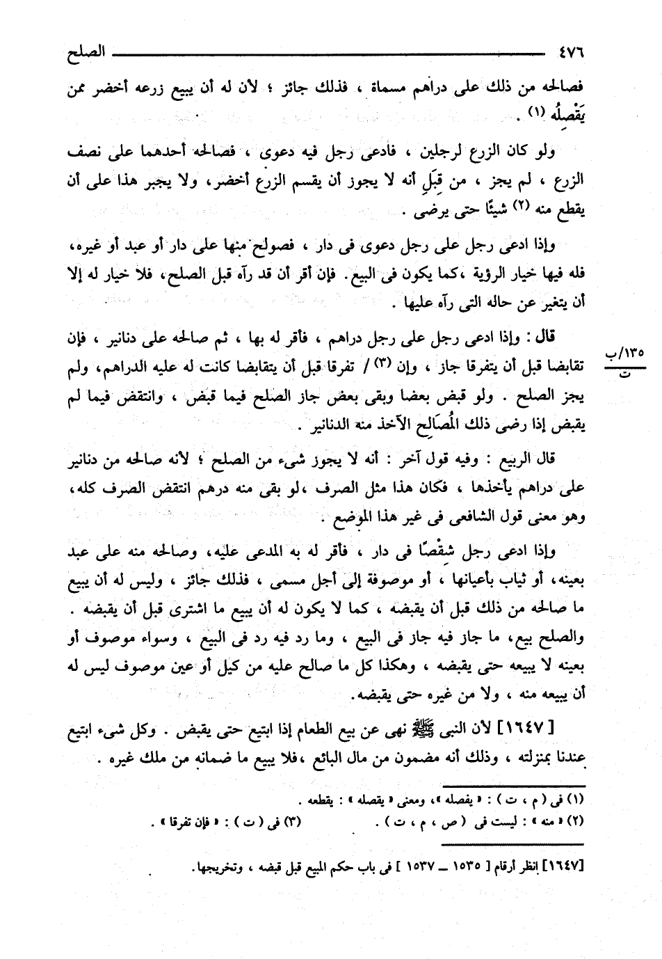فَصَالَحَهُ مِنْ ذَلِكَ عَلَى دَرَاهِمَ مُسَمَّاةٍ فَذَلِكَ جَائِزٌ ; لِأَنَّ لَهُ أَنْ يَبِيعَ زَرْعَهُ أَخْضَرَ مِمَّنْ يَقْصِلُهُ , وَلَوْ كَانَ الزَّرْعُ لِرَجُلَيْنِ فَادَّعَى رَجُلٌ فِيهِ دَعْوَى فَصَالَحَهُ أَحَدُهُمَا عَلَى نِصْفِ الزَّرْعِ لَمْ يَجُزْ مِنْ قِبَلِ أَنَّهُ لاَ يَجُوزُ أَنْ يَقْسِمَ الزَّرْعَ أَخْضَرَ , وَلاَ يُجِيزُ هَذَا عَلَى أَنْ يَقْطَعَ مِنْهُ شَيْئًا حَتَّى يَرْضَى وَإِذَا ادَّعَى رَجُلٌ عَلَى رَجُلٍ دَعْوَى فِي دَارٍ فَصُولِحَ مِنْهَا عَلَى دَارٍ أَوْ بُعْدٍ أَوْ غَيْرِهِ فَلَهُ فِيهَا خِيَارُ الرُّؤْيَةِ كَمَا يَكُونُ فِي الْبَيْعِ فَإِنْ أَقَرَّ أَنْ قَدْ رَآهُ قَبْلَ الصُّلْحِ فَلاَ خِيَارَ لَهُ إلَّا أَنْ يَتَغَيَّرَ عَنْ حَالِهِ الَّتِي رَآهُ عَلَيْهَا . قَالَ وَإِذَا ادَّعَى رَجُلٌ عَلَى رَجُلٍ دَرَاهِمَ فَأَقَرَّ لَهُ بِهَا ثُمَّ صَالَحَهُ عَلَى دَنَانِيرَ فَإِنْ تَقَابَضَا قَبْلَ أَنْ يَتَفَرَّقَا جَازَ , وَإِنْ تَفَرَّقَا قَبْلَ أَنْ يَتَقَابَضَا كَانَتْ لَهُ عَلَيْهِ الدَّرَاهِمُ , وَلَمْ يَجُزْ الصُّلْحُ , وَلَوْ قَبَضَ بَعْضًا وَبَقِيَ بَعْضٌ جَازَ الصُّلْحُ فِيمَا قَبَضَ وَانْتَقَضَ فِيمَا لَمْ يَقْبِضْ إذَا رَضِيَ ذَلِكَ الْمُصَالِحُ الْآخِذُ مِنْهُ الدَّنَانِيرَ . ( قَالَ الرَّبِيعُ ) : وَفِيهِ قَوْلٌ آخَرُ أَنَّهُ لاَ يَجُوزُ شَيْءٌ مِنْ الصُّلْحِ ; لِأَنَّهُ صَالَحَهُ مِنْ دَنَانِيرَ عَلَى دَرَاهِمَ يَأْخُذُهَا فَكَانَ هَذَا مِثْلَ الصَّرْفِ لَوْ بَقِيَ مِنْهُ دِرْهَمٌ انْتَقَضَ الصَّرْفُ كُلُّهُ وَهُوَ مَعْنَى قَوْلِ الشَّافِعِيُّ فِي غَيْرِ هَذَا الْمَوْضِعِ : وَإِذَا ادَّعَى رَجُلٌ شِقْصًا فِي دَارٍ فَأَقَرَّ لَهُ بِهِ الْمُدَّعَى عَلَيْهِ وَصَالَحَهُ مِنْهُ عَلَى عَبْدٍ بِعَيْنِهِ أَوْ ثِيَابٍ بِأَعْيَانِهَا أَوْ مَوْصُوفَةٍ إلَى أَجَلٍ مُسَمًّى فَذَلِكَ جَائِزٌ , وَلَيْسَ لَهُ أَنْ يَبِيعَ مَا صَالَحَهُ مِنْ ذَلِكَ قَبْلَ أَنْ يَقْبِضَهُ كَمَا لاَ يَكُونُ لَهُ أَنْ يَبِيعَ مَا اشْتَرَى قَبْلَ أَنْ يَقْبِضَهُ , وَالصُّلْحُ بَيْعٌ مَا جَازَ فِيهِ جَازَ فِي الْبَيْعِ وَمَا رُدَّ فِيهِ رُدَّ فِي الْبَيْعِ , وَسَوَاءٌ مَوْصُوفٌ أَوْ بِعَيْنِهِ لاَ يَبِيعُهُ حَتَّى يَقْبِضَهُ وَهَكَذَا كُلُّ مَا صَالَحَ عَلَيْهِ مِنْ كَيْلٍ أَوْ عَيْنٍ مَوْصُوفٍ لَيْسَ لَهُ أَنْ يَبِيعَهُ مِنْهُ , وَلاَ مِنْ غَيْرِهِ حَتَّى يَقْبِضَهُ ; لِأَنَّ { النَّبِيَّ - صلى الله عليه وسلم - نَهَى عَنْ بَيْعِ الطَّعَامِ إذَا اُبْتِيعَ حَتَّى يُقْبَضَ } وَكُلُّ شَيْءٍ اُبْتِيعَ عِنْدَنَا بِمَنْزِلَتِهِ وَذَلِكَ أَنَّهُ مَضْمُونٌ مِنْ مَالِ الْبَائِعِ فَلاَ يَبِيعُ مَا ضَمَانُهُ مِنْ مِلْكِ غَيْرِهِ .@