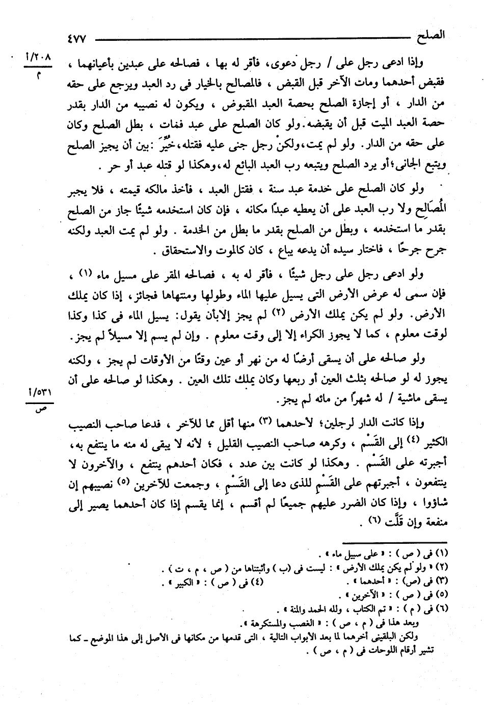وَإِذَا ادَّعَى رَجُلٌ عَلَى رَجُلٍ دَعْوَى فَأَقَرَّ لَهُ بِهَا فَصَالَحَهُ عَلَى عَبْدَيْنِ بِأَعْيَانِهِمَا فَقَبَضَ أَحَدَهُمَا وَمَاتَ الْآخَرُ قَبْلَ الْقَبْضِ فَالْمُصَالِحُ بِالْخِيَارِ فِي رَدِّ الْعَبْدِ وَيَرْجِعُ عَلَى حَقِّهِ مِنْ الدَّارِ أَوْ إجَازَةِ الصُّلْحِ بِحِصَّةِ الْعَبْدِ الْمَقْبُوضِ وَيَكُونُ لَهُ نَصِيبُهُ مِنْ الدَّارِ بِقَدْرِ حِصَّةِ الْعَبْدِ الْمَيِّتِ قَبْلَ أَنْ يَقْبِضَهُ , وَلَوْ كَانَ الصُّلْحُ عَلَى عَبْدٍ فَمَاتَ بَطَلَ الصُّلْحُ وَكَانَ عَلَى حَقِّهِ مِنْ الدَّارِ , وَلَوْ لَمْ يَمُتْ وَلَكِنَّ رَجُلاً جَنَى عَلَيْهِ فَقَتَلَهُ خُيِّرَ بَيْنَ أَنْ يُجِيزَ الصُّلْحَ وَيَتْبَعَ الْجَانِيَ أَوْ يَرُدَّ الصُّلْحَ وَيَتْبَعَهُ رَبُّ الْعَبْدِ الْبَائِعُ لَهُ . وَهَكَذَا لَوْ قَتَلَهُ عَبْدٌ أَوْ حُرٌّ . وَلَوْ كَانَ الصُّلْحُ عَلَى خِدْمَةِ عَبْدٍ سَنَةً فَقُتِلَ الْعَبْدُ فَأَخَذَ مَالِكُهُ قِيمَتَهُ فَلاَ يُجْبَرُ الْمُصَالَحُ وَلاَ رَبُّ الْعَبْدِ عَلَى أَنْ يُعْطِيَهُ عَبْدًا مَكَانَهُ فَإِنْ كَانَ اسْتَخْدَمَهُ شَيْئًا جَازَ مِنْ الصُّلْحِ بِقَدْرِ مَا اسْتَخْدَمَهُ وَبَطَلَ مِنْ الصُّلْحِ بِقَدْرِ مَا بَطَلَ مِنْ الْخِدْمَةِ , وَلَوْ لَمْ يَمُتْ الْعَبْدُ وَلَكِنَّهُ جُرِحَ جُرْحًا فَاخْتَارَ سَيِّدُهُ أَنْ يَدَعَهُ يُبَاعُ كَانَ كَالْمَوْتِ وَالِاسْتِحْقَاقِ . وَلَوْ ادَّعَى رَجُلٌ عَلَى رَجُلٍ شَيْئًا فَأَقَرَّ لَهُ بِهِ فَصَالَحَهُ الْمُقِرُّ عَلَى مَسِيلِ مَاءٍ فَإِنْ سَمَّى لَهُ عَرْضَ الْأَرْضِ الَّتِي يَسِيلُ عَلَيْهَا الْمَاءُ وَطُولَهَا وَمُنْتَهَاهَا فَجَائِزٌ إذَا كَانَ يَمْلِكُ الْأَرْضَ لَمْ يَجُزْ إلَّا بِأَنْ يَقُولَ يَسِيلُ الْمَاءُ فِي كَذَا وَكَذَا لِوَقْتٍ مَعْلُومٍ كَمَا لاَ يَجُوزُ الْكِرَاءُ إلَّا إلَى وَقْتٍ مَعْلُومٍ وَإِنْ لَمْ يُسَمِّ إلَّا مَسِيلاً لَمْ يَجُزْ , وَلَوْ صَالَحَهُ عَلَى أَنْ يَسْقِيَ أَرْضًا لَهُ مِنْ نَهْرٍ أَوْ عَيْنٍ وَقْتًا مِنْ الْأَوْقَاتِ لَمْ يَجُزْ , وَلَكِنَّهُ يَجُوزُ لَهُ لَوْ صَالَحَهُ بِثُلُثِ الْعَيْنِ أَوْ رُبُعِهَا وَكَانَ يَمْلِكُ تِلْكَ الْعَيْنِ . وَهَكَذَا لَوْ صَالَحَهُ عَلَى أَنْ يَسْقِيَ مَاشِيَةً لَهُ شَهْرًا مِنْ مَائِهِ لَمْ يَجُزْ . وَإِذَا كَانَتْ الدَّارُ لِرَجُلَيْنِ لِأَحَدِهِمَا مِنْهَا أَقَلُّ مِمَّا لِلْآخَرِ فَدَعَا صَاحِبُ النَّصِيبِ الْكَثِيرِ إلَى الْقَسْمِ وَكَرِهَهُ صَاحِبُ النَّصِيبِ الْقَلِيلِ ; لِأَنَّهُ لاَ يَبْقَى لَهُ مِنْهُ مَا يَنْتَفِعُ بِهِ أَجْبَرْته عَلَى الْقَسْمِ وَهَكَذَا لَوْ كَانَتْ بَيْنَ عَدَدٍ فَكَانَ أَحَدُهُمْ يَنْتَفِعُ وَالْآخَرُونَ لاَ يَنْتَفِعُونَ أَجْبَرْتهمْ عَلَى الْقَسْمِ لِلَّذِي دَعَا إلَى الْقَسْمِ وَجَمَعْت لِلْآخَرِينَ نَصِيبَهُمْ إنْ شَاءُوا , وَإِذَا كَانَ الضَّرَرُ عَلَيْهِمْ جَمِيعًا إنَّمَا يُقْسَمُ إذَا كَانَ أَحَدُهُمْ يَصِيرُ إلَى مَنْفَعَةٍ وَإِنْ قَلَّتْ .@