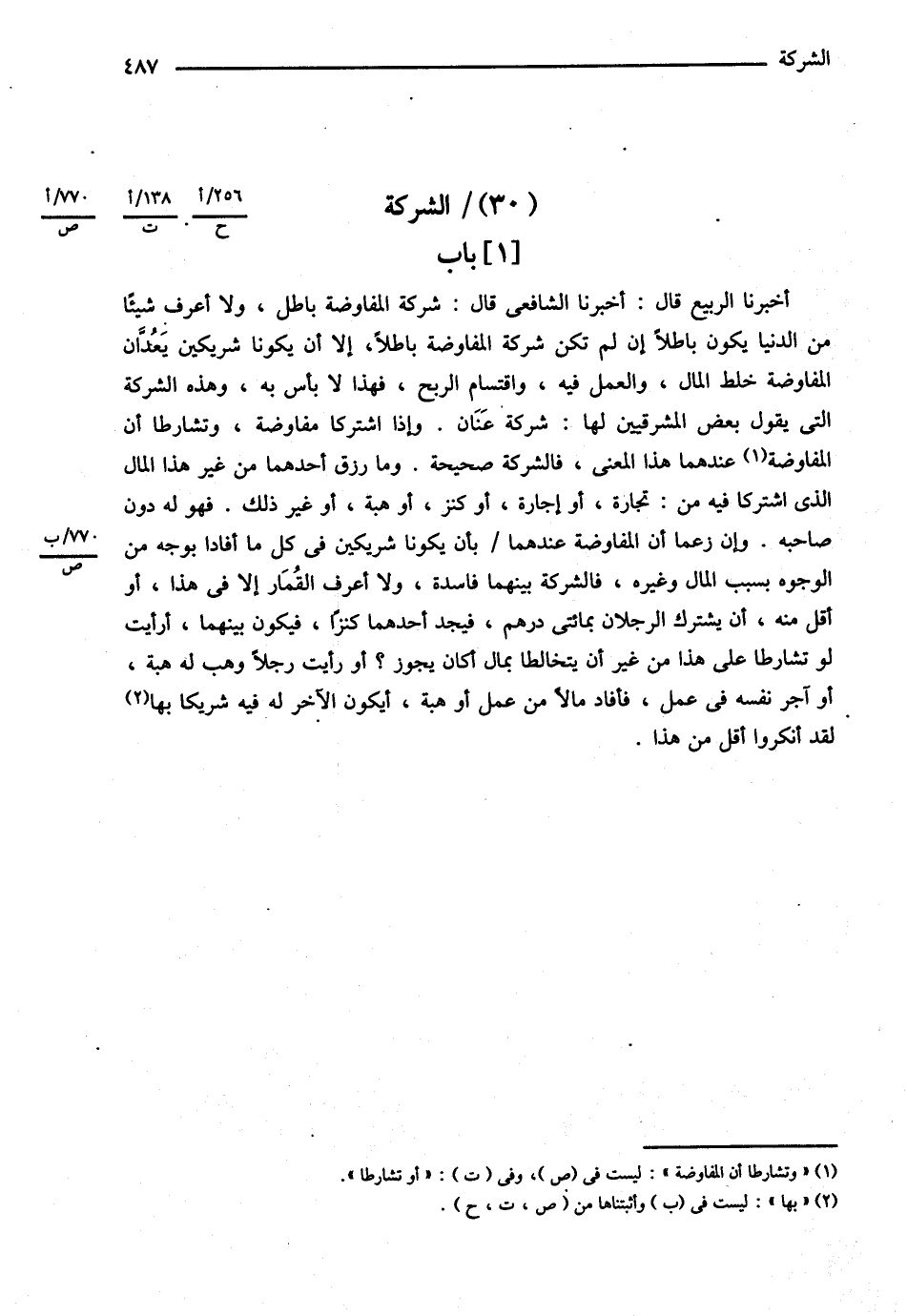 الشَّرِكَةُ . ( أَخْبَرَنَا الرَّبِيعُ ) : قَالَ أَخْبَرَنَا الشَّافِعِيُّ قَالَ : شَرِكَةُ الْمُفَاوَضَةِ بَاطِلٌ , وَلاَ أَعْرِفُ شَيْئًا مِنْ الدُّنْيَا يَكُونُ بَاطِلاً إنْ لَمْ تَكُنْ شَرِكَةُ الْمُفَاوَضَةِ بَاطِلاً إلَّا أَنْ يَكُونَا شَرِيكَيْنِ يَعُدَّانِ الْمُفَاوَضَةَ خَلْطَ الْمَالِ وَالْعَمَلَ فِيهِ وَاقْتِسَامَ الرِّبْحِ فَهَذَا لاَ بَأْسَ بِهِ وَهَذِهِ الشَّرِكَةُ الَّتِي يَقُولُ بَعْضُ الْمَشْرِقِيِّينَ لَهَا شَرِكَةُ عَنَانٍ وَإِذَا اشْتَرَكَا مُفَاوَضَةً وَتَشَارَطَا أَنَّ الْمُفَاوَضَةَ عِنْدَهُمَا هَذَا الْمَعْنَى فَالشَّرِكَةُ صَحِيحَةٌ وَمَا رُزِقَ أَحَدُهُمَا مِنْ غَيْرِ هَذَا الْمَالِ الَّذِي اشْتَرَكَا فِيهِ مِنْ تِجَارَةٍ أَوْ إجَارَةٍ أَوْ كَنْزٌ أَوْ هِبَةٍ أَوْ غَيْرِ ذَلِكَ فَهُوَ لَهُ دُونَ صَاحِبِهِ , وَإِنْ زَعَمَا أَنَّ الْمُفَاوَضَةَ عِنْدَهُمَا بِأَنْ يَكُونَا شَرِيكَيْنِ فِي كُلِّ مَا أَفَادَا بِوَجْهٍ مِنْ الْوُجُوهِ بِسَبَبِ الْمَالِ وَغَيْرِهِ فَالشَّرِكَةُ بَيْنَهُمَا فَاسِدَةٌ , وَلاَ أَعْرِفُ الْقِمَارَ إلَّا فِي هَذَا أَوْ أَقَلَّ مِنْهُ أَنْ يَشْتَرِكَ الرَّجُلاَنِ بِمِائَتَيْ دِرْهَمٍ فَيَجِدَ أَحَدُهُمَا كَنْزًا فَيَكُونَ بَيْنَهُمَا . أَرَأَيْتَ لَوْ تَشَارَطَا عَلَى هَذَا مِنْ غَيْرِ أَنْ يَتَخَالَطَا بِمَالٍ أَكَانَ يَجُوزُ ؟ أَوْ أَرَأَيْت رَجُلاً وُهِبَ لَهُ هِبَةٌ أَوْ آجَرَ نَفْسَهُ فِي عَمَلٍ فَأَفَادَ مَالاً مِنْ عَمَلٍ أَوْ هِبَةٍ أَيَكُونُ الْآخَرُ لَهُ فِيهِ شَرِيكًا ؟ لَقَدْ أَنْكَرُوا أَقَلَّ مِنْ هَذَا .@