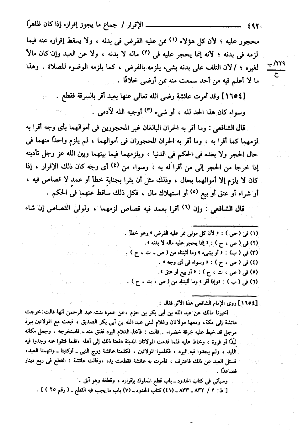 مَحْجُورٍ عَلَيْهِ ; لِأَنَّ كُلَّ هَؤُلاَءِ مِمَّنْ عَلَيْهِ الْفَرْضُ فِي بَدَنِهِ , وَلاَ يَسْقُطُ إقْرَارُهُ عَنْهُ فِيمَا لَزِمَهُ فِي بَدَنِهِ ; لِأَنَّهُ إنَّمَا يُحْجَرُ عَلَيْهِ فِي مَالِهِ لاَ بَدَنِهِ , وَلاَ عَنْ الْعَبْدِ وَإِنْ كَانَ مَالاً لِغَيْرِهِ ; لِأَنَّ التَّلَفَ عَلَى بَدَنِهِ بِشَيْءٍ يَلْزَمُهُ بِالْفَرْضِ كَمَا يَلْزَمُهُ الْوُضُوءُ لِلصَّلاَةِ وَهَذَا مَا لاَ أَعْلَمُ فِيهِ مِنْ أَحَدٍ سَمِعْت مِنْهُ مِمَّنْ أَرْضَى خِلاَفًا وَقَدْ أَمَرَتْ عَائِشَةُ رضي الله تعالى عنها بِعَبْدٍ أَقَرَّ بِالسَّرِقَةِ فَقُطِعَ وَسَوَاءٌ كَانَ هَذَا الْحَدُّ لِلَّهِ أَوْ بِشَيْءٍ أَوْجَبَهُ اللَّهُ لِآدَمِيٍّ .