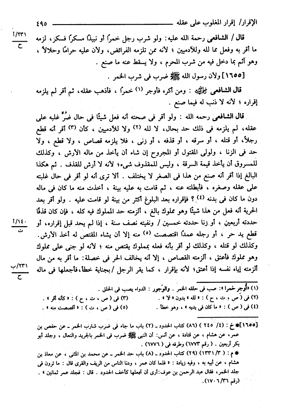 قَالَ الشَّافِعِيُّ : وَلَوْ شَرِبَ رَجُلٌ خَمْرًا أَوْ نَبِيذًا مُسْكِرًا فَسَكِرَ لَزِمَهُ مَا أَقَرَّ بِهِ وَفَعَلَ مِمَّا لِلَّهِ وَلِلْآدَمِيِّينَ ; لِأَنَّهُ مِمَّنْ تَلْزَمُهُ الْفَرَائِضُ ; وَلِأَنَّ عَلَيْهِ حَرَامًا وَحَلاَلاً وَهُوَ آثِمٌ بِمَا دَخَلَ فِيهِ مِنْ شُرْبِ الْمُحَرَّمِ , وَلاَ يَسْقُطُ عَنْهُ مَا صَنَعَ ; وَلِأَنَّ رَسُولَ اللَّهِ - صلى الله عليه وسلم - ضَرَبَ فِي شُرْبِ الْخَمْرِ .