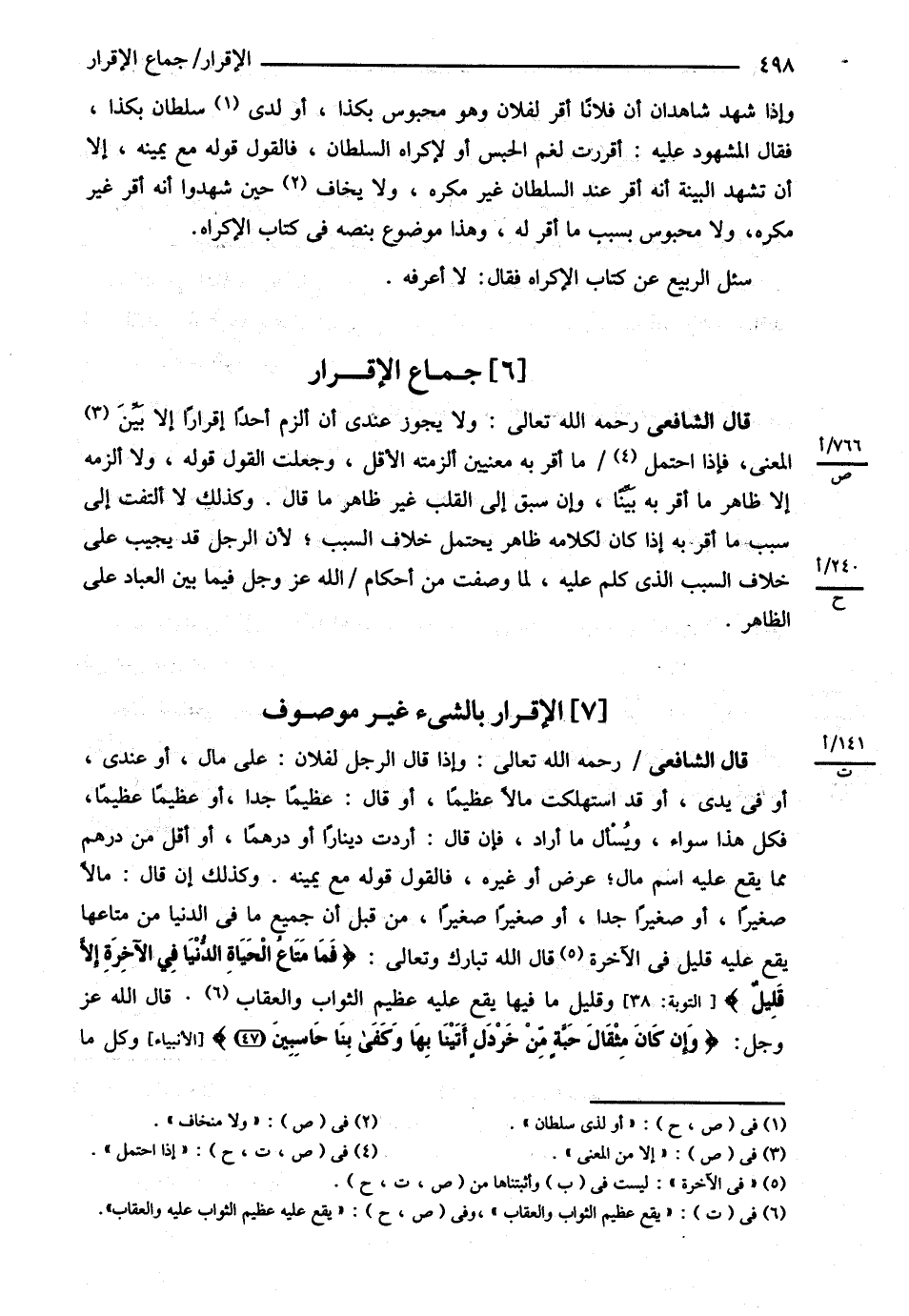 قَالَ الشَّافِعِيُّ: رحمه الله تعالى: وَإِذَا قَالَ الرَّجُلُ لِفُلاَنٍ عَلَيَّ مَالٌ أَوْ عِنْدِي أَوْ فِي يَدِي أَوْ قَدْ اسْتَهْلَكْتُ مَالاً عَظِيمًا أَوْ قَالَ عَظِيمًا جِدًّا أَوْ عَظِيمًا عَظِيمًا فَكُلُّ هَذَا سَوَاءٌ وَيُسْأَلُ مَا أَرَادَ. فَإِنْ قَالَ أَرَدْتُ دِينَارًا أَوْ دِرْهَمًا أَوْ أَقَلَّ مِنْ دِرْهَمٍ مِمَّا يَقَعُ عَلَيْهِ اسْمُ مَالِ عَرْضٍ أَوْ غَيْرِهِ فَالْقَوْلُ قَوْلُهُ مَعَ يَمِينِهِ. وَكَذَلِكَ إنْ قَالَ مَالاً صَغِيرًا أَوْ صَغِيرًا جِدًّا أَوْ صَغِيرًا صَغِيرًا مِنْ قِبَلِ أَنَّ جَمِيعَ مَا فِي الدُّنْيَا مِنْ مَتَاعِهَا يَقَعُ عَلَيْهِ قَلِيلٌ. قَالَ اللَّهُ تَبَارَكَ وَتَعَالَى {فَمَا مَتَاعُ الْحَيَاةِ الدُّنْيَا فِي الْآخِرَةِ إلَّا قَلِيلٌ} وَقَلِيلُ مَا فِيهَا يَقَعُ عَلَيْهِ عَظِيمُ الثَّوَابِ وَالْعِقَابِ قَالَ اللَّهُ عَزَّ وَجَلَّ {وَإِنْ كَانَ مِثْقَالَ حَبَّةٍ مِنْ خَرْدَلٍ أَتَيْنَا بِهَا وَكَفَى بِنَا حَاسِبِينَ}. وَكُلُّ مَا @