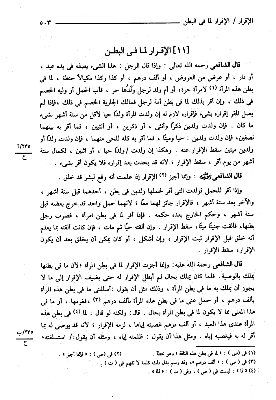 قَالَ الشَّافِعِيُّ : رحمه الله تعالى : وَإِذَا قَالَ الرَّجُلُ هَذَا الشَّيْءُ يَصِفُهُ فِي يَدِهِ عَبْدٌ أَوْ دَارٌ أَوْ عَرْضٌ مِنْ الْعُرُوضِ أَوْ أَلْفُ دِرْهَمٍ أَوْ كَذَا وَكَذَا مِكْيَالاً حِنْطَةً لِمَا فِي بَطْنِ هَذِهِ الْمَرْأَةِ لِامْرَأَةٍ حُرَّةٍ أَوْ أُمِّ وَلَدٍ لِرَجُلٍ وَلَدُهَا حُرٌّ فَأَبُو الْحَمْلِ أَوْ وَلِيُّهُ الْخَصْمُ فِي ذَلِكَ ; وَإِنْ أَقَرَّ بِذَلِكَ لِمَا فِي بَطْنِ أَمَةٍ لِرَجُلٍ فَمَالِكُ الْجَارِيَةِ الْخَصْمُ فِي ذَلِكَ . فَإِذَا لَمْ يَصِلْ الْمُقِرُّ إقْرَارَهُ بِشَيْءٍ فَإِقْرَارُهُ لاَزِمٌ لَهُ إنْ وَلَدَتْ الْمَرْأَةُ وَلَدًا حَيًّا لِأَقَلَّ مِنْ سِتَّةِ أَشْهُرٍ بِشَيْءٍ مَا كَانَ , فَإِنْ وَلَدَتْ وَلَدَيْنِ ذَكَرًا وَأُنْثَى أَوْ ذَكَرَيْنِ أَوْ أُنْثَيَيْنِ فَمَا أَقَرَّ بِهِ بَيْنَهُمَا نِصْفَيْنِ , فَإِنْ وَلَدَتْ وَلَدَيْنِ حَيًّا وَمَيِّتًا أَقَرَّ بِهِ كُلِّهِ لِلْحَيِّ مِنْهُمَا فَإِنْ وَلَدَتْ وَلَدًا أَوْ وَلَدَيْنِ مَيِّتَيْنِ سَقَطَ الْإِقْرَارُ عَنْهُ . وَهَكَذَا إنْ وَلَدَتْ وَلَدًا حَيًّا أَوْ اثْنَيْنِ لِكَمَالِ سِتَّةِ أَشْهُرٍ مِنْ يَوْمِ أَقَرَّ سَقَطَ الْإِقْرَارُ ; لِأَنَّهُ قَدْ يَحْدُثُ بَعْدَ إقْرَارِهِ فَلاَ يَكُونُ أَقَرَّ بِشَيْءٍ
