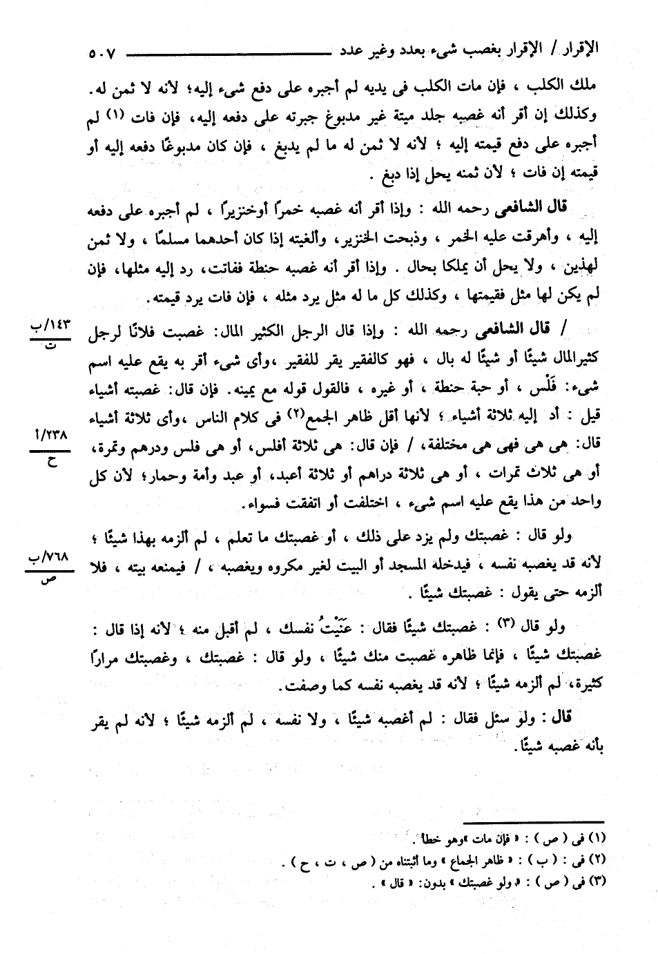 قَالَ الشَّافِعِيُّ : وَإِذَا قَالَ الرَّجُلُ الْكَثِيرُ الْمَالِ غَصَبْت فُلاَنًا لِرَجُلٍ كَثِيرِ الْمَالِ شَيْئًا أَوْ شَيْئًا لَهُ بَالٌ فَهُوَ كَالْفَقِيرِ يُقِرُّ لِلْفَقِيرِ , وَأَيُّ شَيْءٍ أَقَرَّ بِهِ يَقَعُ عَلَيْهِ اسْمُ شَيْءٍ فَلْسٍ أَوْ حَبَّةٍ حِنْطَةٍ أَوْ غَيْرِهِ فَالْقَوْلُ قَوْلُهُ مَعَ يَمِينِهِ . فَإِنْ قَالَ : غَصَبْته أَشْيَاءَ قِيلَ أَدِّ إلَيْهِ ثَلاَثَةَ أَشْيَاءَ ; لِأَنَّهَا أَقَلُّ ظَاهِرِ الْجِمَاعِ فِي كَلاَمِ النَّاسِ , وَأَيُّ ثَلاَثَةِ أَشْيَاءَ قَالَ هِيَ هِيَ فَهِيَ هِيَ مُخْتَلِفَةٌ فَإِنْ قَالَ هِيَ ثَلاَثَةُ أَفْلُسٍ أَوْ هِيَ فَلْسٌ وَدِرْهَمٌ وَتَمْرَةٌ أَوْ هِيَ ثَلاَثُ تَمَرَاتٍ أَوْ هِيَ ثَلاَثَةُ دَرَاهِمَ أَوْ ثَلاَثَةُ أَعْبُدَ أَوْ عَبْدٌ , وَأَمَةٌ وَحِمَارٌ ; لِأَنَّ كُلَّ وَاحِدٍ مِنْ هَذَا يَقَعُ عَلَيْهِ اسْمُ شَيْءٍ اخْتَلَفَتْ أَوْ اتَّفَقَتْ فَسَوَاءٌ , وَلَوْ قَالَ غَصَبْتُك , وَلَمْ يَزِدْ عَلَى ذَلِكَ أَوْ غَصَبْتُك مَا تَعْلَمُ لَمْ أُلْزِمْهُ بِهَذَا شَيْئًا ; لِأَنَّهُ قَدْ يَغْصِبُهُ نَفْسَهُ فَيُدْخِلُهُ الْمَسْجِدَ أَوْ الْبَيْتَ لِغَيْرِ مَكْرُوهٍ وَيَغْصِبُهُ فَيَمْنَعُهُ بَيْتَهُ فَلاَ أُلْزِمُهُ حَتَّى يَقُولَ غَصَبْتُك شَيْئًا , وَلَوْ قَالَ غَصَبْتُك شَيْئًا فَقَالَ عَنَيْت نَفْسَك لَمْ أَقْبَلْ مِنْهُ ; لِأَنَّهُ إذَا قَالَ غَصَبْتُك شَيْئًا , فَإِنَّمَا ظَاهِرُهُ غَصَبْت مِنْك شَيْئًا , وَلَوْ قَالَ غَصَبْتُك وَغَصَبْتُك مِرَارًا كَثِيرَةً لَمْ أُلْزِمْهُ شَيْئًا ; لِأَنَّهُ قَدْ يَغْصِبُهُ نَفْسَهُ كَمَا وَصَفْت . قَالَ : وَلَوْ سُئِلَ فَقَالَ : لَمْ أَغْصِبْهُ شَيْئًا , وَلاَ نَفْسَهُ لَمْ أُلْزِمْهُ شَيْئًا ; لِأَنَّهُ لَمْ يُقِرَّ بِأَنَّهُ غَصَبَهُ شَيْئًا .@