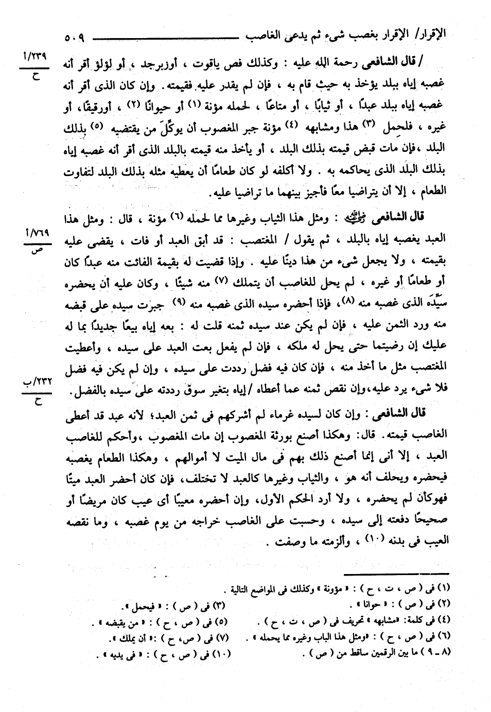 قَالَ الشَّافِعِيُّ : وَمِثْلُ هَذَا : الثِّيَابُ وَغَيْرُهَا مِمَّا لِحَمْلِهِ مُؤْنَةٌ . قَالَ وَمِثْلُ هَذَا : الْعَبْدُ يَغْصِبُهُ إيَّاهُ بِالْبَلَدِ , ثُمَّ يَقُولُ الْمُغْتَصِبُ قَدْ أَبَقَ الْعَبْدُ أَوْ فَاتَ يُقْضَى عَلَيْهِ بِقِيمَتِهِ , وَلاَ يُجْعَلُ شَيْءٌ مِنْ هَذَا دَيْنًا عَلَيْهِ وَإِذَا قَضَيْت لَهُ بِقِيمَةِ الْفَائِتِ مِنْهُ عَبْدًا كَانَ أَوْ طَعَامًا أَوْ غَيْرَهُ لَمْ يَحِلَّ لِلْغَاصِبِ أَنْ يَتَمَلَّكَ مِنْهُ شَيْئًا , وَكَانَ عَلَيْهِ أَنْ يُحْضِرَهُ سَيِّدَهُ الَّذِي غَصَبَهُ مِنْهُ , فَإِذَا أَحْضَرَهُ سَيِّدَهُ الَّذِي غَصَبَهُ مِنْهُ جَبَرْتُ سَيِّدَهُ عَلَى قَبْضِهِ مِنْهُ وَرَدِّ الثَّمَنِ عَلَيْهِ فَإِنْ لَمْ يَكُنْ عِنْدَ سَيِّدِهِ ثَمَنُهُ قُلْت لَهُ بِعْهُ إيَّاهُ بَيْعًا جَدِيدًا بِمَا لَهُ عَلَيْك إنْ رَضِيتُمَا حَتَّى يَحِلَّ لَهُ مِلْكُهُ فَإِنْ لَمْ يَفْعَلْ بِعْت الْعَبْدَ عَلَى سَيِّدِهِ , وَأَعْطَيْت الْمُغْتَصِبَ مِثْلَ مَا أُخِذَ مِنْهُ فَإِنْ كَانَ فِيهِ فَضْلٌ رَدَدْت عَلَى سَيِّدِهِ وَإِنْ لَمْ يَكُنْ فِيهِ فَضْلٌ فَلاَ شَيْءَ يُرَدُّ عَلَيْهِ , وَإِنْ نَقَصَ ثَمَنُهُ عَمَّا أَعْطَاهُ إيَّاهُ بِتَغَيُّرِ سُوقٍ رَدَدْته عَلَى سَيِّدِهِ بِالْفَضْلِ .