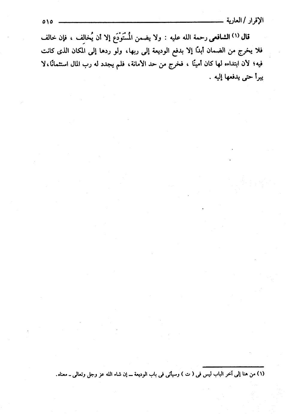 قَالَ الشَّافِعِيُّ : وَلاَ يَضْمَنُ الْمُسْتَوْدِعُ إلَّا أَنْ يُخَالِفَ فَإِنْ خَالَفَ فَلاَ يَخْرُجُ مِنْ الضَّمَانِ أَبَدًا إلَّا بِدَفْعِ الْوَدِيعَةِ إلَى رَبِّهَا , وَلَوْ رَدَّهَا إلَى الْمَكَانِ الَّذِي كَانَتْ فِيهِ ; لِأَنَّ ابْتِدَاءَهُ لَهَا كَانَ أَمِينًا فَخَرَجَ مِنْ حَدِّ الْأَمَانَةِ فَلَمْ يُجَدِّدْ لَهُ رَبُّ الْمَالِ اسْتِئْمَانًا لاَ يَبْرَأُ حَتَّى يَدْفَعَهَا إلَيْهِ .@