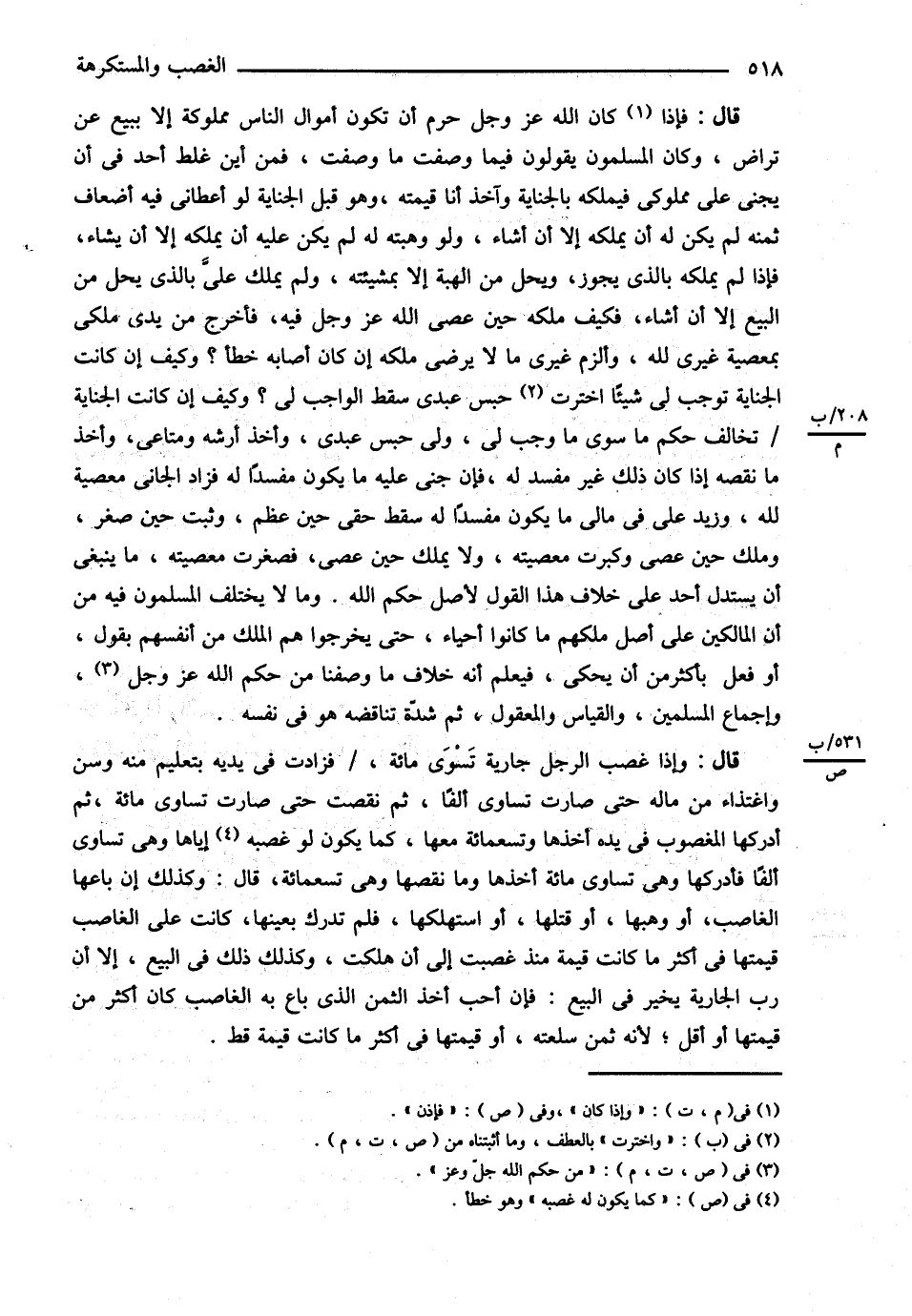 قَالَ فَإِذَا كَانَ اللَّهُ عَزَّ وَجَلَّ حَرَّمَ أَنْ تَكُونَ أَمْوَالُ النَّاسِ مَمْلُوكَةً إلَّا بِبَيْعٍ عَنْ تَرَاضٍ وَكَانَ الْمُسْلِمُونَ يَقُولُونَ فِيمَا وَصَفْت مَا وَصَفْت فَمِنْ أَيْنَ غَلِطَ أَحَدٌ فِي أَنْ يَجْنِيَ عَلَى مَمْلُوكِي فَيَمْلِكُهُ بِالْجِنَايَةِ وَآخُذُ أَنَا قِيمَتَهُ وَهُوَ قَبْلَ الْجِنَايَةِ لَوْ أَعْطَانِي فِيهِ أَضْعَافَ ثَمَنِهِ لَمْ يَكُنْ لَهُ أَنْ يَمْلِكَهُ إلَّا أَنْ يَشَاءَ , وَلَوْ وَهَبْته لَهُ لَمْ يَكُنْ عَلَيْهِ أَنْ يَمْلِكَهُ إلَّا أَنْ يَشَاءَ فَإِذَا لَمْ يَمْلِكْهُ بِاَلَّذِي يَجُوزُ وَيَحِلُّ مِنْ الْهِبَةِ إلَّا بِمَشِيئَتِهِ , وَلَمْ يَمْلِكْ عَلَيَّ بِاَلَّذِي يَحِلُّ مِنْ الْبَيْعِ إلَّا أَنْ أَشَاءَ فَكَيْفَ مَلَكَهُ حِينَ عَصَى اللَّهَ عَزَّ وَجَلَّ فِيهِ فَأُخْرِجُ مِنْ يَدَيْ مِلْكِي بِمَعْصِيَةِ غَيْرِي لِلَّهِ وَأُلْزِمُ غَيْرِي مَا لاَ يَرْضَى مِلْكَهُ إنْ كَانَ أَصَابَهُ خَطَأً وَكَيْفَ إنْ كَانَتْ الْجِنَايَةُ تُوجِبُ لِي شَيْئًا وَاخْتَرْتُ حَبْسَ عَبْدِي سَقَطَ الْوَاجِبُ لِي وَكَيْفَ إنْ كَانَتْ الْجِنَايَةُ تُخَالِفُ حُكْمَ مَا سِوَى مَا وَجَبَ لِي وَلِي حَبْسُ عَبْدِي , وَأَخْذُ أَرْشِهِ وَمَتَاعِي , وَأَخْذُ مَا نَقَصَهُ إذَا كَانَ ذَلِكَ غَيْرَ مُفْسِدٍ لَهُ فَإِنْ جَنَى عَلَيْهِ مَا يَكُونُ مُفْسِدًا لَهُ فَزَادَ الْجَانِي مَعْصِيَةً لِلَّهِ وَزِيدَ عَلَيَّ فِي مَالِي مَا يَكُونُ مُفْسِدًا لَهُ سَقَطَ حَقِّي حِينَ عَظُمَ وَثَبَتَ حِينَ صَغُرَ وَمَلَكَ حِينَ عَصَى وَكَبُرَتْ مَعْصِيَتُهُ , وَلاَ يَمْلِكُ حِينَ عَصَى فَصَغُرَتْ مَعْصِيَتُهُ مَا يَنْبَغِي أَنْ يَسْتَدِلَّ أَحَدٌ عَلَى خِلاَفِ هَذَا الْقَوْلِ لِأَصْلِ حُكْمِ اللَّهِ . وَمَا لاَ يَخْتَلِفُ الْمُسْلِمُونَ فِيهِ مِنْ أَنَّ الْمَالِكِينَ عَلَى أَصْلِ مِلْكِهِمْ مَا كَانُوا أَحْيَاءَ حَتَّى يُخْرِجُوا هُمْ الْمِلْكَ مِنْ أَنْفُسِهِمْ بِقَوْلٍ أَوْ فِعْلٍ بِأَكْثَرَ مِنْ أَنْ يَحْكِيَ فَيَعْلَمَ أَنَّهُ خِلاَفُ مَا وَصَفْنَا مِنْ حُكْمِ اللَّهِ عَزَّ وَجَلَّ وَإِجْمَاعِ الْمُسْلِمِينَ وَالْقِيَاسِ وَالْمَعْقُولِ ثُمَّ شِدَّةِ تَنَاقُضِهِ هُوَ فِي نَفْسِهِ . قَالَ : وَإِذَا غَصَبَ الرَّجُلُ جَارِيَةً تَسْوَى مِائَةً فَزَادَتْ فِي يَدَيْهِ بِتَعْلِيمٍ مِنْهُ وَسِنٍّ وَاغْتِذَاءٍ مِنْ مَالِهِ حَتَّى صَارَتْ تُسَاوِي أَلْفًا ثُمَّ نَقَصَتْ حَتَّى صَارَتْ تُسَاوِي مِائَةً ثُمَّ أَدْرَكَهَا الْمَغْصُوبُ فِي يَدِهِ أَخَذَهَا وَتِسْعَمِائَةٍ مَعَهَا كَمَا يَكُونُ لَوْ غَصَبَهُ إيَّاهَا وَهِيَ تُسَاوِي أَلْفًا فَأَدْرَكَهَا وَهِيَ تُسَاوِي مِائَةً أَخَذَهَا وَمَا نَقَصَهَا وَهِيَ تِسْعُمِائَةٍ . قَالَ : وَكَذَلِكَ إنْ بَاعَهَا الْغَاصِبُ أَوْ وَهَبَهَا أَوْ قَتَلَهَا أَوْ اسْتَهْلَكَهَا فَلَمْ تُدْرَكْ بِعَيْنِهَا كَانَتْ عَلَى الْغَاصِبِ قِيمَتُهَا فِي أَكْثَرِ مَا كَانَتْ قِيمَةً مُنْذُ غُصِبَتْ إلَى أَنْ هَلَكَتْ وَكَذَلِكَ ذَلِكَ فِي الْبَيْعِ إلَّا أَنَّ رَبَّ الْجَارِيَةِ يُخَيَّرُ فِي الْبَيْعِ فَإِنْ أَحَبَّ أَخْذَ الثَّمَنِ الَّذِي بَاعَ بِهِ الْغَاصِبُ كَانَ أَكْثَرَ مِنْ قِيمَتِهَا أَوْ أَقَلَّ ; لِأَنَّهُ ثَمَنُ سِلْعَتِهِ أَوْ قِيمَتُهَا فِي أَكْثَرِ مَا كَانَتْ قِيمَةً قَطُّ .@