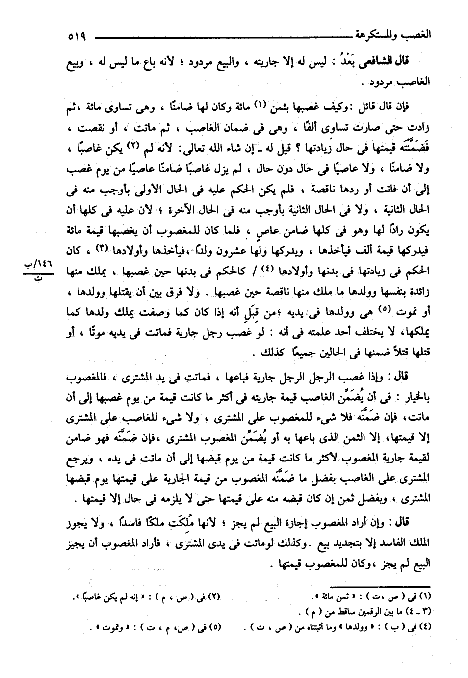 قَالَ الشَّافِعِيُّ : بَعْدُ : لَيْسَ لَهُ إلَّا جَارِيَتُهُ وَالْبَيْعُ مَرْدُودٌ ; لِأَنَّهُ بَاعَ مَا لَيْسَ لَهُ وَبَيْعُ الْغَاصِبِ مَرْدُودٌ فَإِنْ قَالَ قَائِلٌ : وَكَيْفَ غَصَبَهَا بِثَمَنِ مِائَةٍ وَكَانَ لَهَا ضَامِنًا وَهِيَ تُسَاوِي مِائَةً ثُمَّ زَادَتْ حَتَّى صَارَتْ تُسَاوِي أَلْفًا , وَهِيَ فِي ضَمَانِ الْغَاصِبِ ثُمَّ مَاتَتْ أَوْ نَقَصَتْ ضَمَّنْتُهُ قِيمَتَهَا فِي حَالِ زِيَادَتِهَا ؟ قِيلَ لَهُ إنْ شَاءَ اللَّهُ تَعَالَى لِأَنَّهُ لَمْ يَكُنْ غَاصِبًا , وَلاَ ضَامِنًا , وَلاَ عَاصِيًا فِي حَالٍ دُونَ حَالٍ لَمْ يَزَلْ غَاصِبًا ضَامِنًا عَاصِيًا مِنْ يَوْمِ غَصَبَ إلَى أَنْ فَاتَتْ أَوْ رَدَّهَا نَاقِصَةً فَلَمْ يَكُنْ الْحُكْمُ عَلَيْهِ فِي الْحَالِ الْأُولَى بِأَوْجَبَ مِنْهُ فِي الْحَالِ الثَّانِيَةِ , وَلاَ فِي الْحَالِ الثَّانِيَةِ بِأَوْجَبَ مِنْهُ فِي الْحَالِ الْآخِرَةِ ; لِأَنَّ عَلَيْهِ فِي كُلِّهَا أَنْ يَكُونَ رَادًّا لَهَا , وَهُوَ فِي كُلِّهَا ضَامِنٌ عَاصٍ فَلَمَّا كَانَ لِلْمَغْصُوبِ أَنْ يَغْصِبَهَا قِيمَةَ مِائَةٍ فَيُدْرِكَهَا قِيمَةَ أَلْفٍ فَيَأْخُذَهَا وَيُدْرِكَهَا , وَلَهَا عِشْرُونَ وَلَدًا فَيَأْخُذَهَا وَأَوْلاَدَهَا , كَانَ الْحُكْمُ فِي زِيَادَتِهَا فِي بَدَنِهَا وَوَلَدِهَا كَالْحُكْمِ فِي بَدَنِهَا حِينَ غَصَبَهَا يَمْلِكُ مِنْهَا زَائِدَةً بِنَفْسِهَا وَوَلَدِهَا مَا مَلَكَ مِنْهَا نَاقِصَةً حِينَ غَصَبَهَا , وَلاَ فَرْقَ بَيْنَ أَنْ يَقْتُلَهَا وَوَلَدَهَا أَوْ تَمُوتَ هِيَ وَوَلَدُهَا فِي يَدَيْهِ مِنْ قِبَلِ أَنَّهُ إذَا كَانَ كَمَا وَصَفْت يَمْلِكُ وَلَدَهَا كَمَا يَمْلِكُهَا لاَ يَخْتَلِفُ أَحَدٌ عَلِمْتُهُ فِي أَنَّهُ لَوْ غَصَبَ رَجُلٌ جَارِيَةً فَمَاتَتْ فِي يَدَيْهِ مَوْتًا أَوْ قَتَلَهَا قَتْلاً ضَمِنَهَا فِي الْحَالَيْنِ جَمِيعًا كَذَلِكَ . قَالَ : وَإِذَا غَصَبَ الرَّجُلُ الرَّجُلَ جَارِيَةً فَبَاعَهَا فَمَاتَتْ فِي يَدِ الْمُشْتَرِي فَالْمَغْصُوبُ بِالْخِيَارِ فِي أَنْ يُضَمِّنَ الْغَاصِبَ قِيمَةَ جَارِيَتِهِ فِي أَكْثَرِ مَا كَانَتْ قِيمَةً مِنْ يَوْمِ غَصَبَهَا إلَى أَنْ مَاتَتْ فَإِنْ ضَمَّنَهُ فَلاَ شَيْءَ لِلْمَغْصُوبِ عَلَى الْمُشْتَرِي , وَلاَ شَيْءَ لِلْغَاصِبِ عَلَى الْمُشْتَرِي إلَّا قِيمَتُهَا إلَّا الثَّمَنُ الَّذِي بَاعَهَا بِهِ أَوْ يُضَمِّنُ الْمَغْصُوبُ الْمُشْتَرِيَ فَإِنْ ضَمَّنَهُ فَهُوَ ضَامِنٌ لَقِيمَةِ جَارِيَةِ الْمَغْصُوبِ لِأَكْثَرِ مَا كَانَتْ قِيمَةً مِنْ يَوْمِ قَبَضَهَا إلَى أَنْ مَاتَتْ فِي يَدِهِ وَيَرْجِعُ الْمُشْتَرِي عَلَى الْغَاصِبِ بِفَضْلِ مَا ضَمَّنَهُ الْمَغْصُوبُ مِنْ قِيمَةِ الْجَارِيَةِ عَلَى قِيمَتِهَا يَوْمَ قَبَضَهَا الْمُشْتَرِي وَبِفَضْلٍ مِمَّنْ إنْ كَانَ قَبَضَهُ مِنْهُ عَلَى قِيمَتِهَا حَتَّى لاَ يَلْزَمَهُ فِي حَالٍ إلَّا قِيمَتُهَا . قَالَ : وَإِنْ أَرَادَ الْمَغْصُوبُ إجَازَةَ الْبَيْعِ لَمْ يَجُزْ ; لِأَنَّهَا مُلِكَتْ مِلْكًا فَاسِدًا , وَلاَ يَجُوزُ الْمِلْكُ الْفَاسِدُ إلَّا بِتَجْدِيدِ بَيْعٍ وَكَذَلِكَ لَوْ مَاتَتْ فِي يَدَيْ الْمُشْتَرِي فَأَرَادَ الْمَغْصُوبُ أَنْ يُجِيزَ الْبَيْعَ لَمْ يَجُزْ وَكَانَ لِلْمَغْصُوبِ قِيمَتُهَا ,@