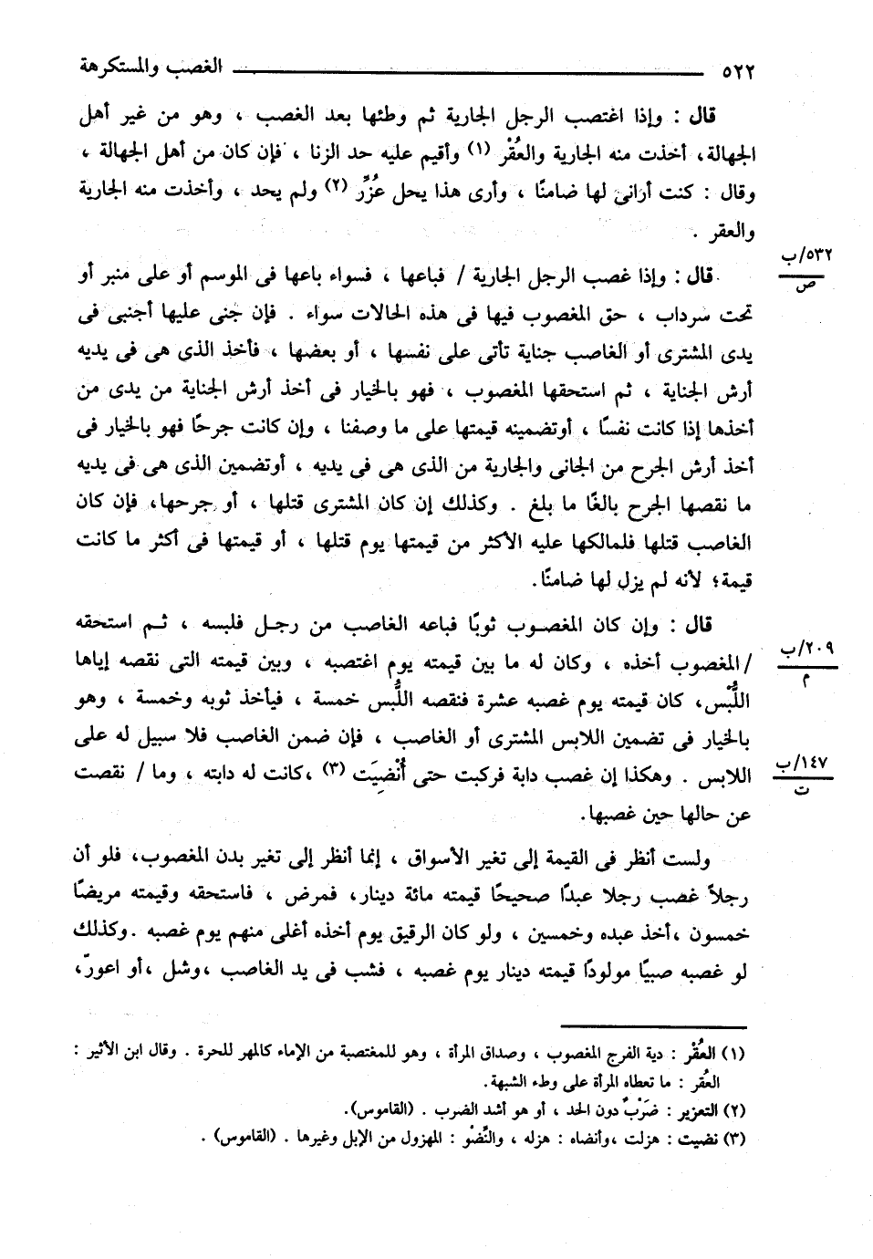 فَلَوْ أَنَّ رَجُلاً غَصَبَ رَجُلاً عَبْدًا صَحِيحًا قِيمَتُهُ مِائَةُ دِينَارٍ فَمَرِضَ فَاسْتَحَقَّهُ وَقِيمَتُهُ مَرِيضًا خَمْسُونَ أَخَذَ عَبْدَهُ وَخَمْسِينَ , وَلَوْ كَانَ الرَّقِيقُ يَوْمَ أَخَذَهُ أَغْلَى مِنْهُمْ يَوْمَ غَصَبَهُ , وَكَذَلِكَ لَوْ غَصَبَهُ صَبِيًّا مَوْلُودًا قِيمَتُهُ دِينَارٌ يَوْمَ غَصَبَهُ فَشَبَّ فِي يَدِ الْغَاصِبِ , وَشُلَّ أَوْ اعْوَرَّ @
