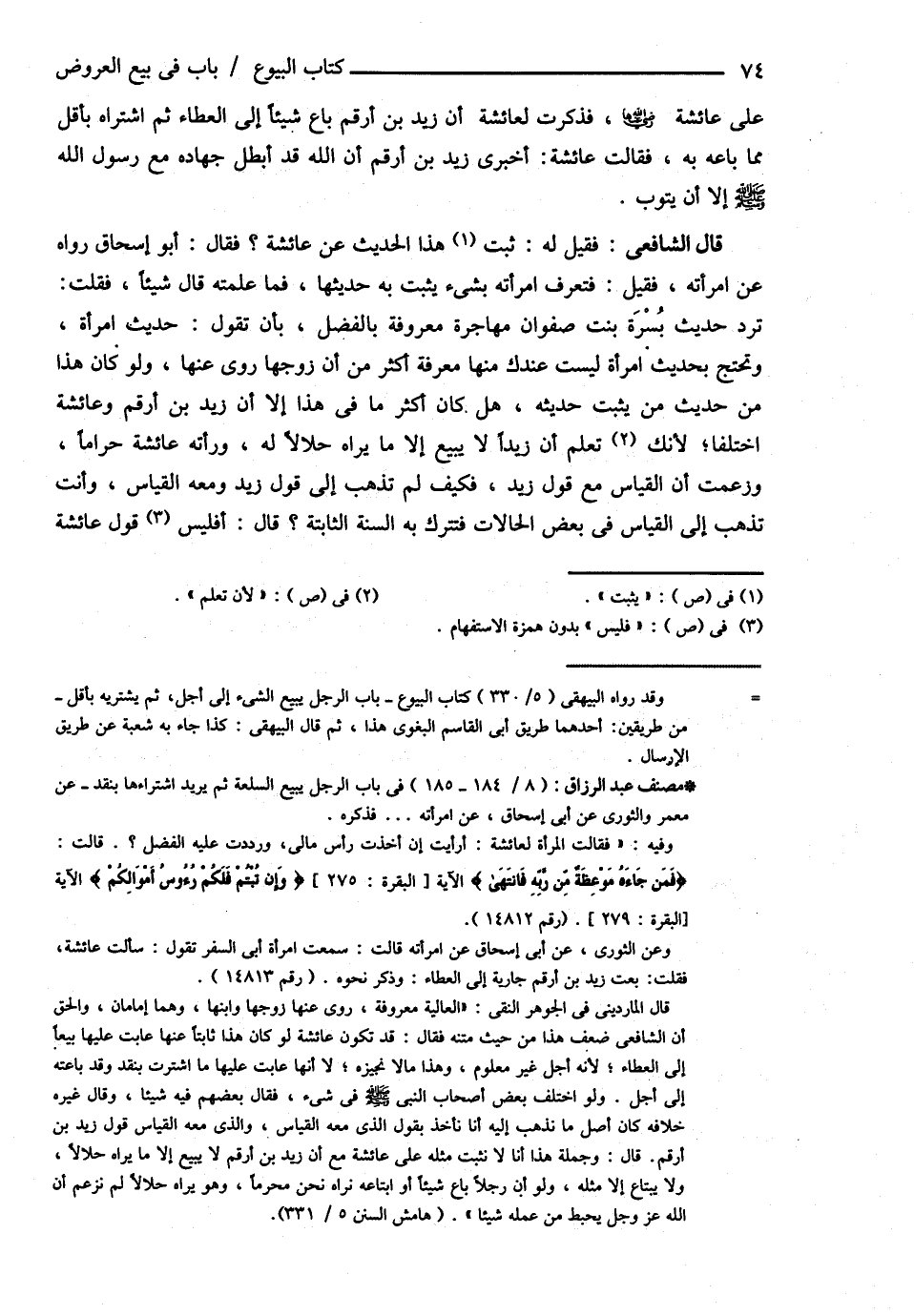 قَالَ الشَّافِعِيُّ : فَقِيلَ لَهُ ثَبَتَ هَذَا الْحَدِيثُ عَنْ عَائِشَةَ فَقَالَ أَبُو إِسْحَاقَ رَوَاهُ عَنْ امْرَأَتِهِ فَقِيلَ فَتَعْرِفُ امْرَأَتَهُ بِشَيْءٍ يُثْبِتُ بِهِ حَدِيثَهَا فَمَا عَلِمْته قَالَ شَيْئًا فَقُلْت تَرُدُّ حَدِيثَ بُسْرَةَ بِنْتِ صَفْوَانَ مُهَاجِرَةٌ مَعْرُوفَةٌ بِالْفَضْلِ بِأَنْ تَقُولَ : حَدِيثُ امْرَأَةٍ وَتَحْتَجُّ بِحَدِيثِ امْرَأَةٍ لَيْسَتْ عِنْدَك مِنْهَا مَعْرِفَةٌ أَكْثَرُ مِنْ أَنَّ زَوْجَهَا رَوَى عَنْهَا وَلَوْ كَانَ هَذَا مِنْ حَدِيثِ مَنْ يَثْبُتُ حَدِيثُهُ هَلْ كَانَ أَكْثَرُ مَا فِي هَذَا إلَّا أَنَّ زَيْدَ بْنَ أَرْقَمَ وَعَائِشَةَ اخْتَلَفَا ; لِأَنَّك تَعْلَمُ أَنَّ زَيْدًا لاَ يَبِيعُ إلَّا مَا يَرَاهُ حَلاَلاً لَهُ وَرَأَتْهُ عَائِشَةُ حَرَامًا وَزَعَمْت أَنَّ الْقِيَاسَ مَعَ قَوْلِ زَيْدٍ فَكَيْفَ لَمْ تَذْهَبْ إلَى قَوْلِ زَيْدٍ وَمَعَهُ الْقِيَاسُ وَأَنْتَ تَذْهَبُ إلَى الْقِيَاسِ فِي بَعْضِ الْحَالاَتِ فَتَتْرُكُ بِهِ السُّنَّةَ الثَّابِتَةَ ؟ قَالَ أَفَلَيْسَ قَوْلُ عَائِشَةَ @