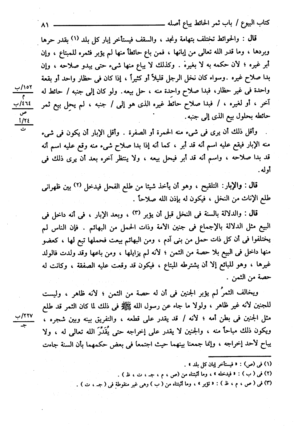 قال : وَالْحَوَائِطُ تَخْتَلِفُ بِتِهَامَةَ وَنَجْدٍ وَالسَّقِيفِ فَيَسْتَأْخِرُ إبَارُ كُلِّ بَلَدٍ بِقَدْرِ حَرِّهَا وَبَرْدِهَا وَمَا قَدَّرَ اللَّهُ تَعَالَى مِنْ إبَّانِهَا فَمَنْ بَاعَ حَائِطًا مِنْهَا لَمْ يُؤَبَّرْ فَثَمَرُهُ لِلْمُبْتَاعِ , وَإِنْ أُبِّرَ غَيْرُهُ ; لِأَنَّ حُكْمَهُ بِهِ لاَ بِغَيْرِهِ وَكَذَلِكَ لاَ يُبَاعُ مِنْهَا شَيْءٌ حَتَّى يَبْدُوَ صَلاَحُهُ , وَإِنْ بَدَا صَلاَحُ غَيْرِهِ وَسَوَاءٌ كَانَ نَخْلُ الرَّجُلِ قَلِيلاً أَوْ كَثِيرًا إذَا كَانَ فِي حِظَارٍ وَاحِدٍ أَوْ بُقْعَةٍ وَاحِدَةٍ فِي غَيْرِ حِظَارٍ فَبَدَا صَلاَحُ وَاحِدَةٍ مِنْهُ , حَلَّ بَيْعُهُ وَلَوْ كَانَ إلَى جَنْبِهِ حَائِطٌ لَهُ آخَرُ أَوْ لِغَيْرِهِ فَبَدَا صَلاَحُ حَائِطِ غَيْرِهِ الَّذِي هُوَ إلَى جَنْبِهِ لَمْ يَحِلَّ بَيْعُ ثَمَرِ حَائِطِهِ بِحُلُولِ بَيْعِ الَّذِي إلَى جَنْبِهِ وَأَقَلُّ ذَلِكَ أَنْ يُرَى فِي شَيْءٍ مِنْهُ الْحُمْرَةُ أَوْ الصُّفْرَةُ وَأَقَلُّ الْإِبَارِ أَنْ يَكُونَ فِي شَيْءٍ مِنْهُ الْإِبَارُ فَيَقَعُ عَلَيْهِ اسْمُ أَنَّهُ قَدْ أُبِّرَ كَمَا أَنَّهُ إذَا بَدَا صَلاَحُ شَيْءٍ مِنْهُ وَقَعَ عَلَيْهِ اسْمُ أَنَّهُ قَدْ بَدَا صَلاَحُهُ وَاسْمُ أَنَّهُ قَدْ أُبِّرَ فَيَحِلُّ بَيْعُهُ وَلاَ يُنْتَظَرُ آخِرُهُ بَعْدَ أَنْ يُرَى ذَلِكَ فِي أَوَّلِهِ ..