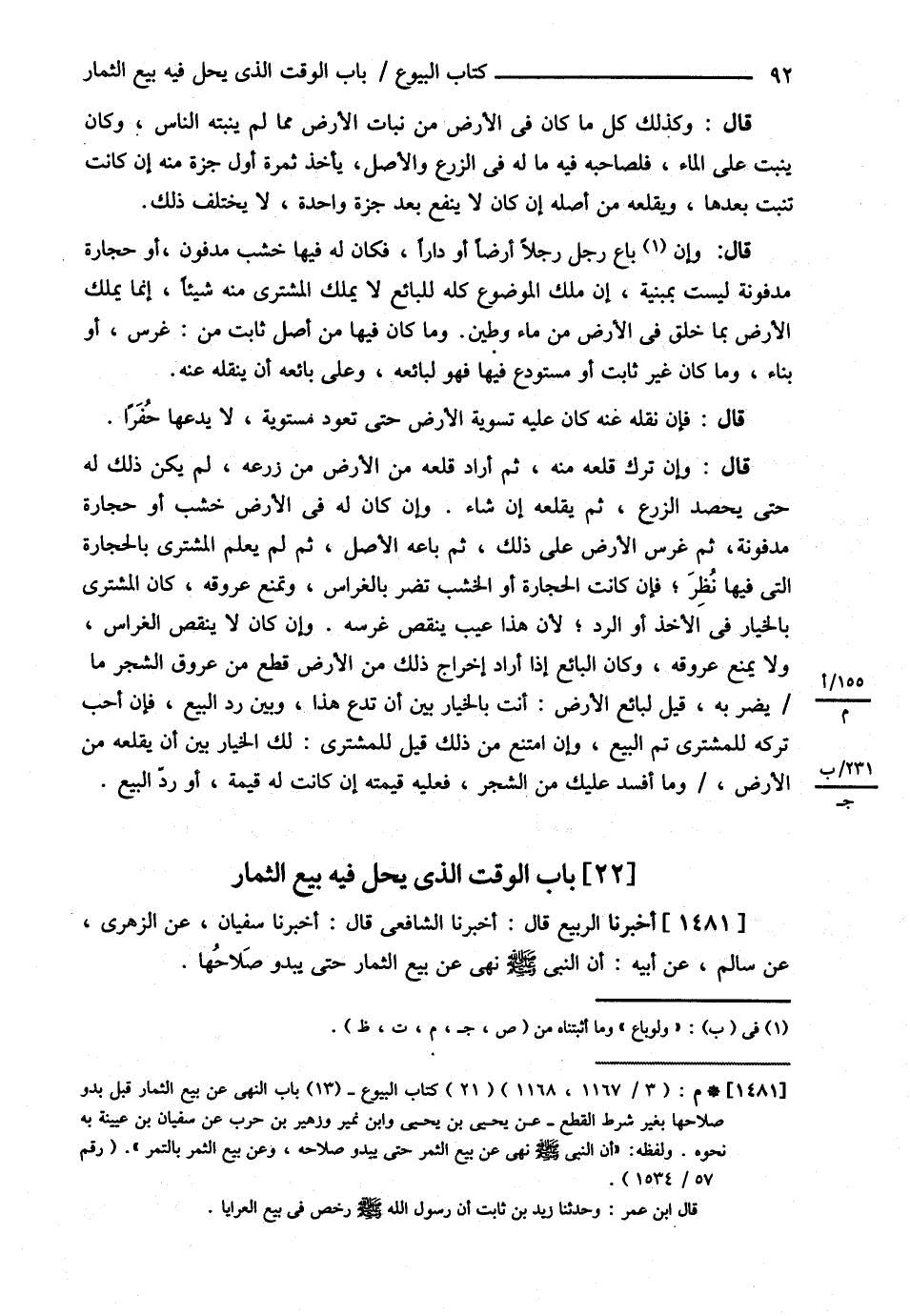 ( أَخْبَرَنَا الرَّبِيعُ ) : قَالَ أَخْبَرَنَا الشَّافِعِيُّ قَالَ أَخْبَرَنَا سُفْيَانُ عَنْ الزُّهْرِيِّ عَنْ سَالِمٍ عَنْ أَبِيهِ { أَنَّ النَّبِيَّ - صلى الله عليه وسلم - نَهَى عَنْ بَيْعِ الثِّمَارِ حَتَّى يَبْدُوَ صَلاَحُهَا } .@