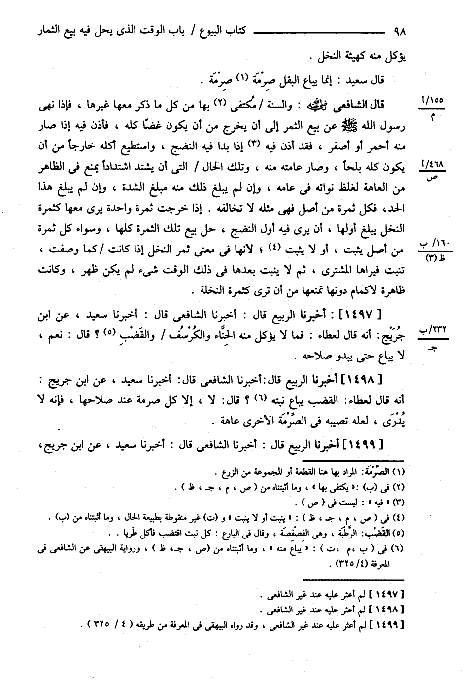 قَالَ الشَّافِعِيُّ : وَالسُّنَّةُ يُكْتَفَى بِهَا مِنْ كُلِّ مَا ذُكِرَ مَعَهَا غَيْرُهَا فَإِذَا { نَهَى رَسُولُ اللَّهِ - صلى الله عليه وسلم - عَنْ بَيْعِ الثَّمَرِ إلَى أَنْ يَخْرُجَ مِنْ أَنْ يَكُونَ غَضًّا كُلُّهُ فَأَذِنَ فِيهِ إذَا صَارَ مِنْهُ أَحْمَرُ أَوْ أَصْفَرُ } فَقَدْ أَذِنَ فِيهِ إذَا بَدَا فِيهِ النُّضْجُ وَاسْتُطِيعَ أَكْلُهُ خَارِجًا مِنْ أَنْ يَكُونَ كُلُّهُ بَلَحًا وَصَارَ عَامَّتُهُ مِنْهُ وَتِلْكَ الْحَالُ الَّتِي أَنْ يَشْتَدَّ اشْتِدَادًا يَمْنَعُ فِي الظَّاهِرِ مِنْ الْعَاهَةِ لِغِلَظِ نَوَاتِهِ فِي عَامِهِ , وَإِنْ لَمْ يَبْلُغْ ذَلِكَ مِنْهُ مَبْلَغَ الشِّدَّةِ , وَإِنْ لَمْ يَبْلُغْ هَذَا الْحَدَّ فَكُلُّ ثَمَرَةٍ مِنْ أَصْلٍ فَهِيَ مِثْلُهُ لاَ تُخَالِفُهُ إذَا خَرَجَتْ ثَمَرَةٌ وَاحِدَةٌ يَرَى مَعَهَا كَثَمَرَةِ النَّخْلِ يَبْلُغُ أَوَّلُهَا أَنْ يُرَى فِيهِ أَوَّلُ النُّضْجِ حَلَّ بَيْعُ تِلْكَ الثَّمَرَةِ كُلِّهَا وَسَوَاءٌ كُلُّ ثَمَرَةٍ مِنْ أَصْلٍ يَثْبُتُ أَوْ لاَ يَثْبُتُ ; لِأَنَّهَا فِي مَعْنَى ثَمَرِ النَّخْلِ إذَا كَانَتْ كَمَا وُصِفَتْ تَنْبُتُ فَيَرَاهَا الْمُشْتَرِي ثُمَّ لاَ يَنْبُتُ بَعْدَهَا فِي ذَلِكَ الْوَقْتِ شَيْءٌ لَمْ يَكُنْ ظَهَرَ وَكَانَتْ ظَاهِرَةً لاَ كِمَامَ دُونِهَا تَمْنَعُهَا مِنْ أَنْ تُرَى كَثَمَرَةِ النَّخْلَةِ أَخْبَرَنَا الرَّبِيعُ قَالَ أَخْبَرَنَا الشَّافِعِيُّ قَالَ أَخْبَرَنَا سَعِيدٌ عَنْ ابْنِ جُرَيْجٍ أَنَّهُ قَالَ لِعَطَاءٍ فَمَا لاَ يُؤْكَلُ مِنْهُ الْحِنَّاءُ وَالْكُرْسُفُ وَالْقَضْبُ ؟ قَالَ نَعَمْ لاَ يُبَاعُ حَتَّى يَبْدُوَ صَلاَحُهُ . ( أَخْبَرَنَا الرَّبِيعُ ) : قَالَ أَخْبَرَنَا الشَّافِعِيُّ قَالَ أَخْبَرَنَا سَعِيدٌ عَنْ ابْنِ جُرَيْجٍ أَنَّهُ قَالَ لِعَطَاءٍ الْقَضْبُ يُبَاعُ مِنْهُ ؟ قَالَ لاَ إلَّا كُلُّ صِرْمَةٍ عِنْدَ صَلاَحِهَا فَإِنَّهُ لاَ يَدْرِي لَعَلَّهُ تُصِيبُهُ فِي الصِّرْمَةِ الْأُخْرَى عَاهَةٌ أَخْبَرَنَا الرَّبِيعُ قَالَ أَخْبَرَنَا الشَّافِعِيُّ قَالَ أَخْبَرَنَا سَعِيدٌ عَنْ ابْنِ جُرَيْجٍ @