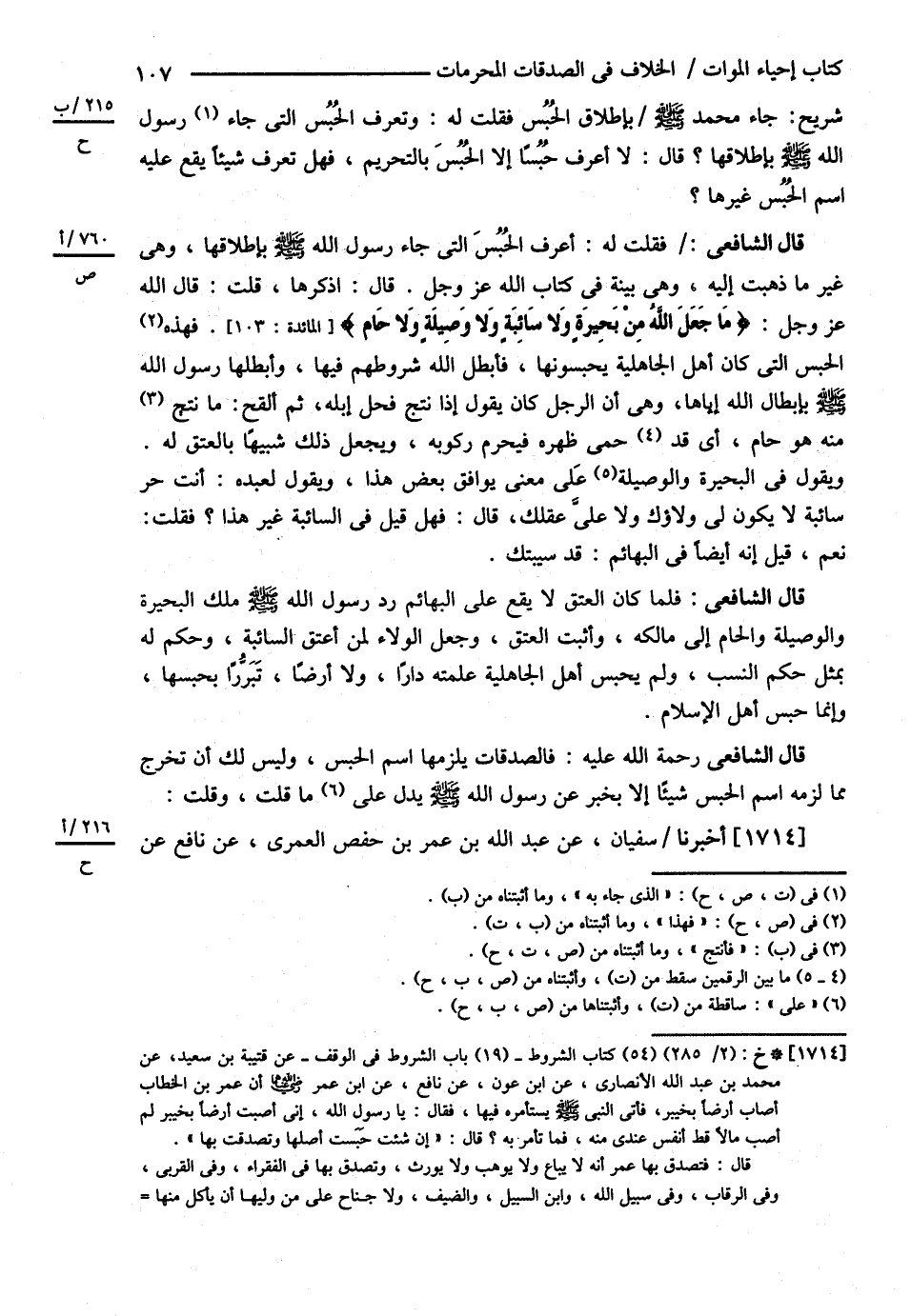 قَالَ الشَّافِعِيُّ: فَالصَّدَقَاتُ يَلْزَمُهَا اسْمُ الْحَبْسِ وَلَيْسَ لَك أَنْ تُخْرِجَ مِمَّا لَزِمَهُ اسْمُ الْحَبْسِ شَيْئًا إلَّا بِخَبَرٍ عَنْ رَسُولِ اللَّهِ - صلى الله عليه وسلم - يَدُلُّ عَلَى مَا قُلْت وَقُلْت أَخْبَرَنَا سُفْيَانُ عَنْ عَبْدِ اللَّهِ بْنِ عُمَرَ بْنِ حَفْصٍ الْعُمَرِيِّ عَنْ نَافِعٍ عَنْ @