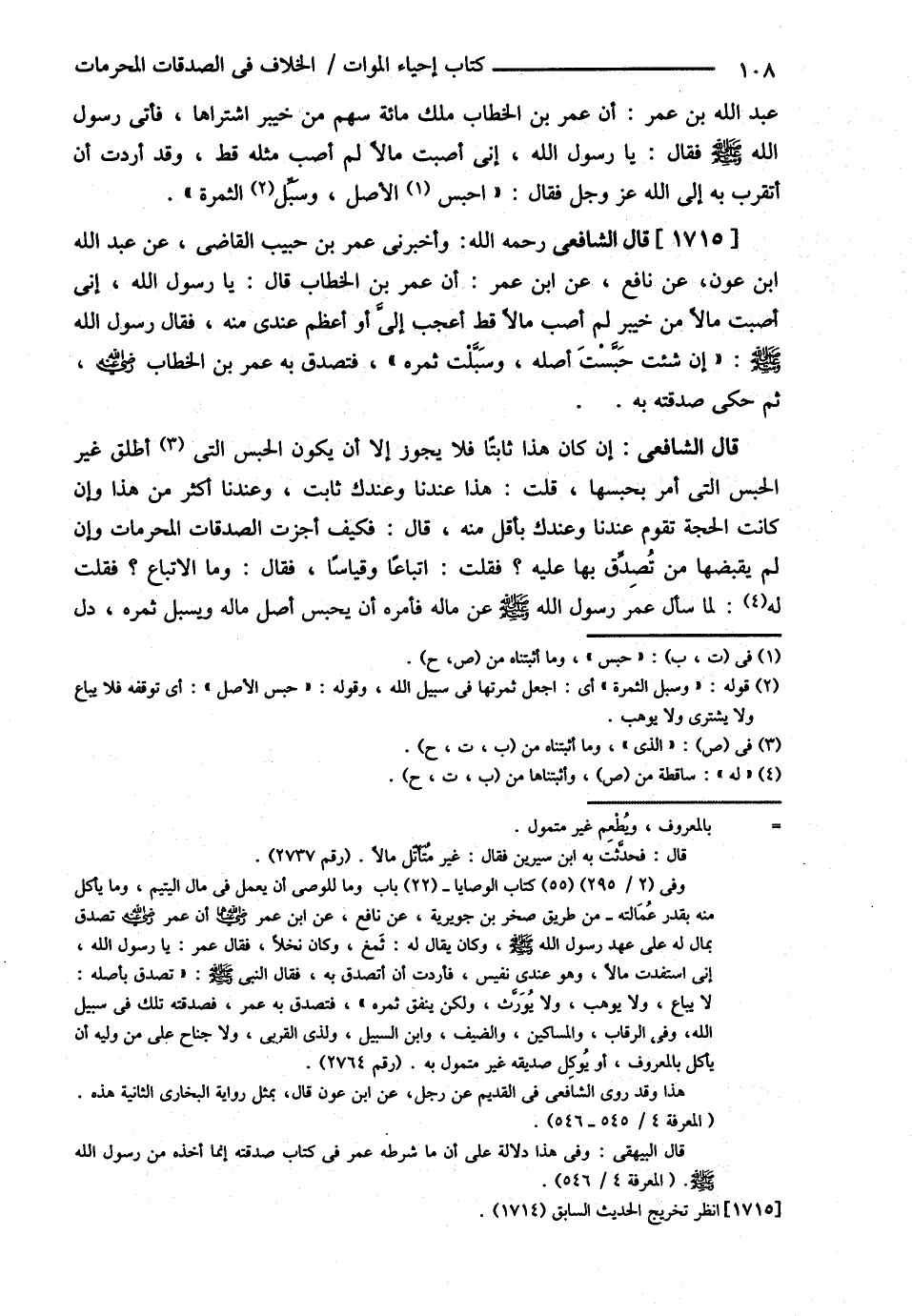 قَالَ الشَّافِعِيُّ : وَأَخْبَرَنِي عُمَرُ بْنُ حَبِيبٍ الْقَاضِي عَنْ عَبْدِ اللَّهِ بْنِ عَوْنٍ عَنْ نَافِعٍ عَنْ ابْنِ عُمَرَ { بِأَنَّ عُمَرَ بْنَ الْخَطَّابِ قَالَ يَا رَسُولَ اللَّهِ إنِّي أَصَبْت مَالاً مِنْ خَيْبَرَ لَمْ أُصِبْ مَالاً قَطُّ أَعْجَبَ إلَيَّ أَوْ أَعْظَمَ عِنْدِي مِنْهُ فَقَالَ رَسُولُ اللَّهِ - صلى الله عليه وسلم - إنْ شِئْت حَبَسْت أَصْلَهُ وَسَبَّلْت ثَمَرَهُ } فَتَصَدَّقَ بِهِ عُمَرُ بْنُ الْخَطَّابِ رضي الله عنه ثُمَّ حَكَى صَدَقَتَهُ بِهِ .