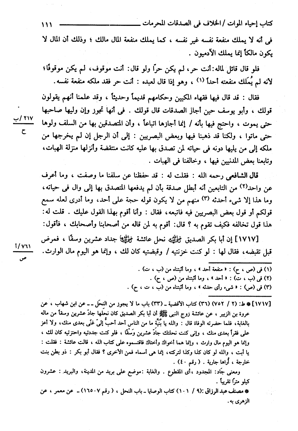 قَالَ الشَّافِعِيُّ : فَقُلْت لَهُ قَدْ حَفِظْنَا عَنْ سَلَفِنَا مَا وَصَفْت وَمَا أَعْرِفُ عَنْ أَحَدٍ مِنْ التَّابِعِينَ أَنَّهُ أَبْطَلَ صَدَقَةً بِأَنْ لَمْ يَدْفَعْهَا الْمُتَصَدِّقُ بِهَا إلَى وَالٍ فِي حَيَاتِهِ وَمَا هَذَا إلَّا شَيْءٌ أَحْدَثَهُ مِنْهُمْ مَنْ لاَ يَكُونُ قَوْلُهُ حُجَّةً عَلَى أَحَدٍ وَمَا أَدْرِي لَعَلَّهُ سَمِعَ قَوْلَكُمْ , أَوْ قَوْلَ بَعْضِ الْبَصْرِيِّينَ فِيهِ فَاتَّبَعَهُ فَقَالَ وَأَنَا أَقُومُ بِهَذَا الْقَوْلِ عَلَيْك قُلْت لَهُ هَذَا قَوْلٌ تُخَالِفُهُ فَكَيْفَ تَقُومُ بِهِ ؟ قَالَ أَقُومُ بِهِ لِمَنْ قَالَهُ مِنْ أَصْحَابِنَا وَأَصْحَابِك فَأَقُولُ إنَّ أَبَا بَكْرٍ الصِّدِّيقَ رضي الله عنه نَحَلَ عَائِشَةَ جِدَادَ عِشْرِينَ وَسْقًا فَمَرِضَ قَبْلَ أَنْ تَقْبِضَهُ فَقَالَ لَهَا : لَوْ كُنْت خَزَنْتِيهِ وَقَبَضْتِيهِ كَانَ لَك , وَإِنَّمَا هُوَ الْيَوْمَ مَالُ الْوَارِثِ ,@