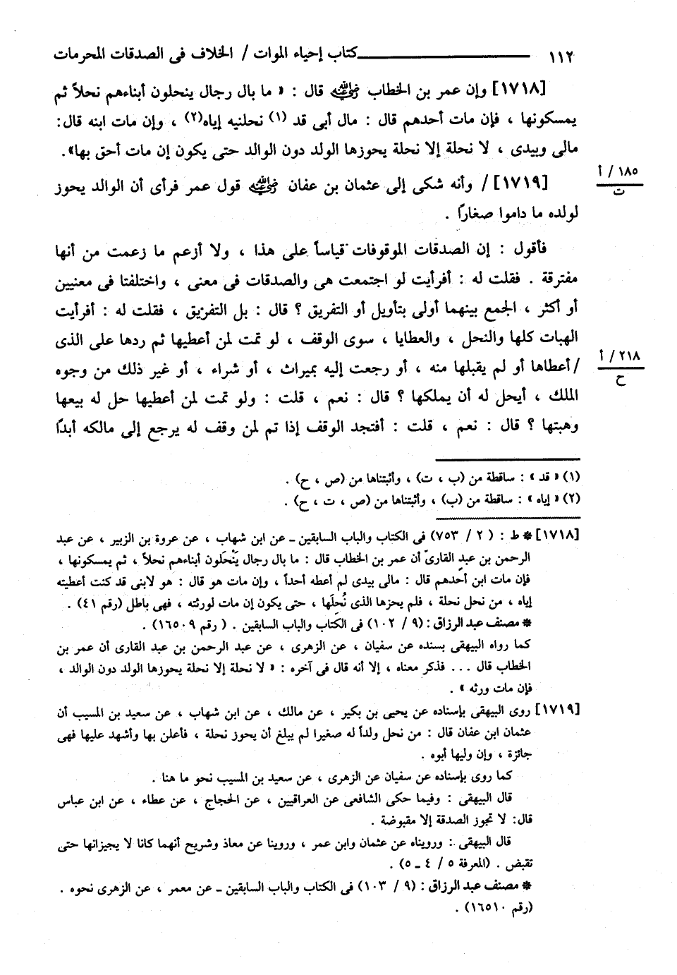 وَإِنَّ عُمَرَ بْنَ الْخَطَّابِ رضي الله عنه قَالَ مَا بَالُ رِجَالٍ يَنْحَلُونَ أَبْنَاءَهُمْ نُحْلاً ثُمَّ يُمْسِكُونَهَا فَإِنْ مَاتَ أَحَدُهُمْ قَالَ مَالُ أَبِي نَحَلْنِيهِ , وَإِنْ مَاتَ ابْنُهُ قَالَ مَالِي وَبِيَدِي لاَ نِحْلَةَ إلَّا نِحْلَةٌ يَحُوزُهَا الْوَلَدُ دُونَ الْوَالِدِ حَتَّى يَكُونَ إنْ مَاتَ أَحَقَّ بِهَا " وَأَنَّهُ شَكَا إلَى عُثْمَانَ بْنِ عَفَّانَ رضي الله عنه قَوْلَ عُمَرَ فَرَأَى أَنَّ الْوَالِدَ يَجُوزُ لِوَلَدِهِ مَا دَامُوا صِغَارًا , فَأَقُولُ إنَّ الصَّدَقَاتِ الْمَوْقُوفَاتِ قِيَاسًا عَلَى هَذَا .