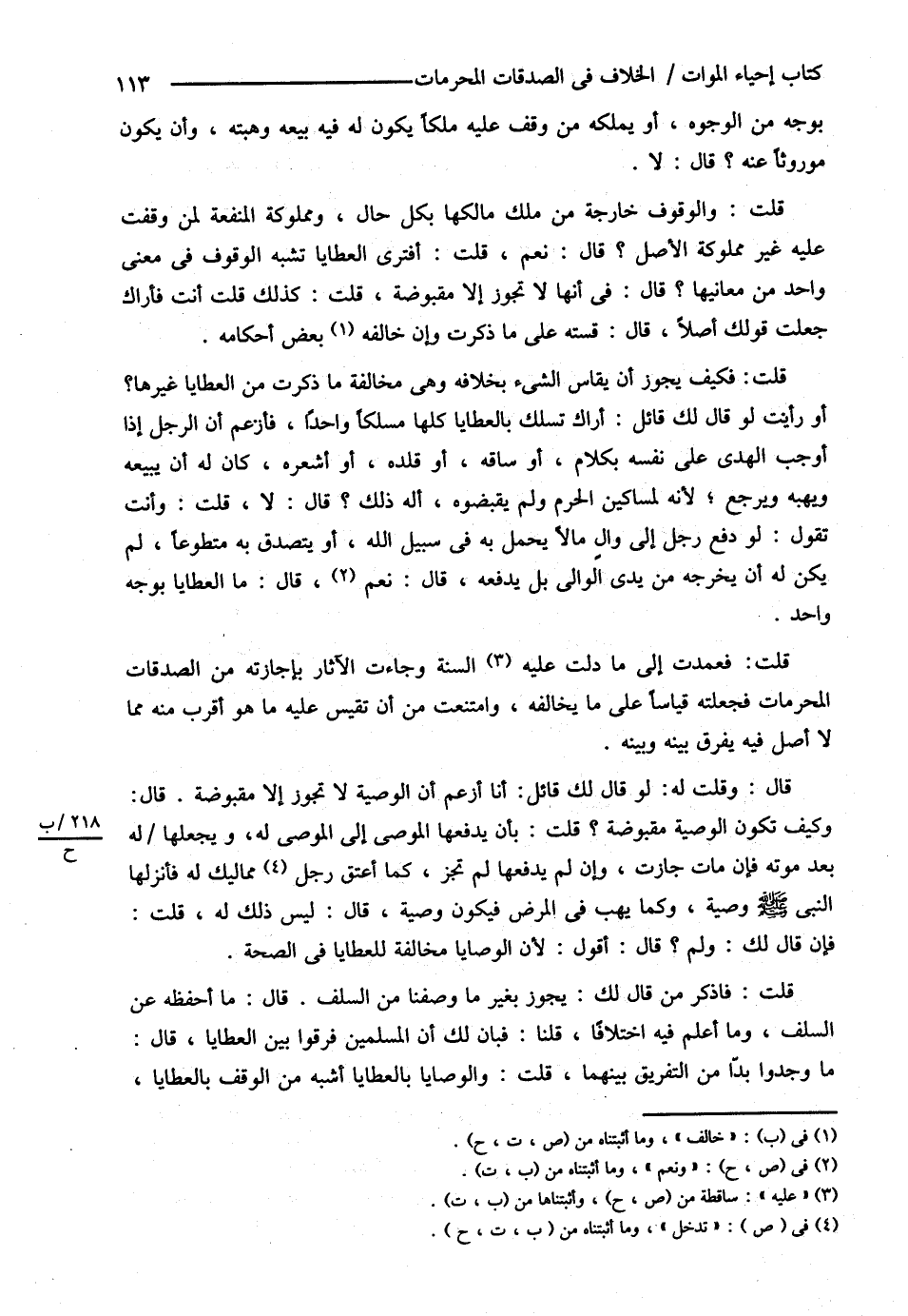 بِوَجْهٍ مِنْ الْوُجُوهِ , أَوْ يَمْلِكُهُ مَنْ وَقَفَ عَلَيْهِ مِلْكًا يَكُونُ لَهُ فِيهِ بَيْعُهُ وَهِبَتُهُ وَأَنْ يَكُونَ مَوْرُوثًا عَنْهُ ؟ قَالَ : لاَ , قُلْت وَالْوُقُوفُ خَارِجُهُ مِنْ مِلْكِ مَالِكِهَا بِكُلِّ حَالٍ وَمَمْلُوكَةُ الْمَنْفَعَةِ لِمَنْ وَقَفْت عَلَيْهِ غَيْرُ مَمْلُوكَةِ الْأَصْلِ ؟ قَالَ نَعَمْ : قُلْت أَفَتَرَى الْعَطَايَا تُشْبِهُ الْوُقُوفَ فِي مَعْنًى وَاحِدٍ مِنْ مَعَانِيهَا ؟ قَالَ فِي أَنَّهَا لاَ تَجُوزُ إلَّا مَقْبُوضَةً قُلْت : كَذَلِكَ قُلْت أَنْتَ فَأَرَاك جَعَلْت قَوْلَك أَصْلاً قَالَ : قِسْته عَلَى مَا ذَكَرْت إنْ خَالَفَ بَعْضَ أَحْكَامِهِ قُلْت : فَكَيْفَ يَجُوزُ أَنْ يُقَاسَ الشَّيْءُ بِخِلاَفِهِ وَهِيَ مُخَالِفَةٌ لِمَا ذَكَرْت مِنْ الْعَطَايَا غَيْرِهَا ؟ أَوَرَأَيْت لَوْ قَالَ لَك قَائِلٌ : أَرَاك تَسْلُكُ بِالْعَطَايَا كُلِّهَا مَسْلَكًا وَاحِدًا فَأَزْعُمُ أَنَّ الرَّجُلَ إذَا أَوْجَبَ الْهَدْيَ عَلَى نَفْسِهِ بِكَلاَمٍ , أَوْ سَاقَهُ , أَوْ قَلَّدَهُ أَوْ أَشْعَرَهُ كَانَ لَهُ أَنْ يَبِيعَهُ وَيَهَبَهُ وَيَرْجِعَ ; لِأَنَّهُ لِمَسَاكِينِ الْحَرَمِ , وَلَمْ يَقْبِضُوهُ أَلَهُ ذَلِكَ ؟ قَالَ : لاَ . قُلْت وَأَنْتَ تَقُولُ لَوْ دَفَعَ رَجُلٌ إلَى وَالٍ مَالاً يَحْمِلُ بِهِ فِي سَبِيلِ اللَّهِ , أَوْ يَتَصَدَّقُ بِهِ مُتَطَوِّعًا لَمْ يَكُنْ لَهُ أَنْ يُخْرِجَهُ مِنْ يَدَيْ الْوَالِي بَلْ يَدْفَعُهُ ؟ قَالَ نَعَمْ قَالَ مَا الْعَطَايَا بِوَجْهٍ وَاحِدٍ قُلْت فَعَمَدْت إلَى مَا دَلَّتْ عَلَيْهِ السُّنَّةُ وَجَاءَتْ الْآثَارُ بِإِجَازَتِهِ مِنْ الصَّدَقَاتِ الْمُحَرَّمَاتِ فَجَعَلْته قِيَاسًا عَلَى مَا يُخَالِفُهُ وَامْتَنَعْت مِنْ أَنْ تَقِيسَ عَلَيْهِ مَا هُوَ أَقْرَبُ مِنْهُ مِمَّا لاَ أَصْلَ فِيهِ تُفَرِّقُ بَيْنَهُ وَبَيْنَهُ . قَالَ : وَقُلْت لَهُ لَوْ قَالَ لَك قَائِلٌ : أَنَا أَزْعُمُ أَنَّ الْوَصِيَّةَ لاَ تَجُوزُ إلَّا مَقْبُوضَةً . قَالَ : وَكَيْفَ تَكُونُ الْوَصِيَّةُ مَقْبُوضَةً ؟ قُلْت بِأَنْ يَدْفَعَهَا الْمُوصِي إلَى الْمُوصَى لَهُ وَيَجْعَلَهَا لَهُ بَعْدَ مَوْتِهِ فَإِنْ مَاتَ جَازَتْ , وَإِنْ لَمْ يَدْفَعْهَا لَمْ تَجُزْ كَمَا أَعْتَقَ رَجُلٌ مَمَالِيكَ لَهُ فَأَنْزَلَهَا النَّبِيُّ - صلى الله عليه وسلم - وَصِيَّةً , وَكَمَا يَهَبُ فِي الْمَرَضِ فَيَكُونُ وَصِيَّةً قَالَ لَيْسَ ذَلِكَ لَهُ . قُلْت : فَإِنْ قَالَ لَك وَلِمَ ؟ قَالَ أَقُولُ ; لِأَنَّ الْوَصَايَا مُخَالِفَةٌ لِلْعَطَايَا فِي الصِّحَّةِ قُلْت : فَأَذْكُرُ مَنْ قَالَ يَجُوزُ بِغَيْرِ مَا وَصَفْنَا مِنْ السَّلَفِ . قَالَ : مَا أَحْفَظُهُ عَنْ السَّلَفِ وَمَا أَعْلَمُ فِيهِ اخْتِلاَفًا قُلْنَا : فَبَانَ لَك أَنَّ الْمُسْلِمِينَ فَرَّقُوا بَيْنَ الْعَطَايَا , قَالَ : مَا وَجَدُوا بُدًّا مِنْ التَّفْرِيقِ بَيْنَهُمَا . قُلْت : وَالْوَصَايَا بِالْعَطَايَا أَشْبَهُ مِنْ الْوَقْفِ بِالْعَطَايَا , @