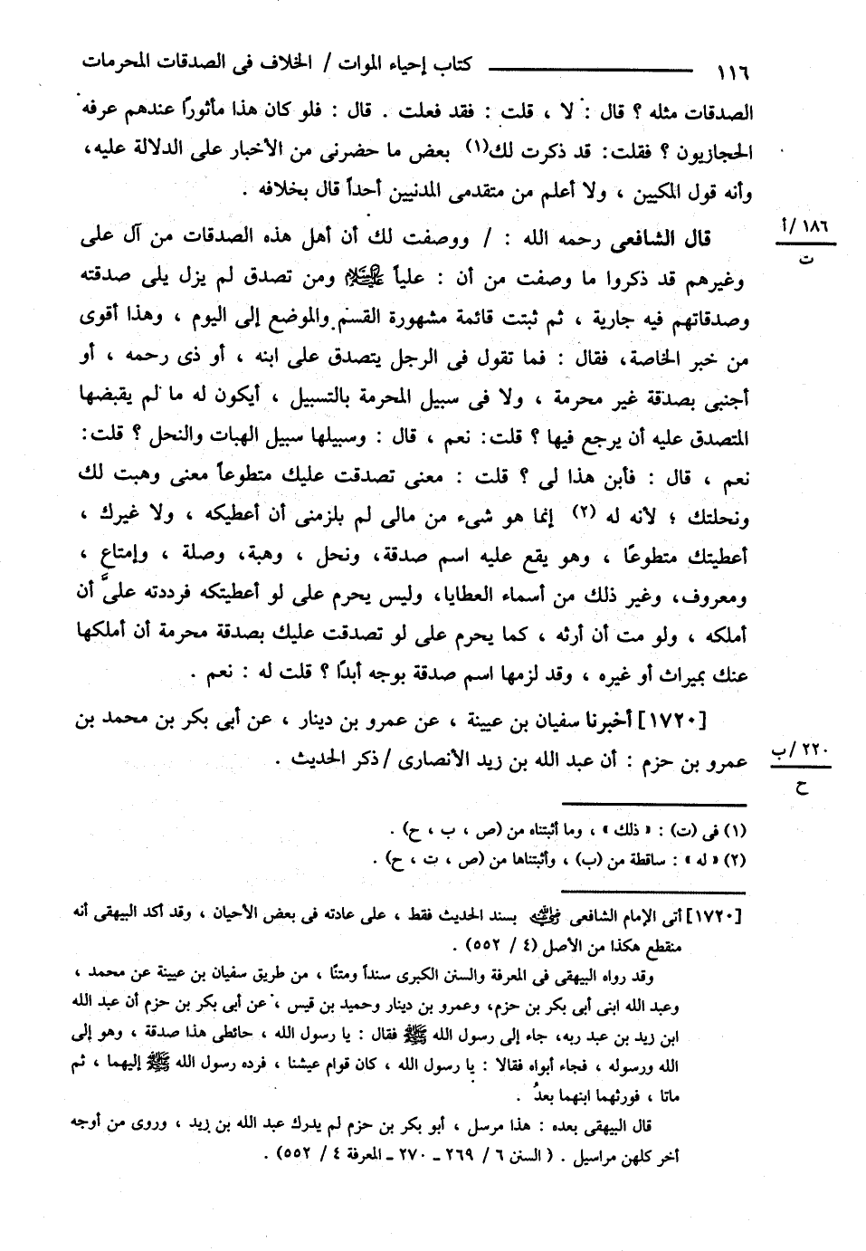 الصَّدَقَاتِ مِثْلَهُ ؟ قَالَ : لاَ , قُلْت : فَقَدْ فَعَلْت قَالَ : فَلَوْ كَانَ هَذَا مَأْثُورًا عِنْدَهُمْ عَرَفَهُ الْحِجَازِيُّونَ , فَقُلْت قَدْ ذَكَرْت لَك بَعْضَ مَا حَضَرَنِي مِنْ الْأَخْبَارِ عَلَى الدَّلاَلَةِ عَلَيْهِ وَأَنَّهُ قَوْلُ الْمَكِّيِّينَ , وَلاَ أَعْلَمُ مِنْ مُتَقَدِّمِي الْمَدَنِيِّينَ أَحَدًا قَالَ بِخِلاَفِهِ .