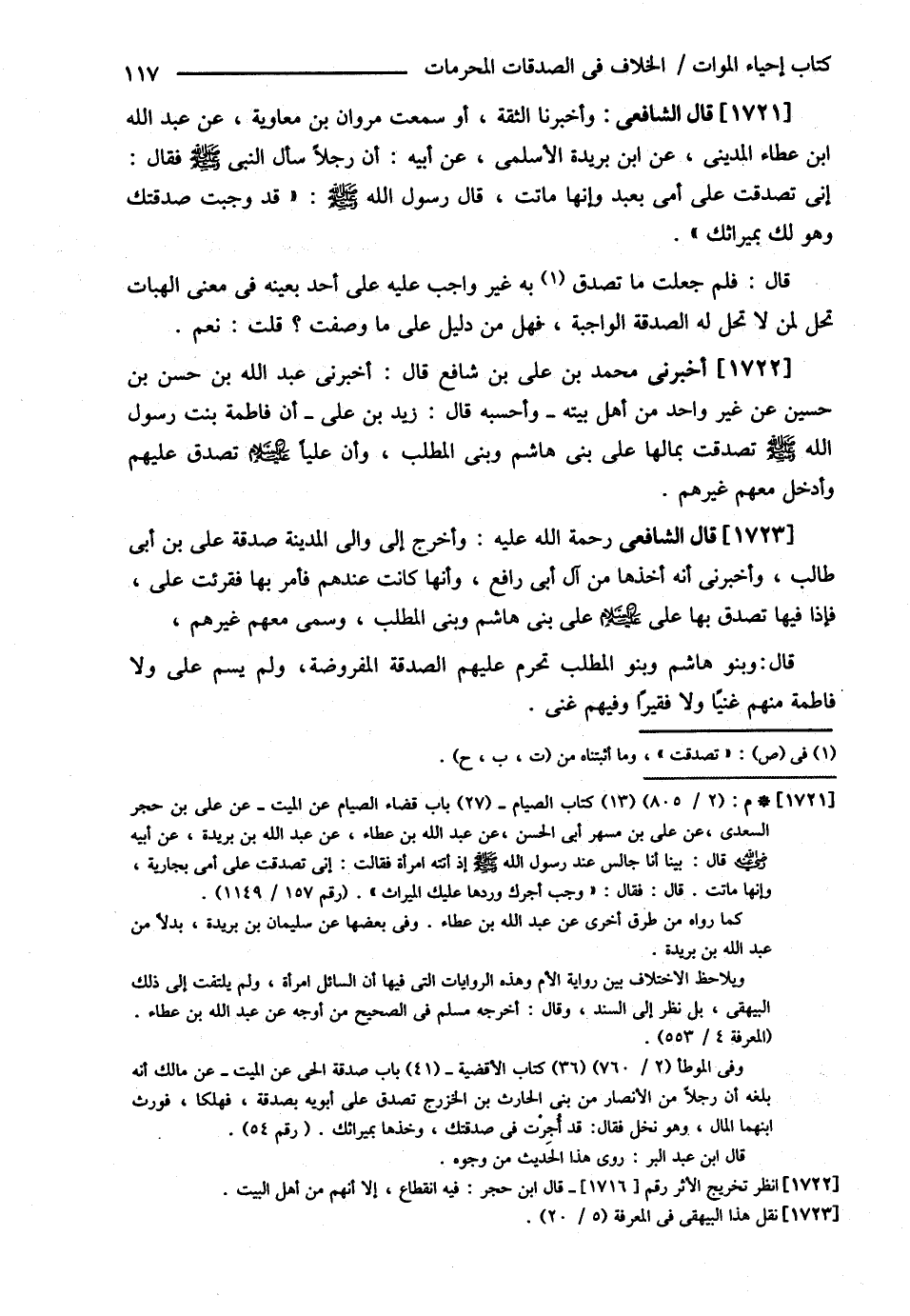قَالَ الشَّافِعِيُّ : وَأَخْبَرَنَا الثِّقَةُ , أَوْ سَمِعْت مَرْوَانَ بْنَ مُعَاوِيَةَ عَنْ عَبْدِ اللَّهِ بْنِ عَطَاءٍ الْمَدِينِيِّ عَنْ ابْنِ بُرَيْدَةَ الْأَسْلَمِيِّ عَنْ أَبِيهِ { أَنَّ رَجُلاً سَأَلَ النَّبِيَّ - صلى الله عليه وسلم - فَقَالَ إنِّي تَصَدَّقْت عَلَى أُمِّي بِعَبْدٍ وَإِنَّهَا مَاتَتْ فَقَالَ رَسُولُ اللَّهِ - صلى الله عليه وسلم - قَدْ وَجَبَتْ صَدَقَتُك , وَهُوَ لَك بِمِيرَاثِك } قَالَ فَلِمَ جَعَلْت مَا تَصَدَّقَ بِهِ غَيْرَ وَاجِبٍ عَلَيْهِ عَلَى أَحَدٍ بِعَيْنِهِ فِي مَعْنَى الْهِبَاتِ تَحِلُّ لِمَنْ لاَ تَحِلُّ لَهُ الصَّدَقَةُ الْوَاجِبَةُ فَهَلْ مِنْ دَلِيلٍ عَلَى مَا وَصَفْت ؟ قُلْت : نَعَمْ أَخْبَرَنِي مُحَمَّدُ بْنُ عَلِيِّ بْنِ شَافِعٍ قَالَ أَخْبَرَنِي عَبْدُ اللَّهِ بْنُ حَسَنِ بْنِ حُسَيْنٍ عَنْ غَيْرِ وَاحِدٍ مِنْ أَهْلِ بَيْتِهِ وَأَحْسَبُهُ قَالَ زَيْدُ بْنُ عَلِيٍّ أَنَّ فَاطِمَةَ بِنْتَ رَسُولِ اللَّهِ - صلى الله عليه وسلم - تَصَدَّقَتْ بِمَالِهَا عَلَى بَنِي هَاشِمٍ وَبَنِي الْمُطَّلِبِ وَأَنَّ عَلِيًّا رضي الله عنه تَصَدَّقَ عَلَيْهِمْ وَأَدْخَلَ مَعَهُمْ غَيْرَهُمْ .